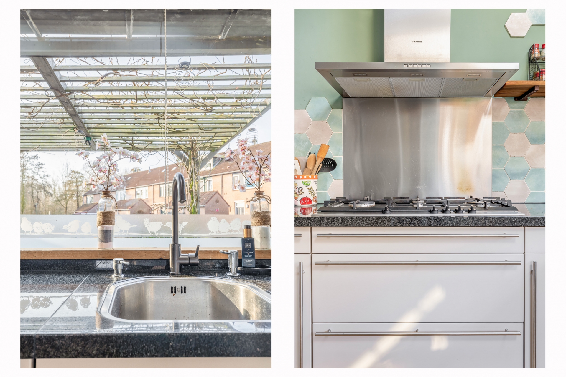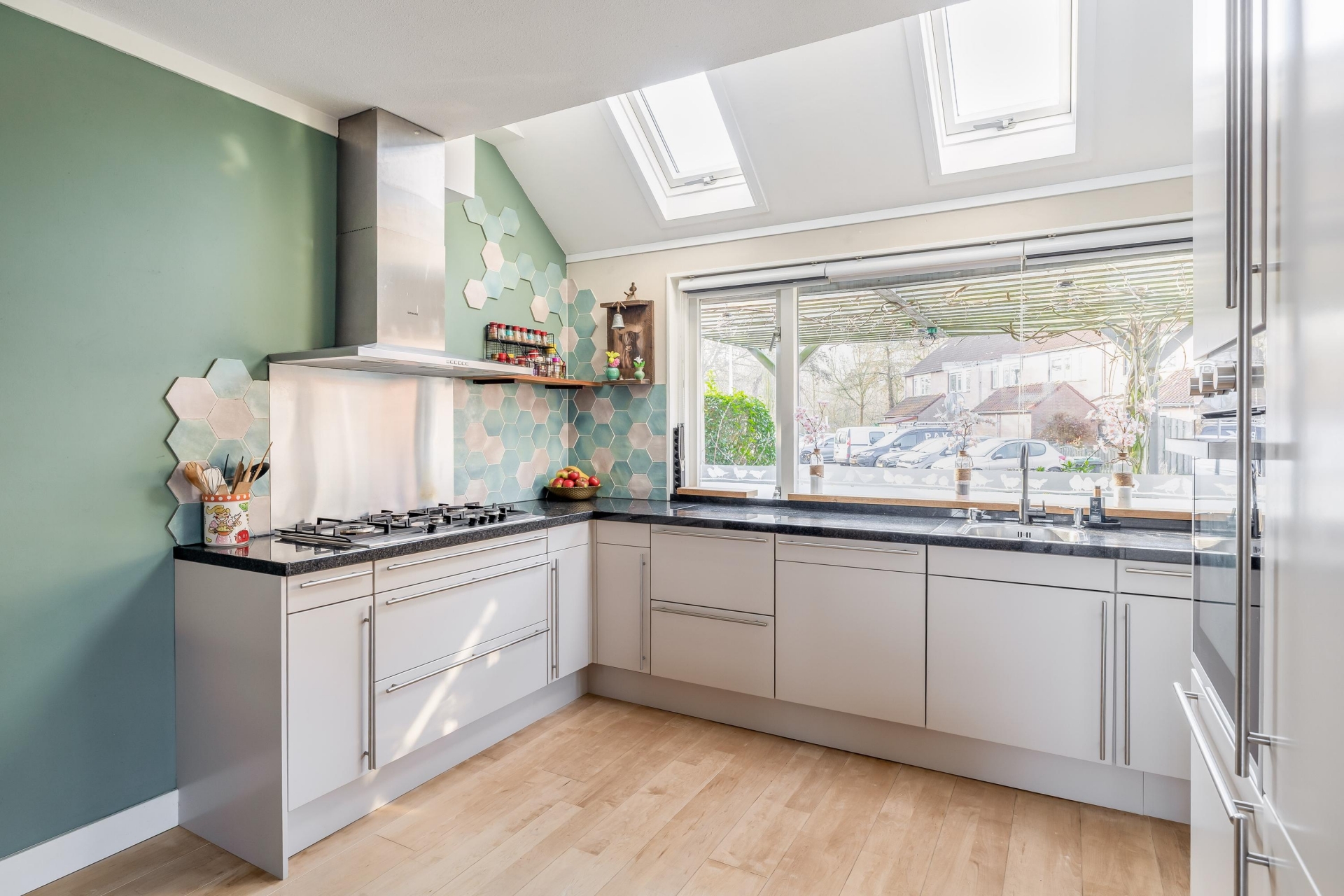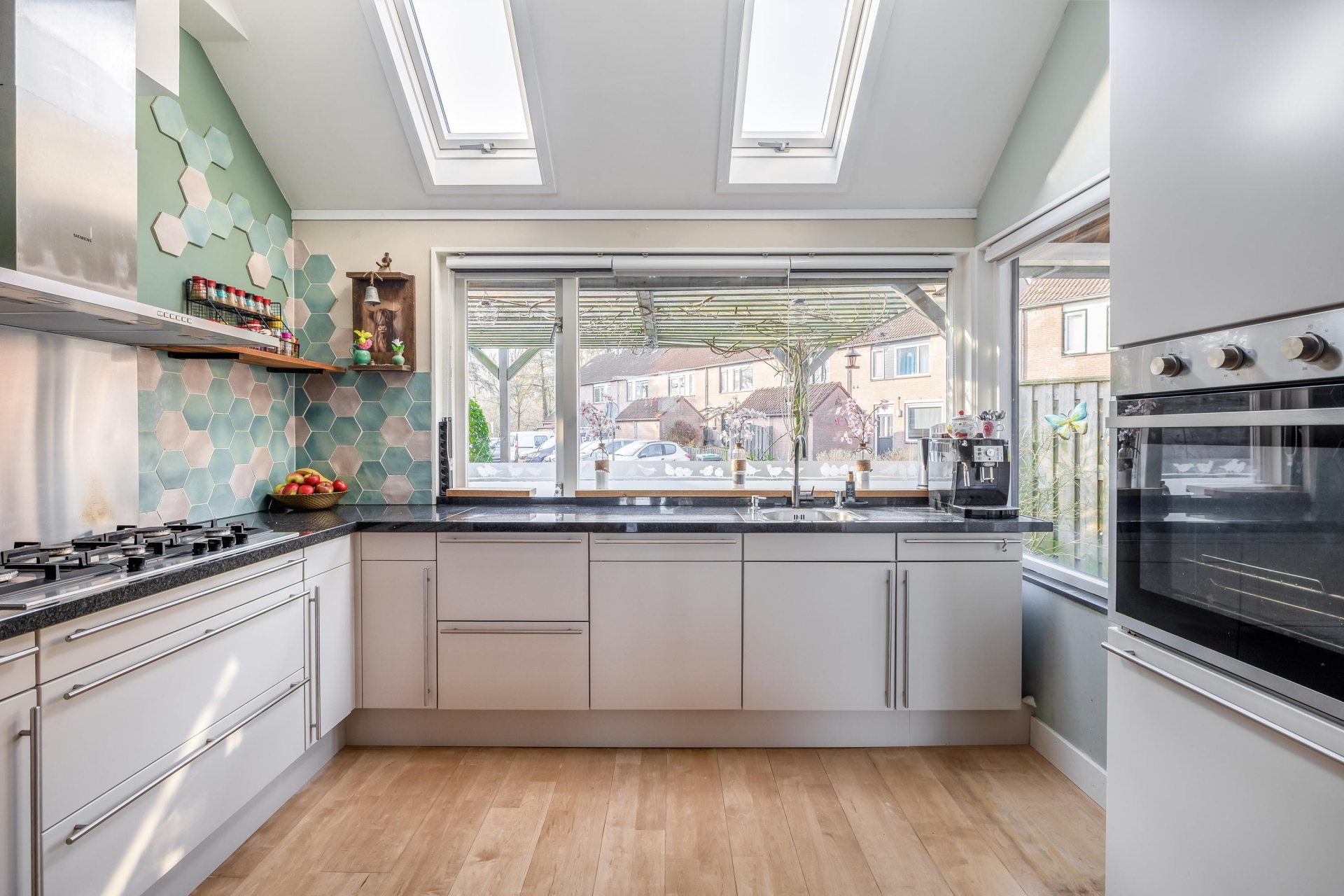 Aan de voorzijde bevindt zich de open keuken. Dankzij de grote ramen en de twee Velux dakramen komt hier veel daglicht naar binnen. De keuken is praktisch ingericht met veel werkruimte en diverse inbouwapparatuur, waardoor koken hier elke dag prettig is. Vanuit de woonkamer stap je via de achterdeur zo de tuin in, waar het buitenleven een verlengstuk wordt van het huis.