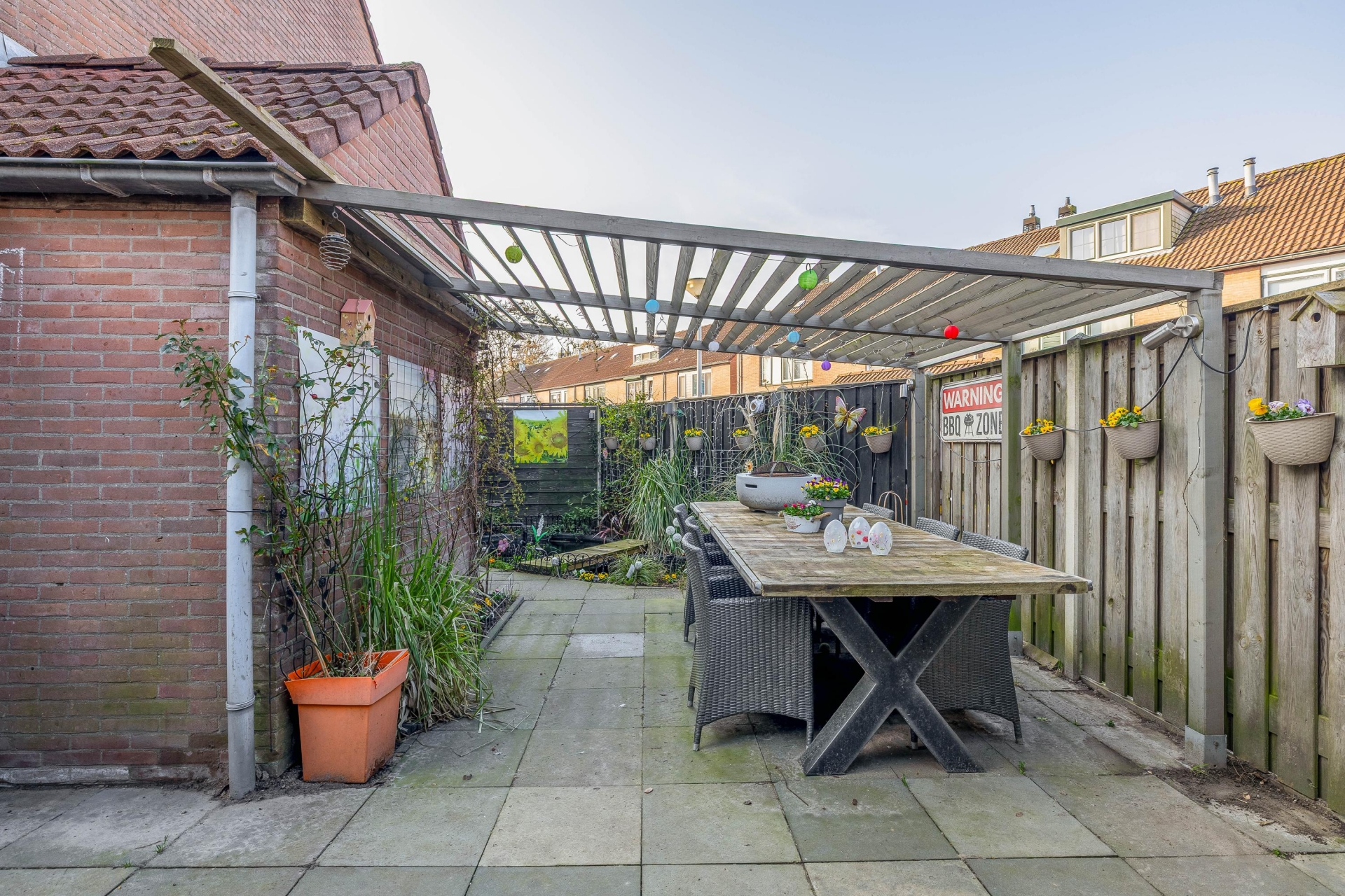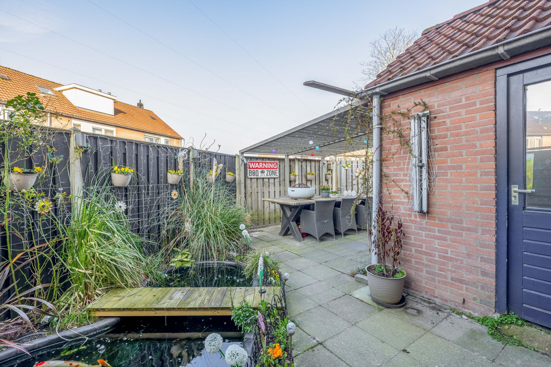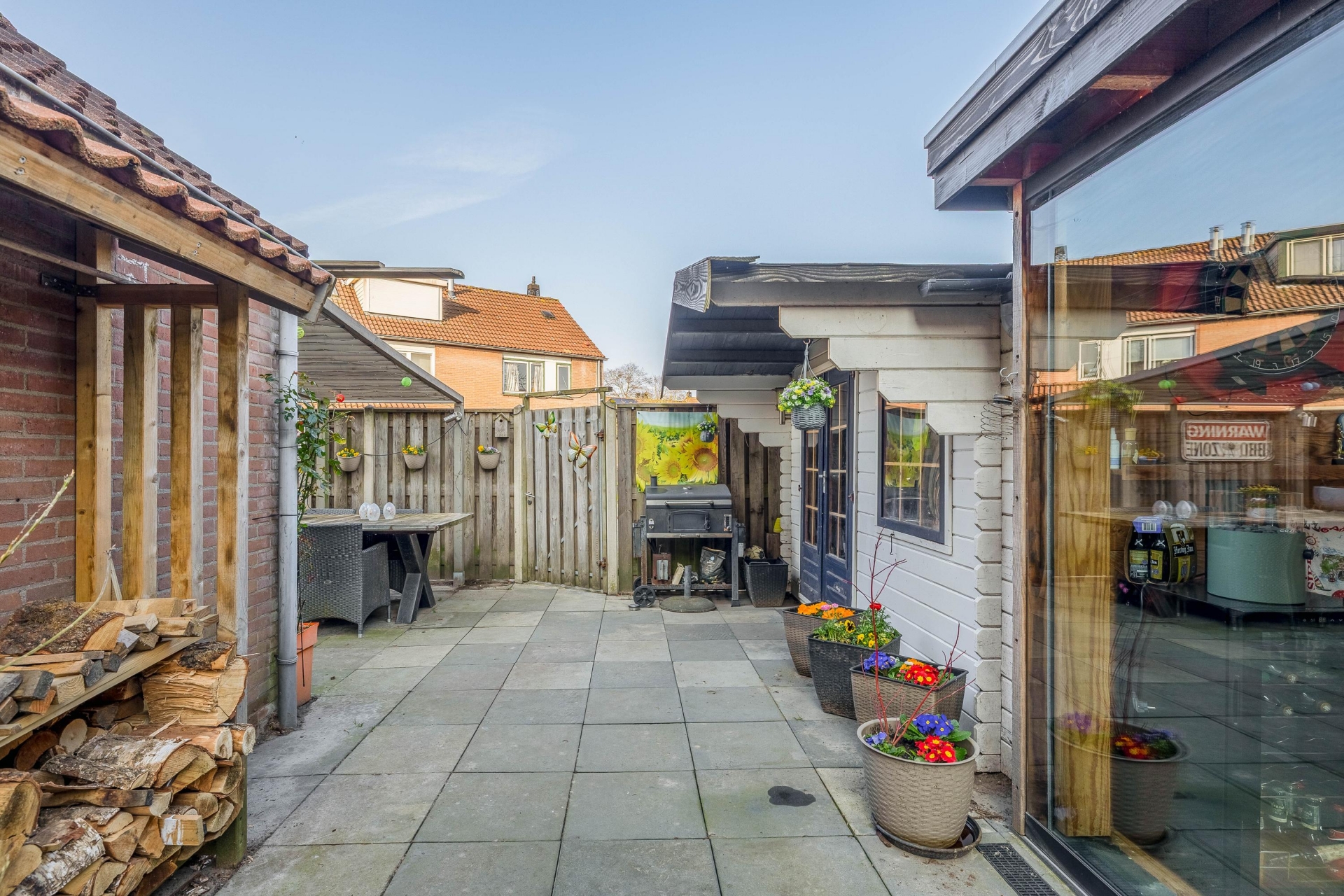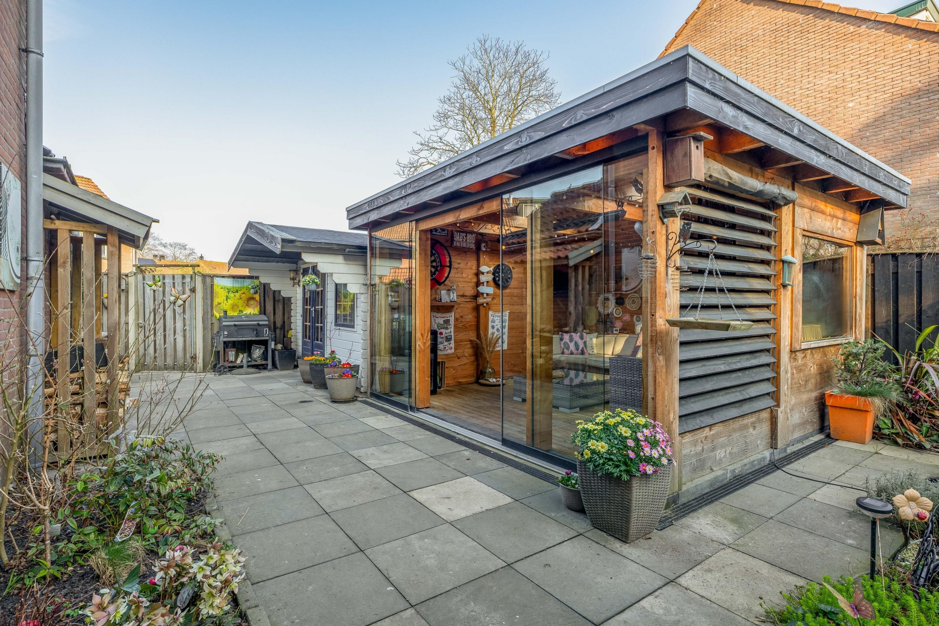 Een echte blikvanger is de vrijstaande houten serre/overkapping uit 2023. Dit is een heerlijke plek om bijna het hele jaar door te genieten. Met de glazen schuifpanelen kun je de ruimte afsluiten, waardoor je hier ook op frisse dagen comfortabel zit. Ideaal voor lange zomeravonden, een gezellige borrel met vrienden of gewoon een rustig moment met een kop koffie.