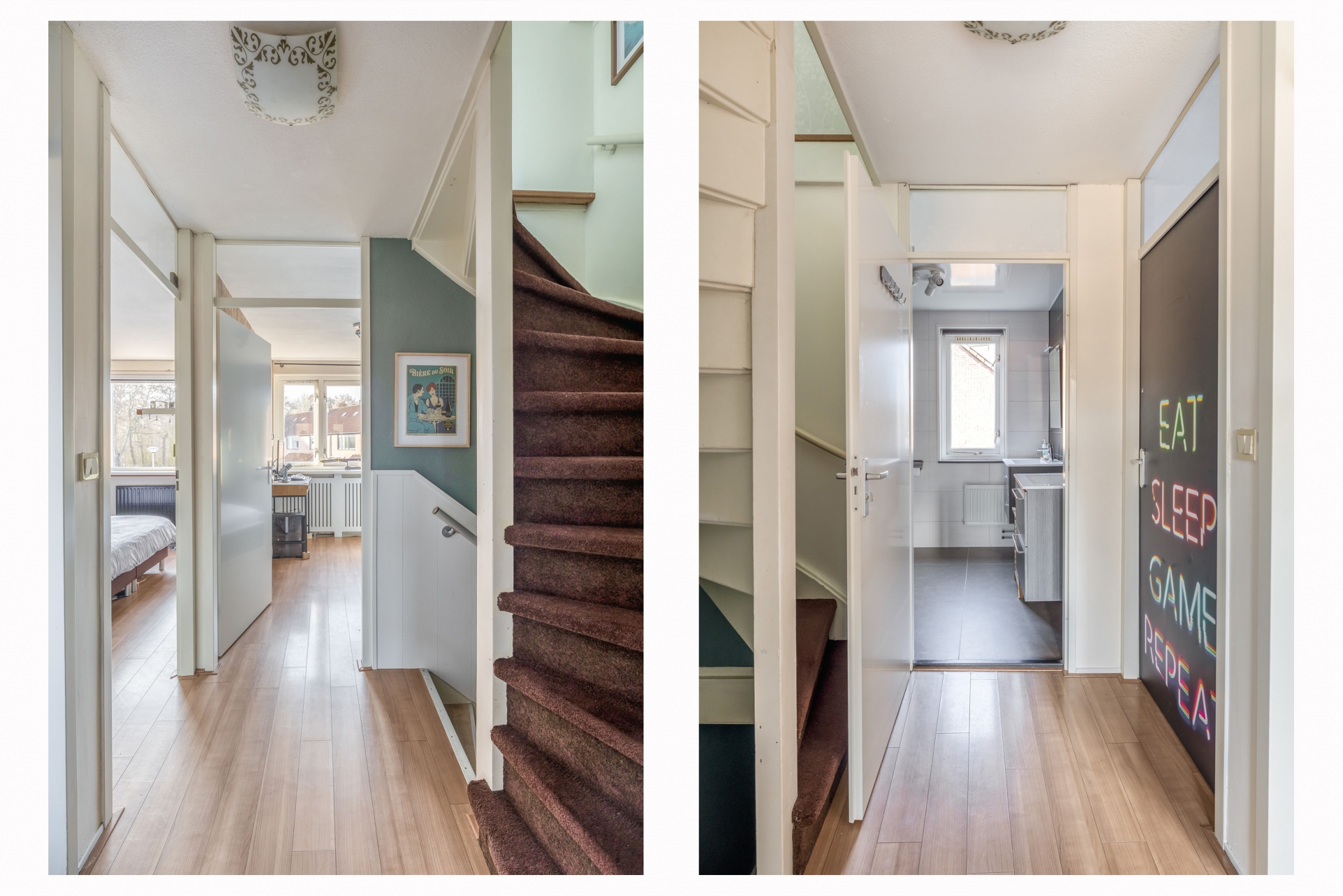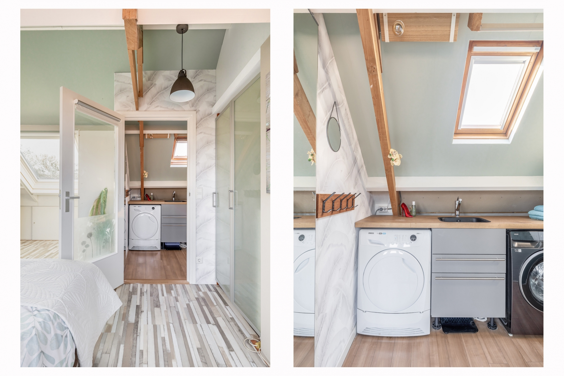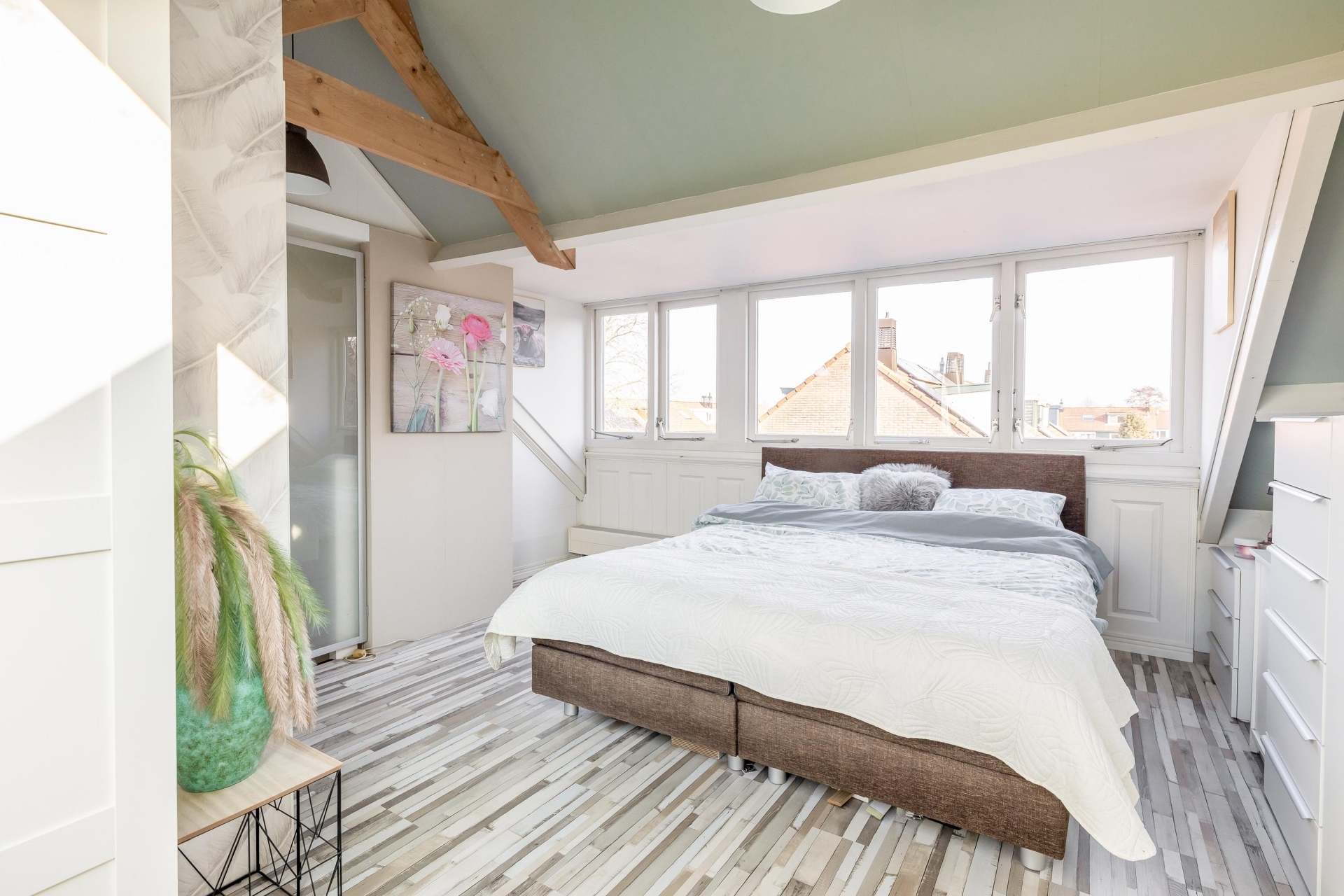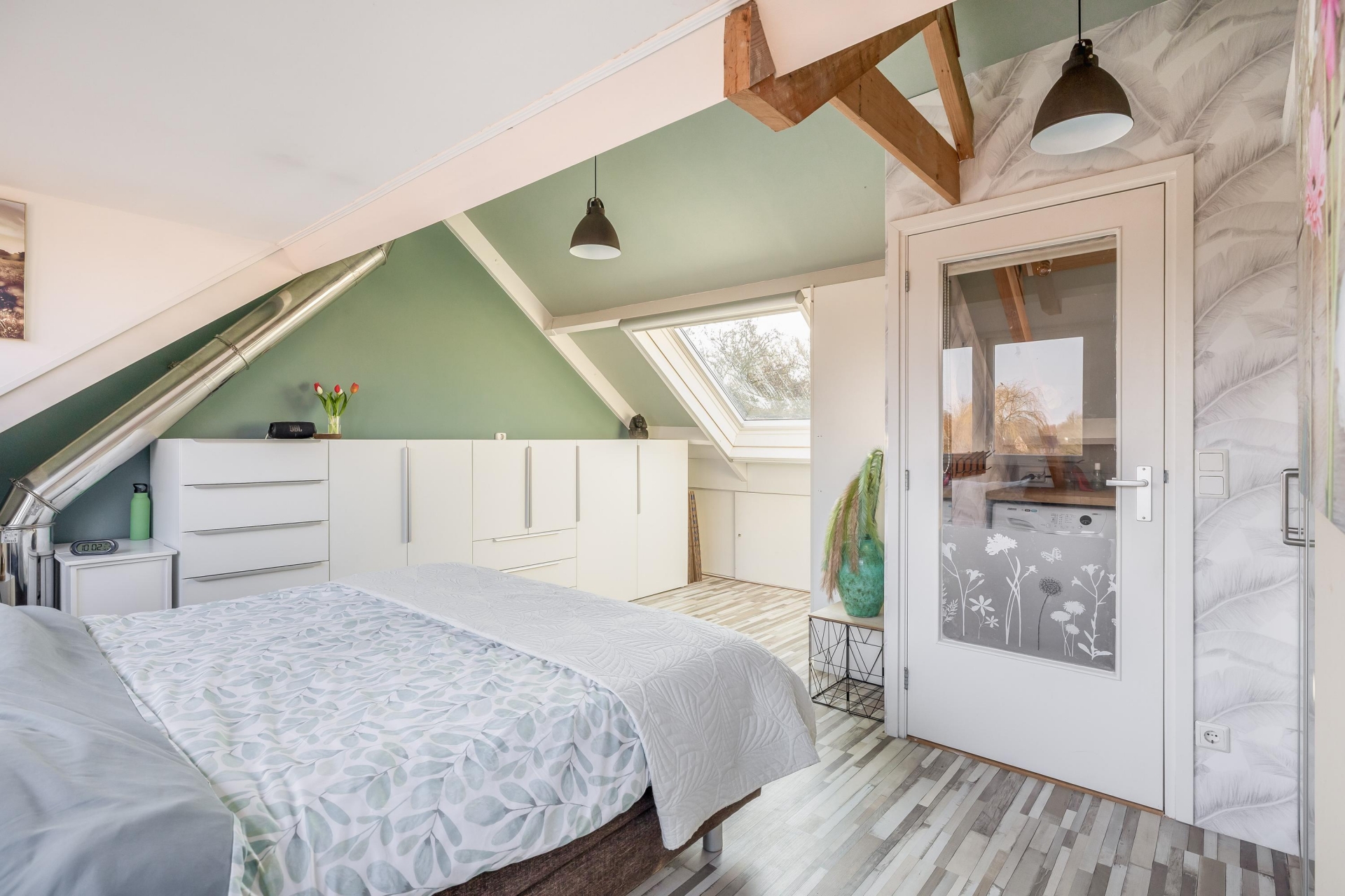 Via de vaste trap bereik je de tweede verdieping. Hier bevindt zich een royale vierde slaapkamer met dakkapel. Door de schuine kap, zichtbare balken en het daglicht heeft deze ruimte een sfeervolle uitstraling. Op deze verdieping is daarnaast een praktische wasruimte met aansluiting voor wasmachine en droger en extra bergruimte.