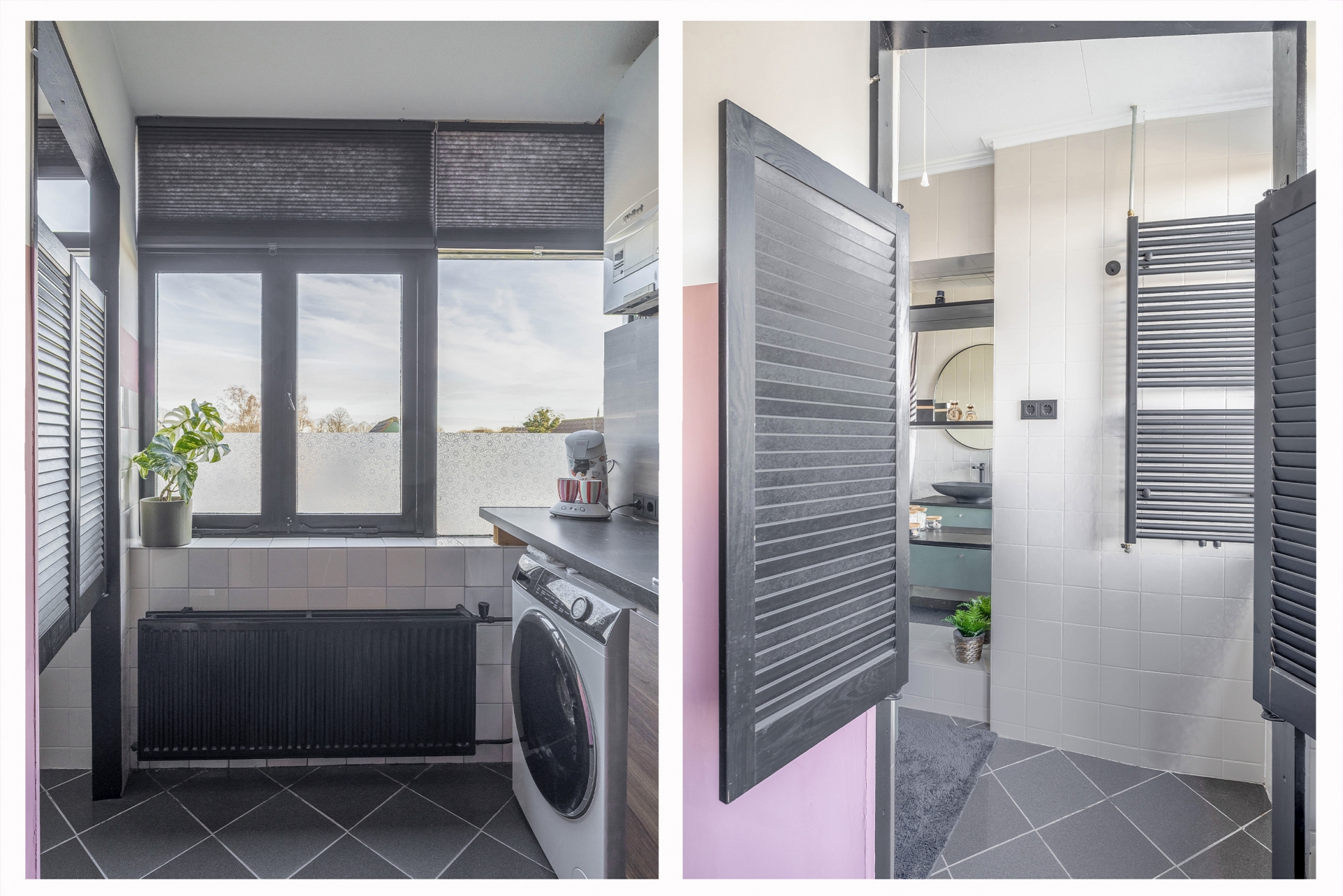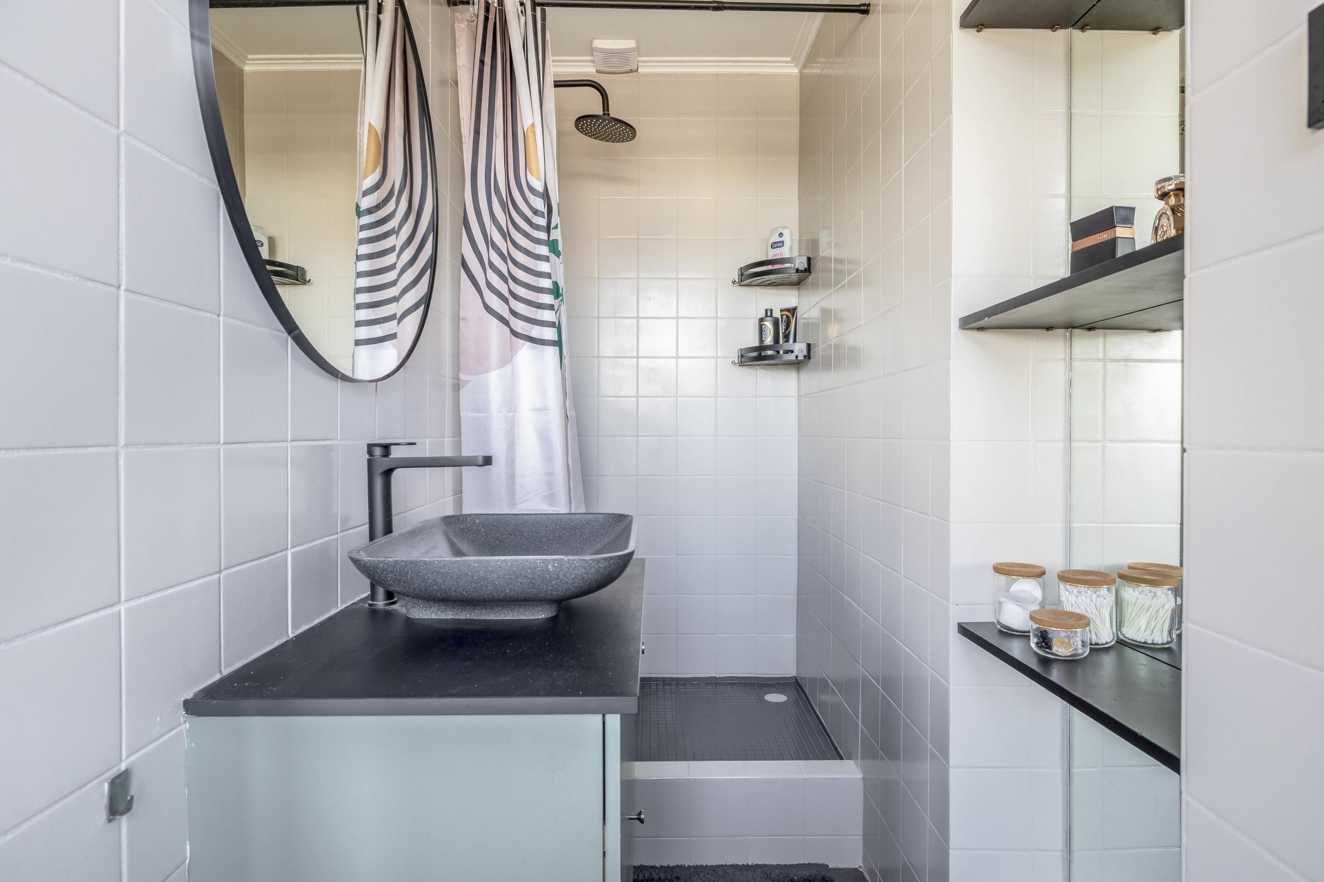 De volledig betegelde badkamer (ca. 3 m²), eveneens vergroot, straalt rust en frisheid uit dankzij de lichte kleurstelling. Uitgerust met een vaste wastafel en een comfortabele douchehoek, biedt deze ruimte alle luxe voor een ontspannen start van de dag.