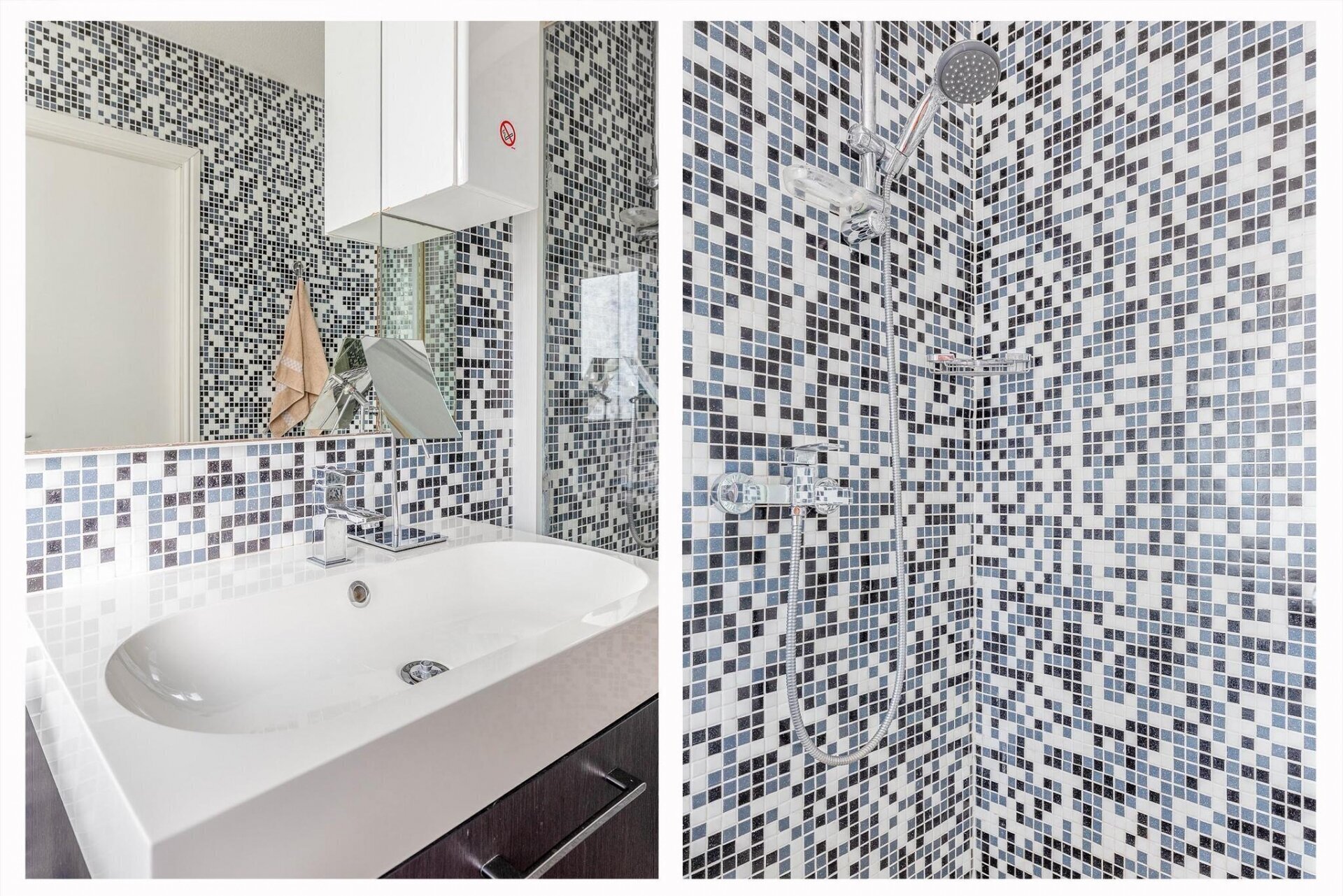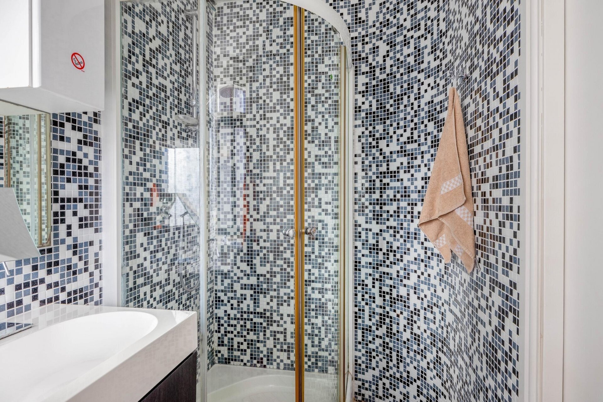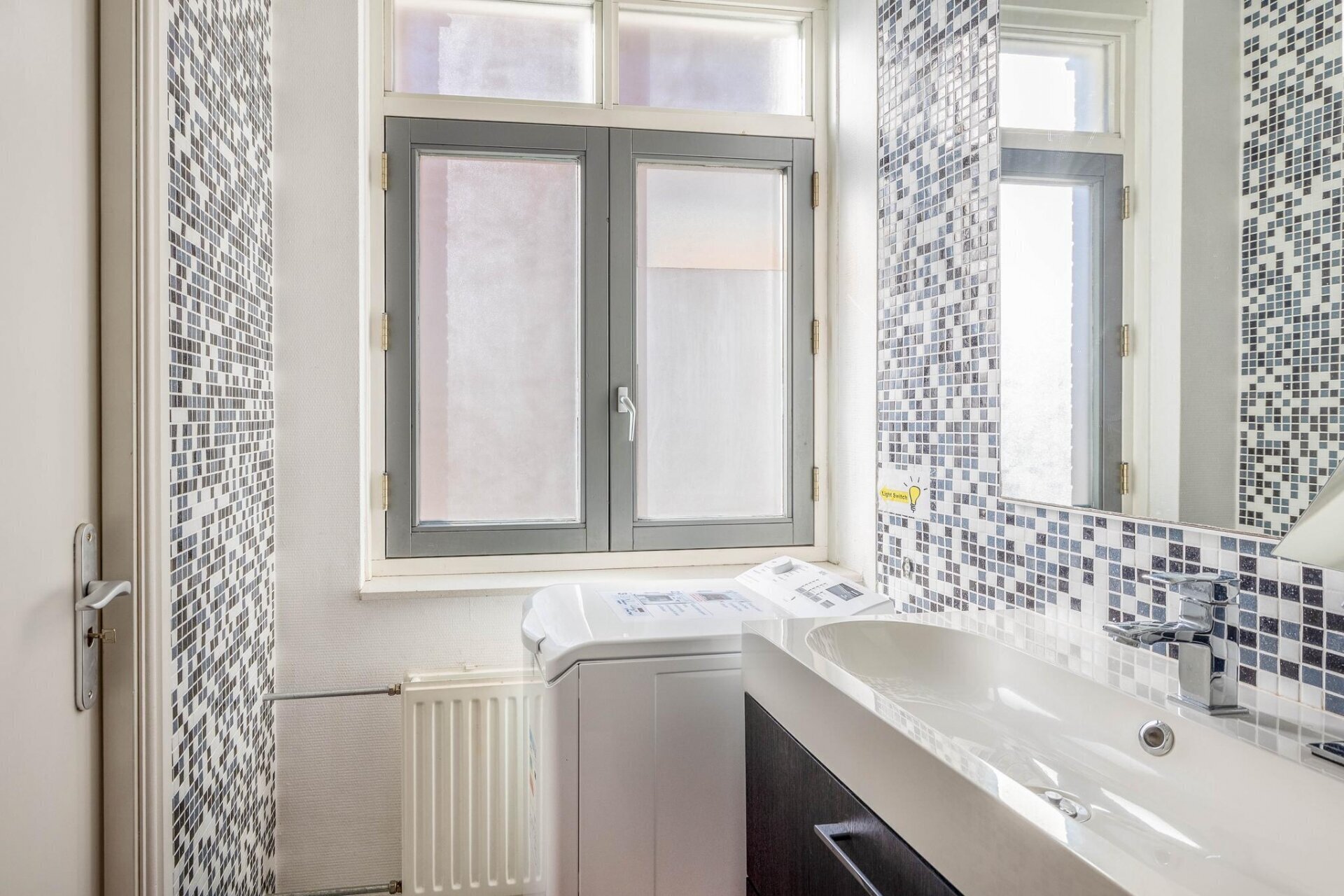 • Een badkamer met douche, wastafel en aansluiting voor een wasmachine.