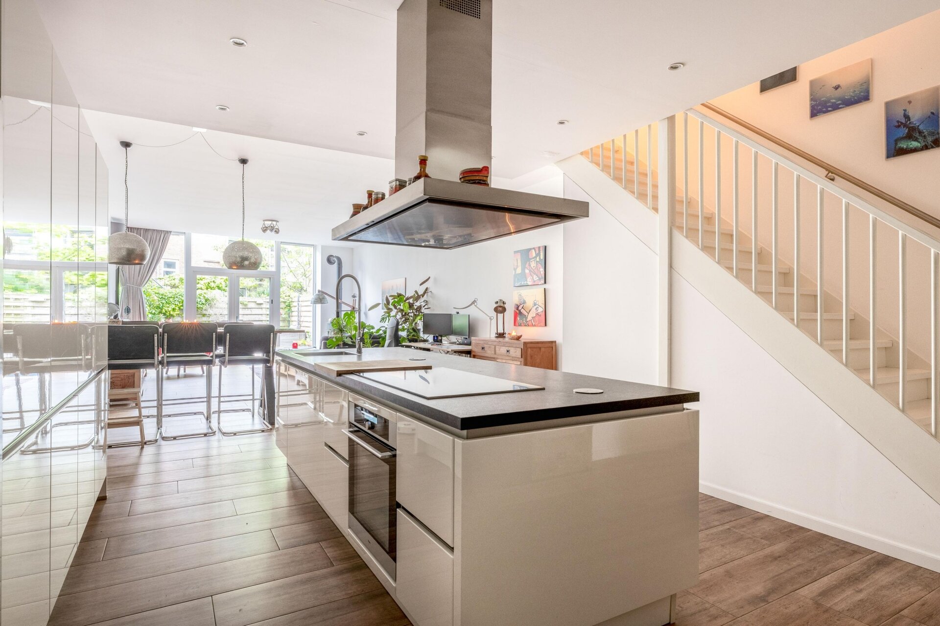 De begane grond biedt een indrukwekkende leefruimte waar alles samenkomt. De hoge plafonds en grote raampartijen zorgen voor een enorme ruimtelijke beleving. De woonkamer is ruim opgezet en sfeervol ingericht, met directe toegang tot de tuin via openslaande deuren. De open keuken met kookeiland is niet alleen een lust voor het oog, maar ook bijzonder praktisch ingedeeld. Er is volop kastruimte en hoogwaardige inbouwapparatuur aanwezig. Hier kook je met gemak voor vrienden of geniet je juist in alle rust van een doordeweeks diner. De woning heeft een warme en uitnodigende sfeer die je direct bij binnenkomst voelt.