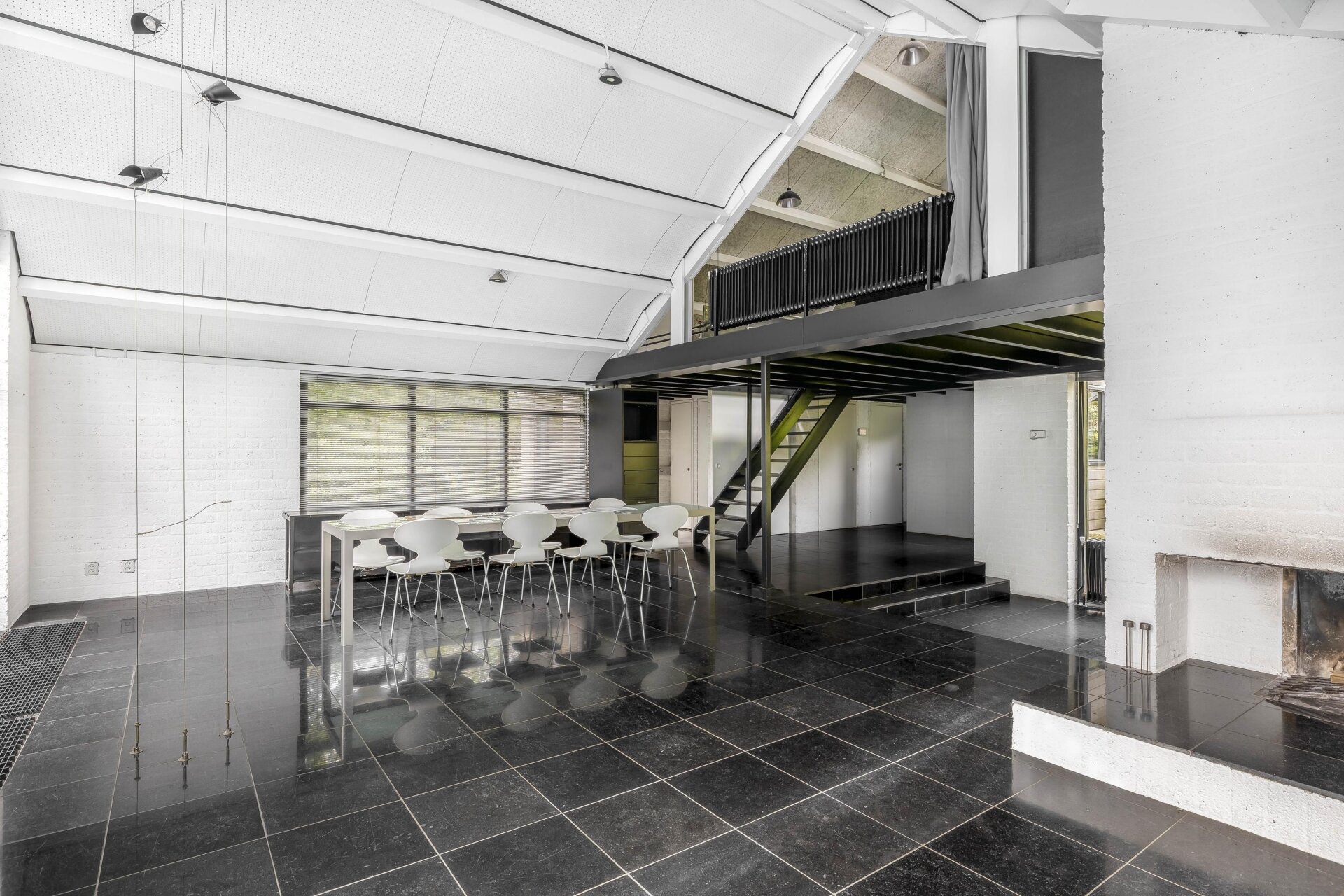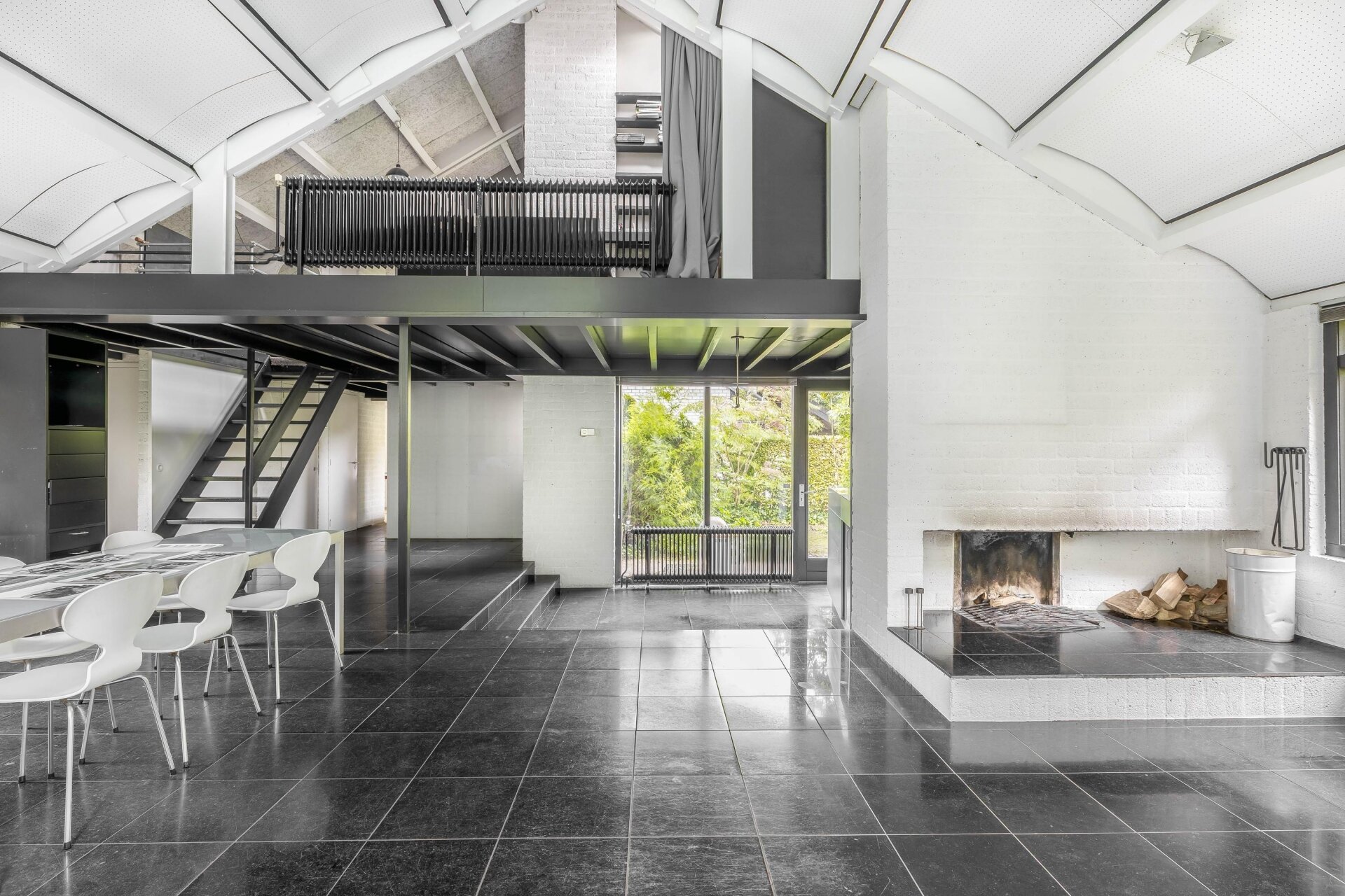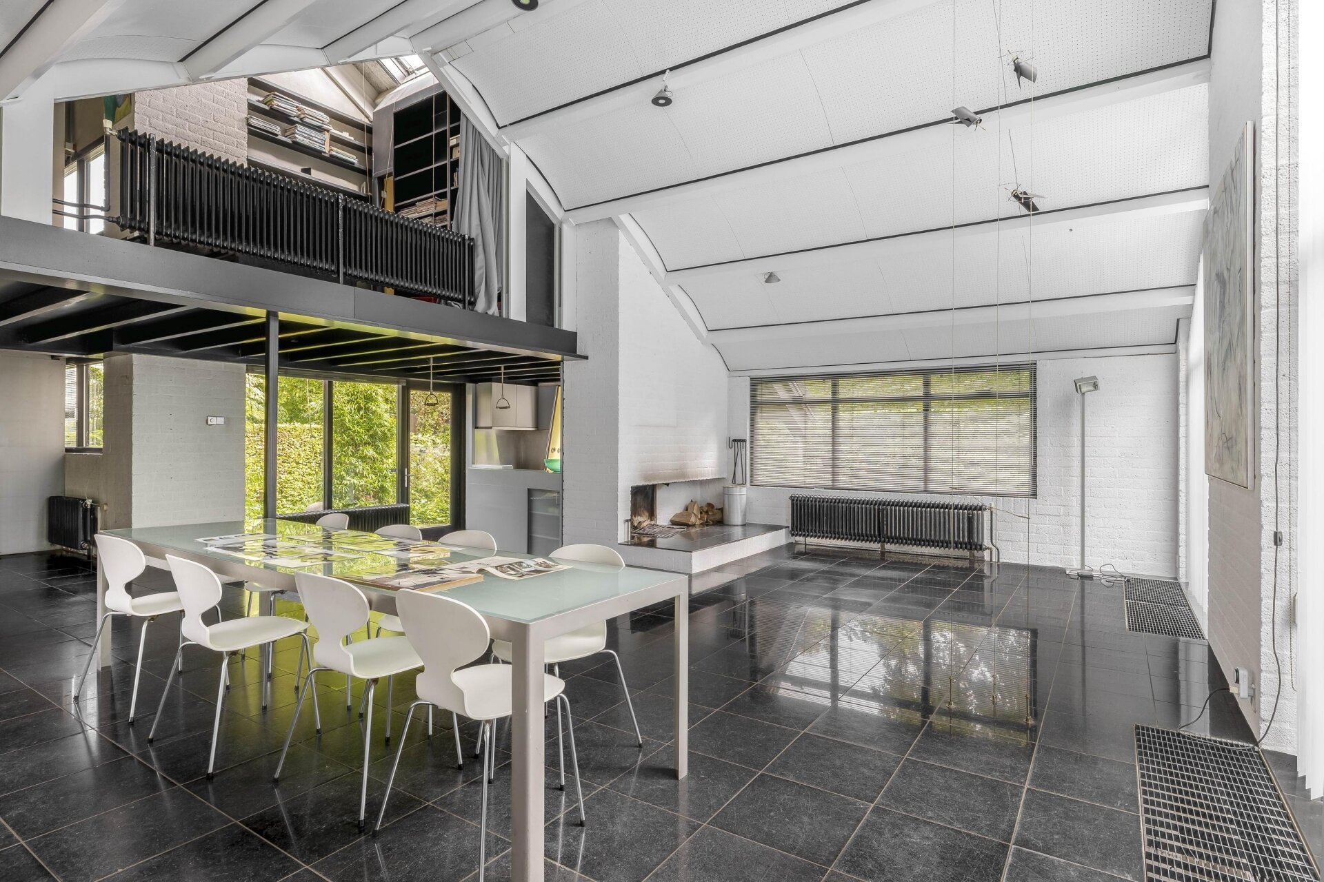 Entree met royale hal, garderobe, meterkast en toiletruimte. De lichte woonkamer is voorzien van hoge plafonds van circa 5,50 m, grote raampartijen en dubbele openslaande deuren naar het eerste terras en de groene tuin. Een open haard en een vide met open trap naar de eerste verdieping geven de leefruimte een unieke uitstraling.