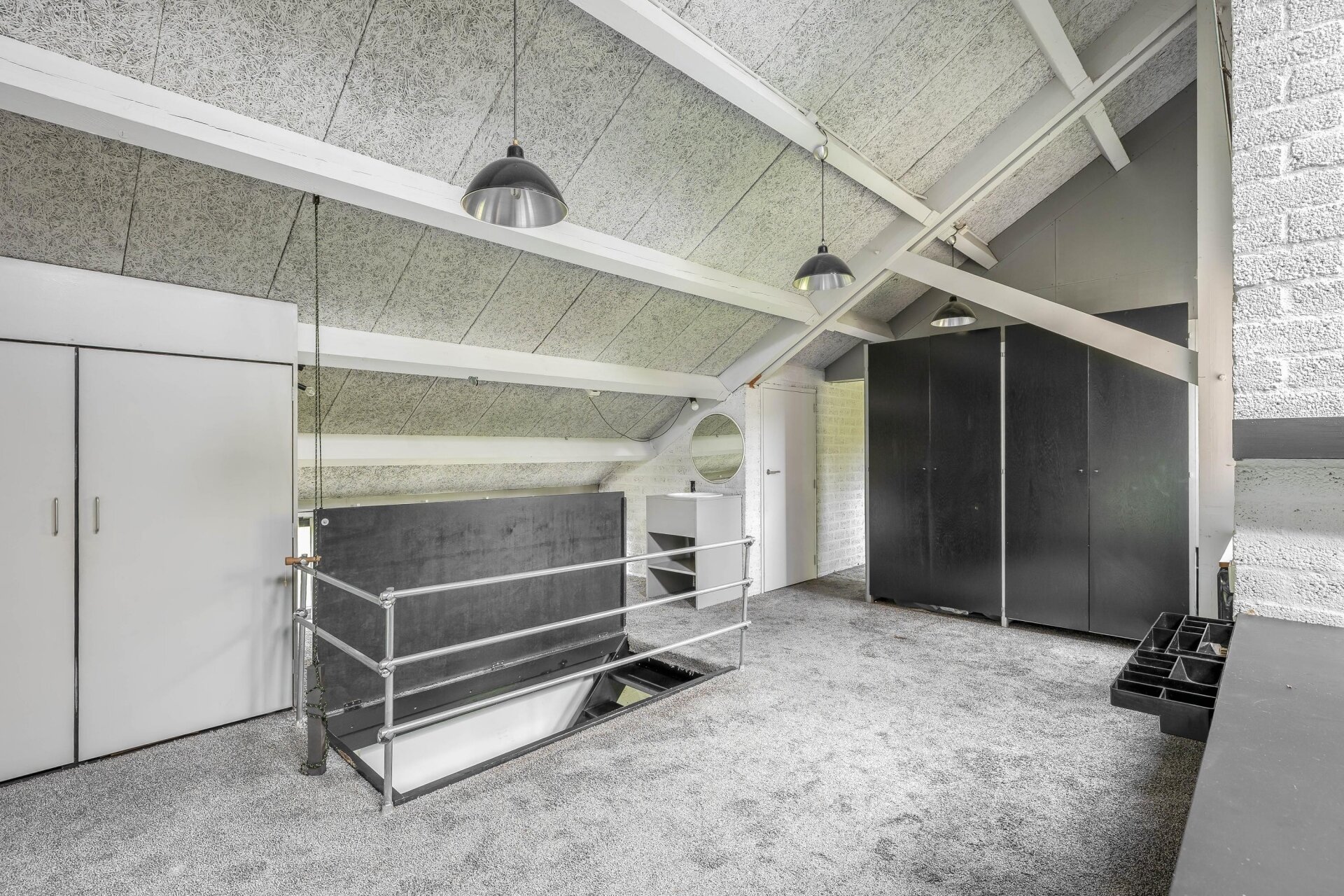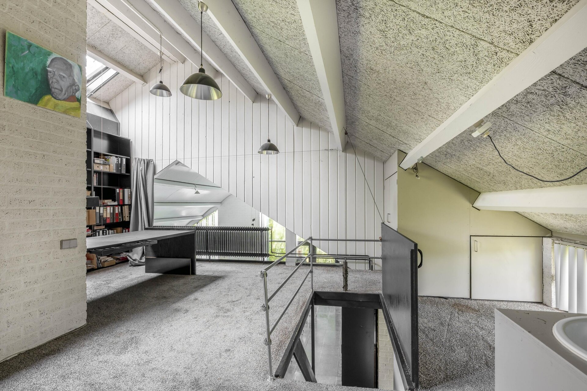 Een speels ingedeelde verdieping met vide en zicht op de woonkamer. Toegang tot de tweede en derde slaapkamer en de stookruimte met opstelplaats voor de CV-ketel.