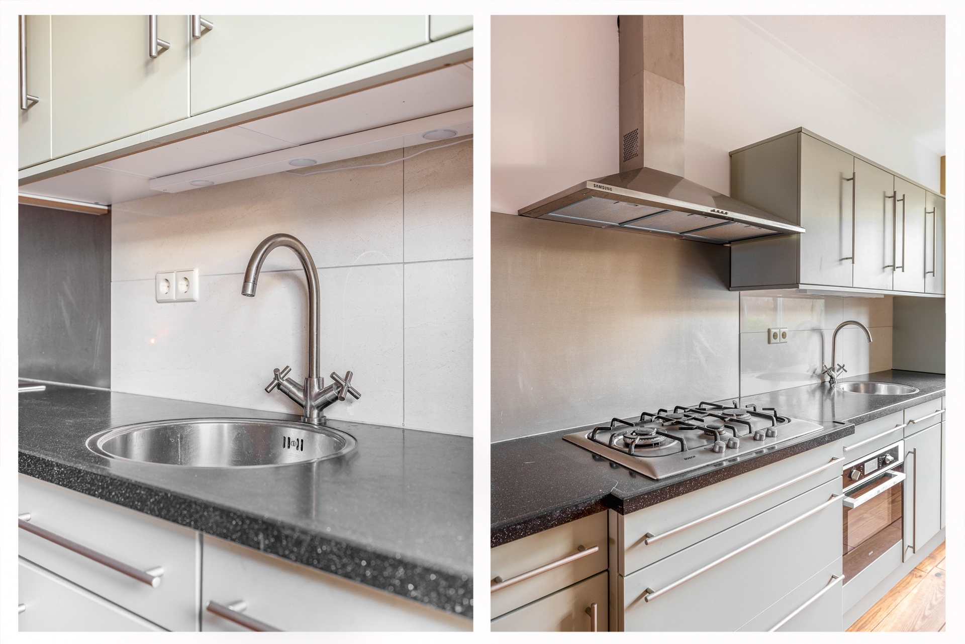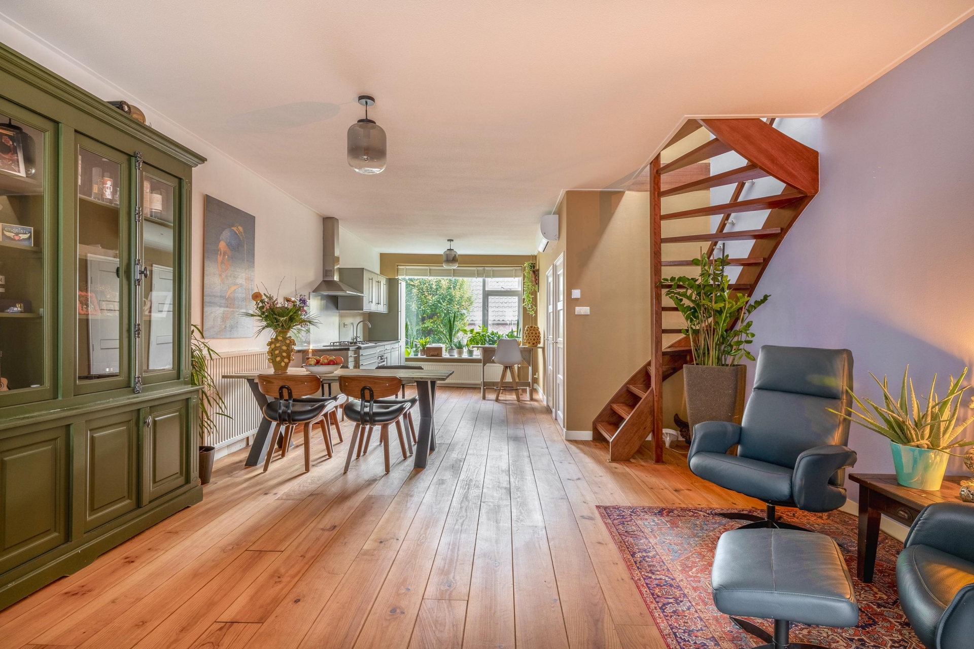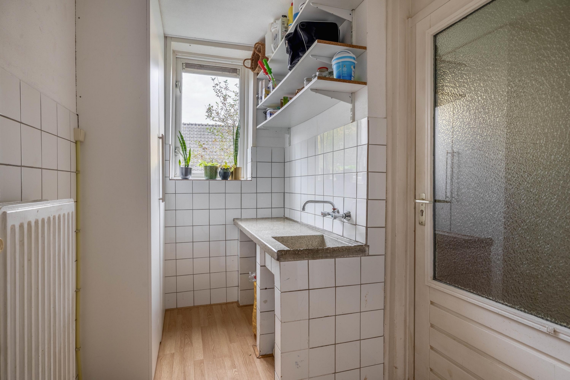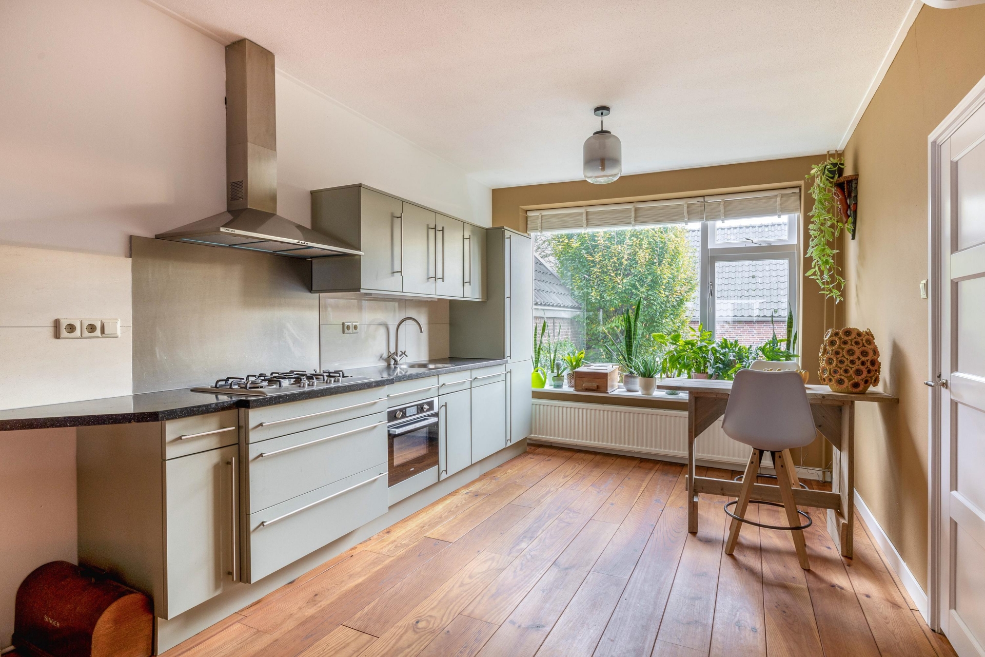 Aan de achterzijde ligt de keuken, die ruim is opgezet en voldoende plek biedt voor een eethoek. Vanuit hier kijk je mooi de tuin in, wat het een fijne plek maakt om te koken en tegelijk contact te houden met buiten. De indeling is praktisch en biedt volop mogelijkheden om deze ruimte eventueel verder te moderniseren of anders in te delen.