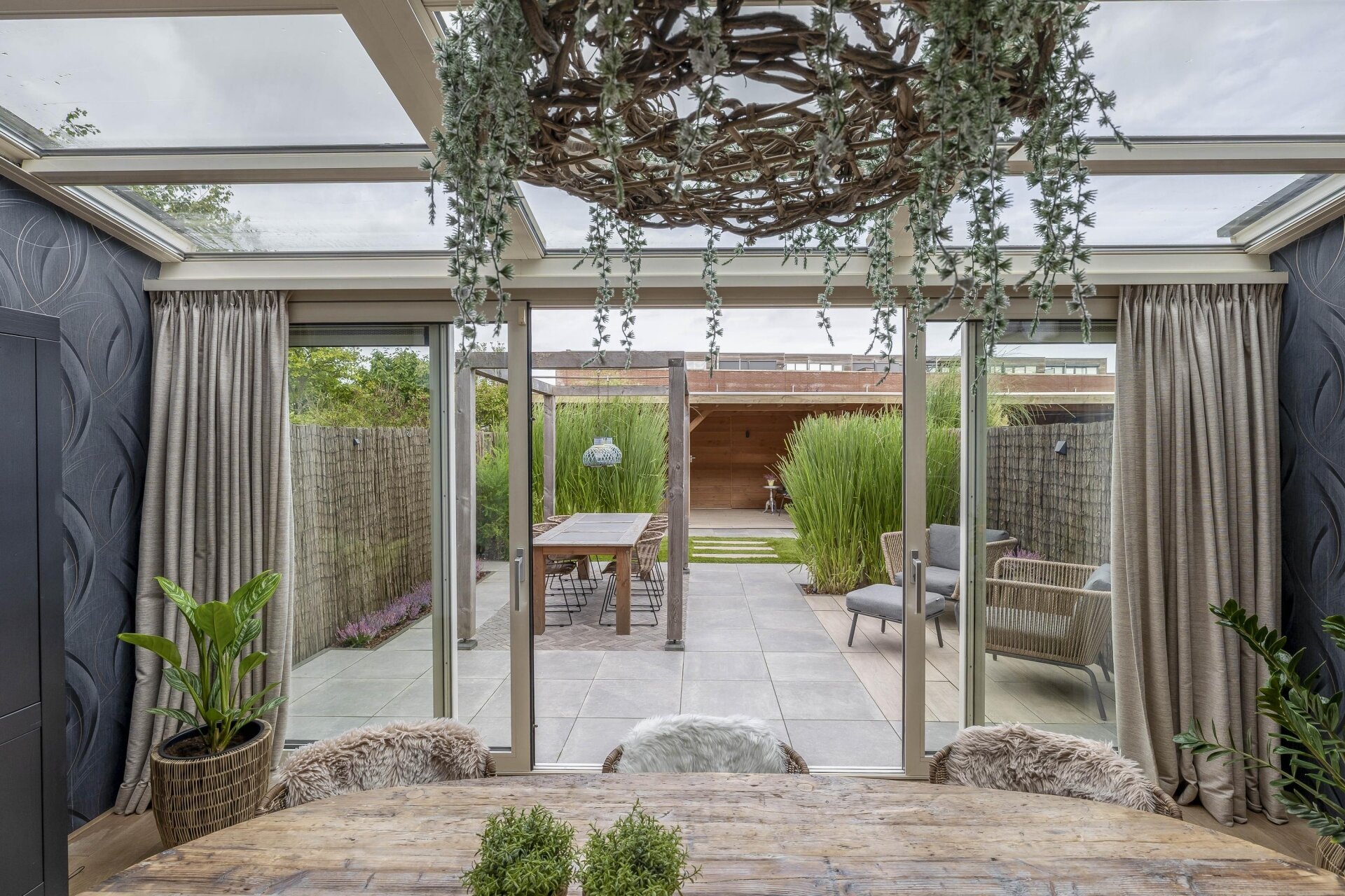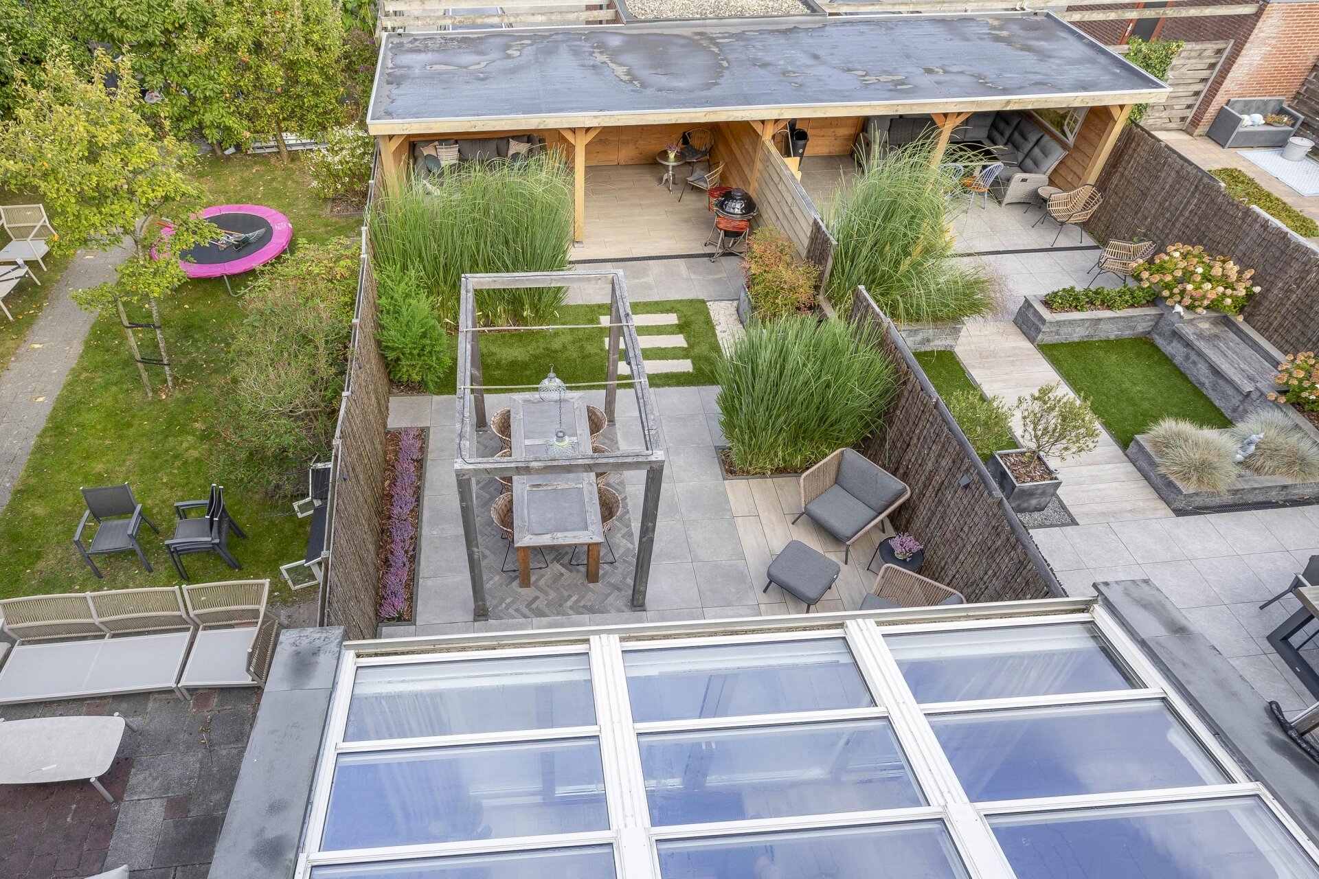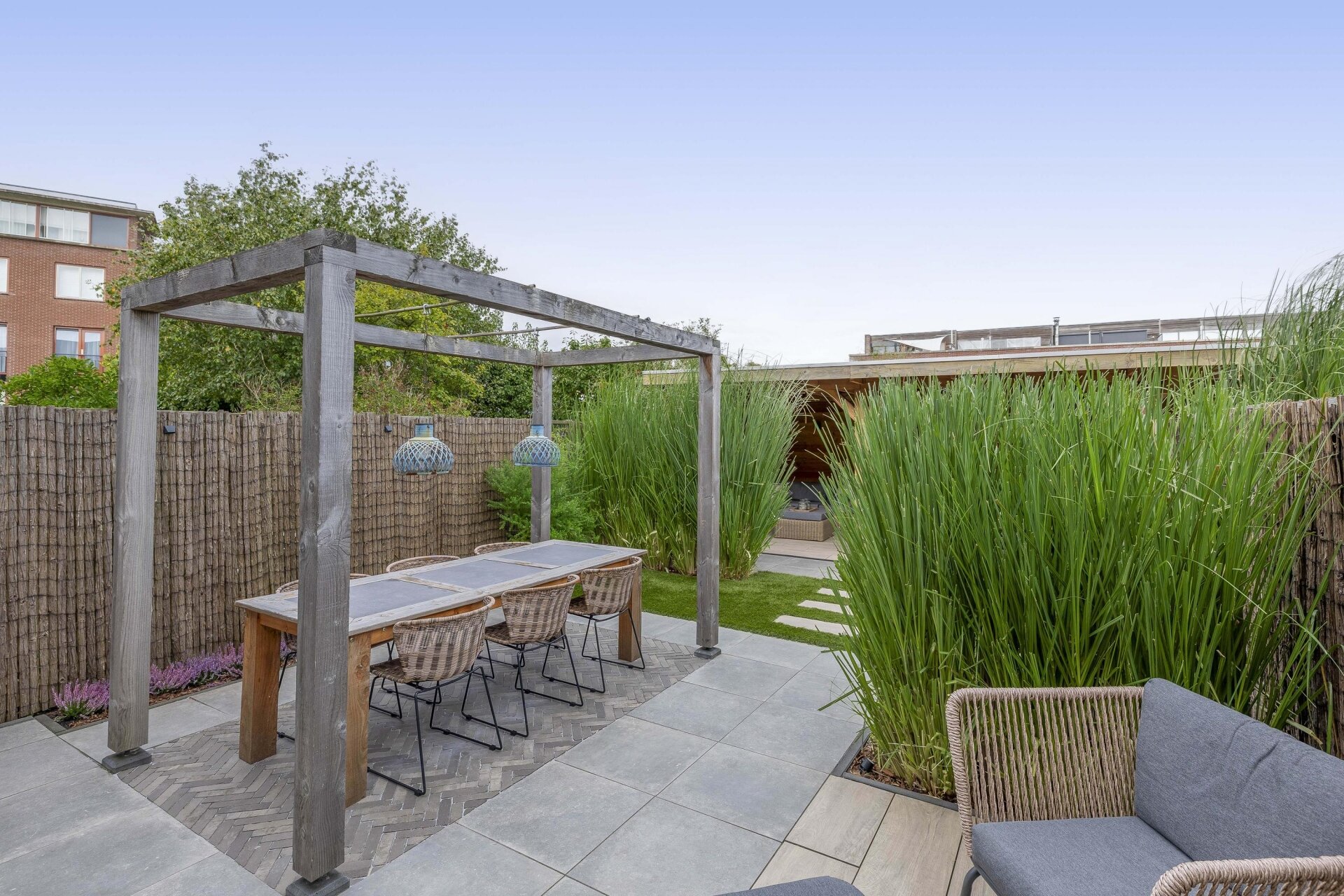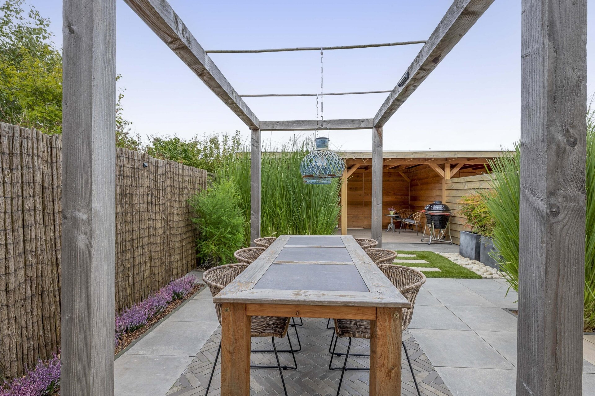 De achtertuin is strak en onder architectuur aangelegd met grote tegels, kunstgras en gezellige zithoeken, waaronder een sfeervolle houten overkapping. Dankzij de ligging op het west/noordwesten zit je hier 's middags en 's avonds heerlijk in de zon. Ook is er genoeg ruimte voor een speelhoek of lounge set.