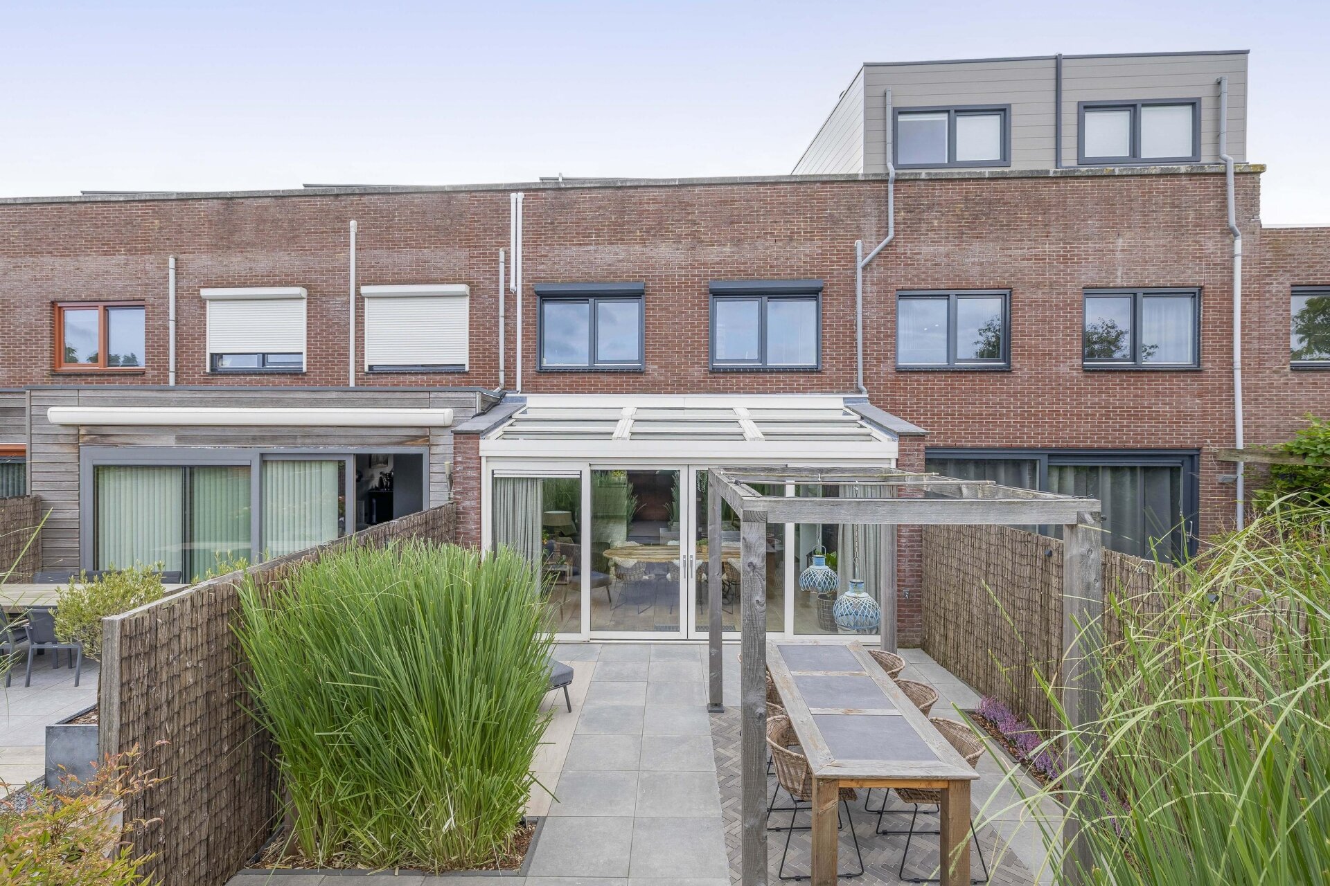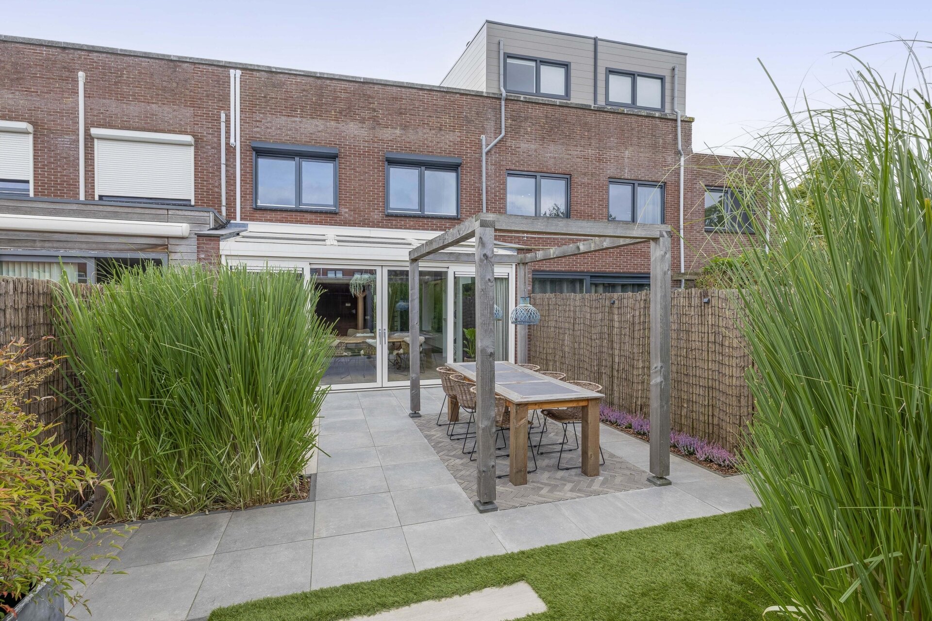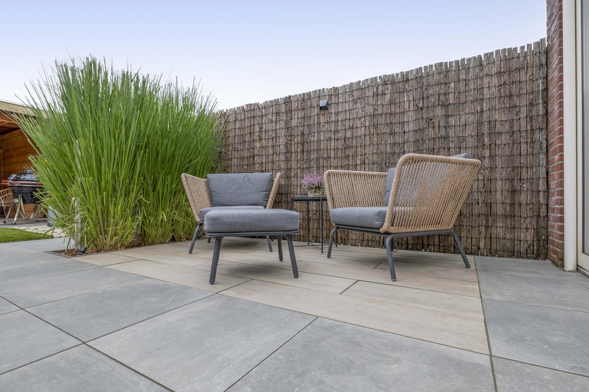 De achtertuin is strak en onder architectuur aangelegd met grote tegels, kunstgras en gezellige zithoeken, waaronder een sfeervolle houten overkapping. Dankzij de ligging op het west/noordwesten zit je hier 's middags en 's avonds heerlijk in de zon. Ook is er genoeg ruimte voor een speelhoek of lounge set.