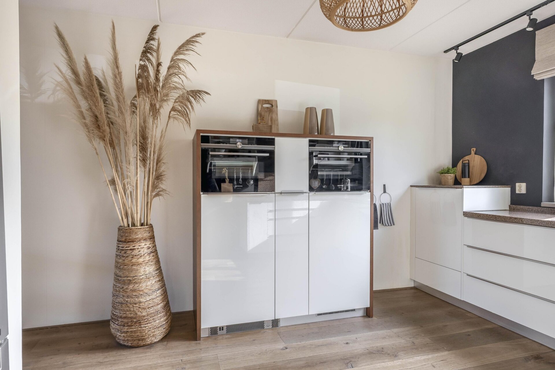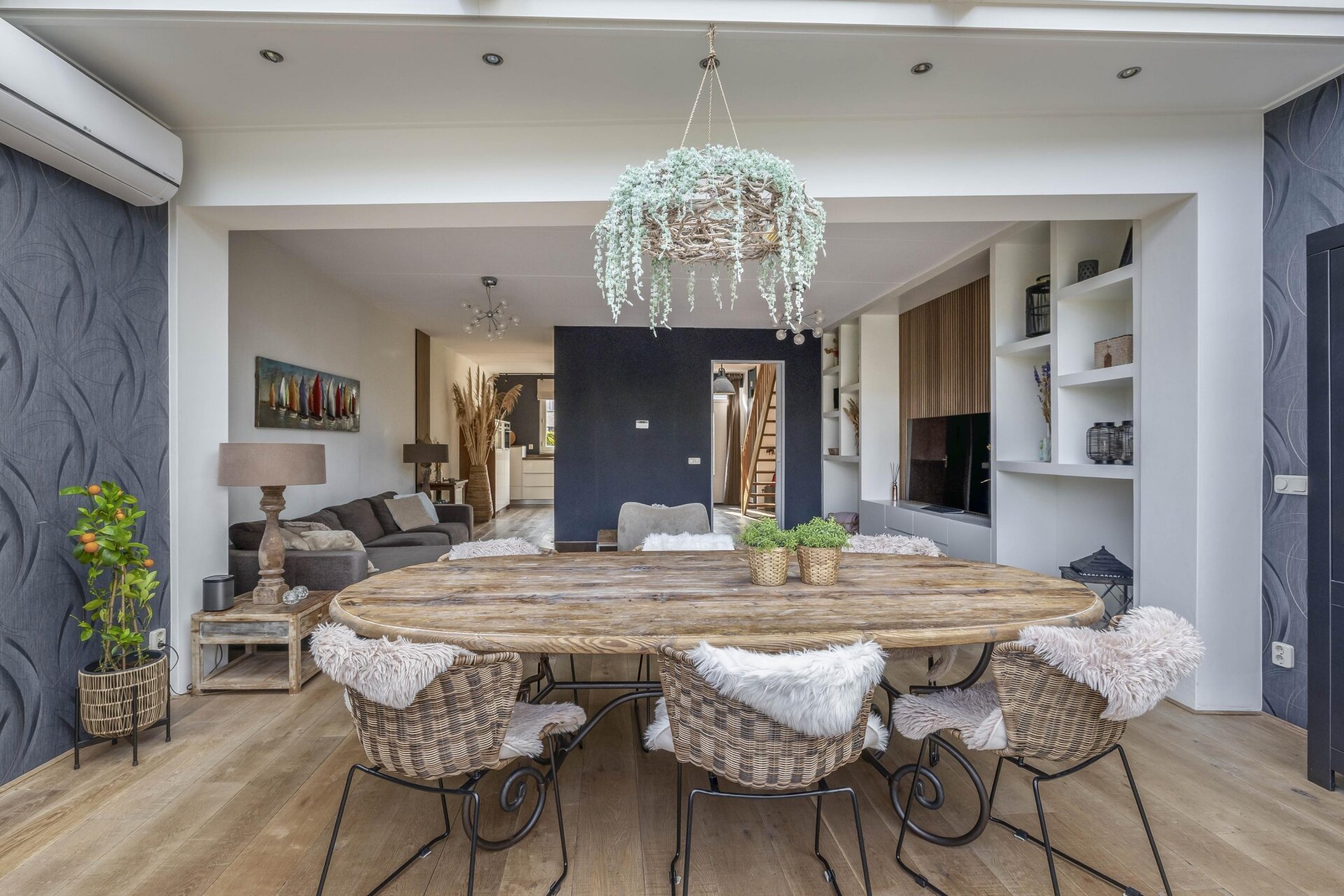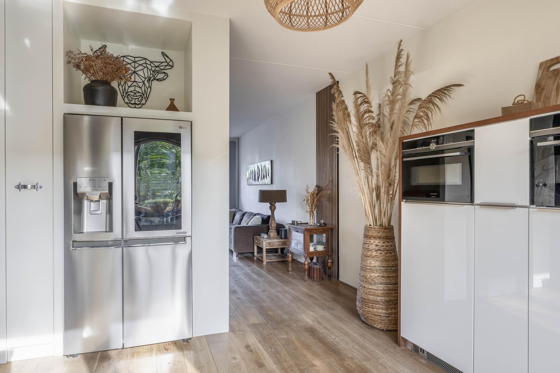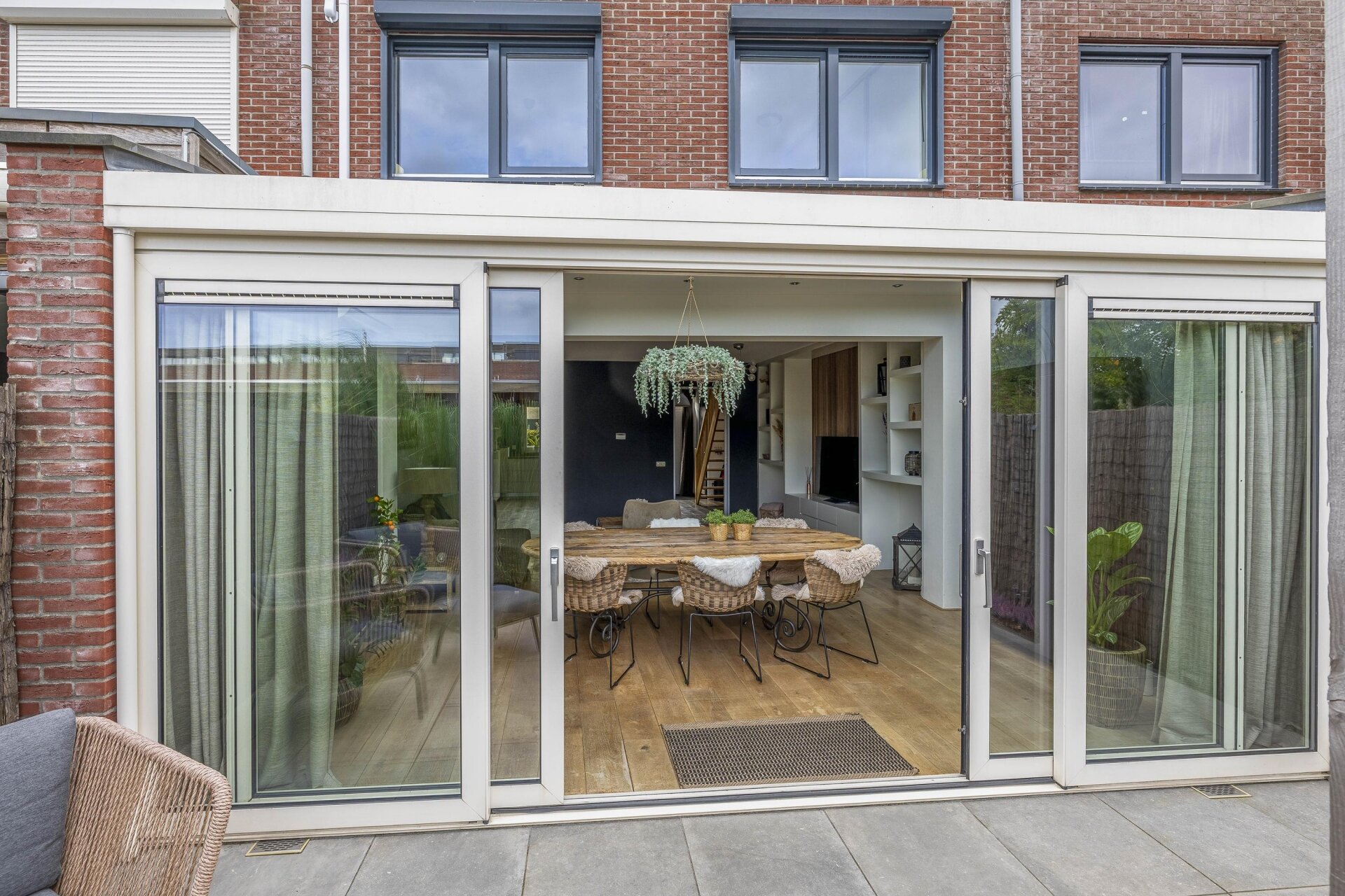 De achtertuin is strak en onder architectuur aangelegd met grote tegels, kunstgras en gezellige zithoeken, waaronder een sfeervolle houten overkapping. Dankzij de ligging op het west/noordwesten zit je hier 's middags en 's avonds heerlijk in de zon. Ook is er genoeg ruimte voor een speelhoek of lounge set.