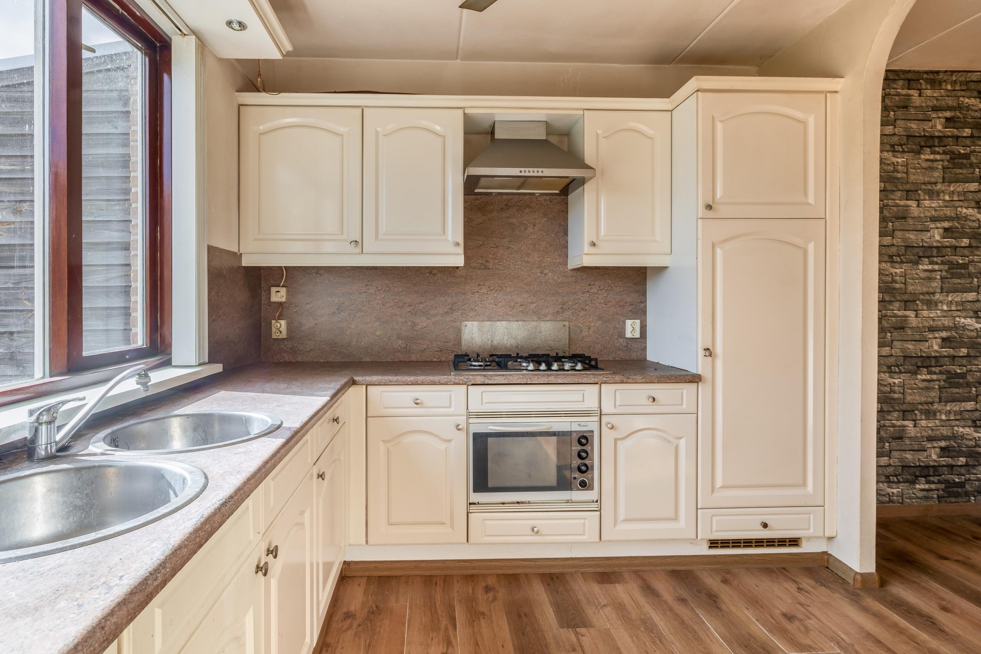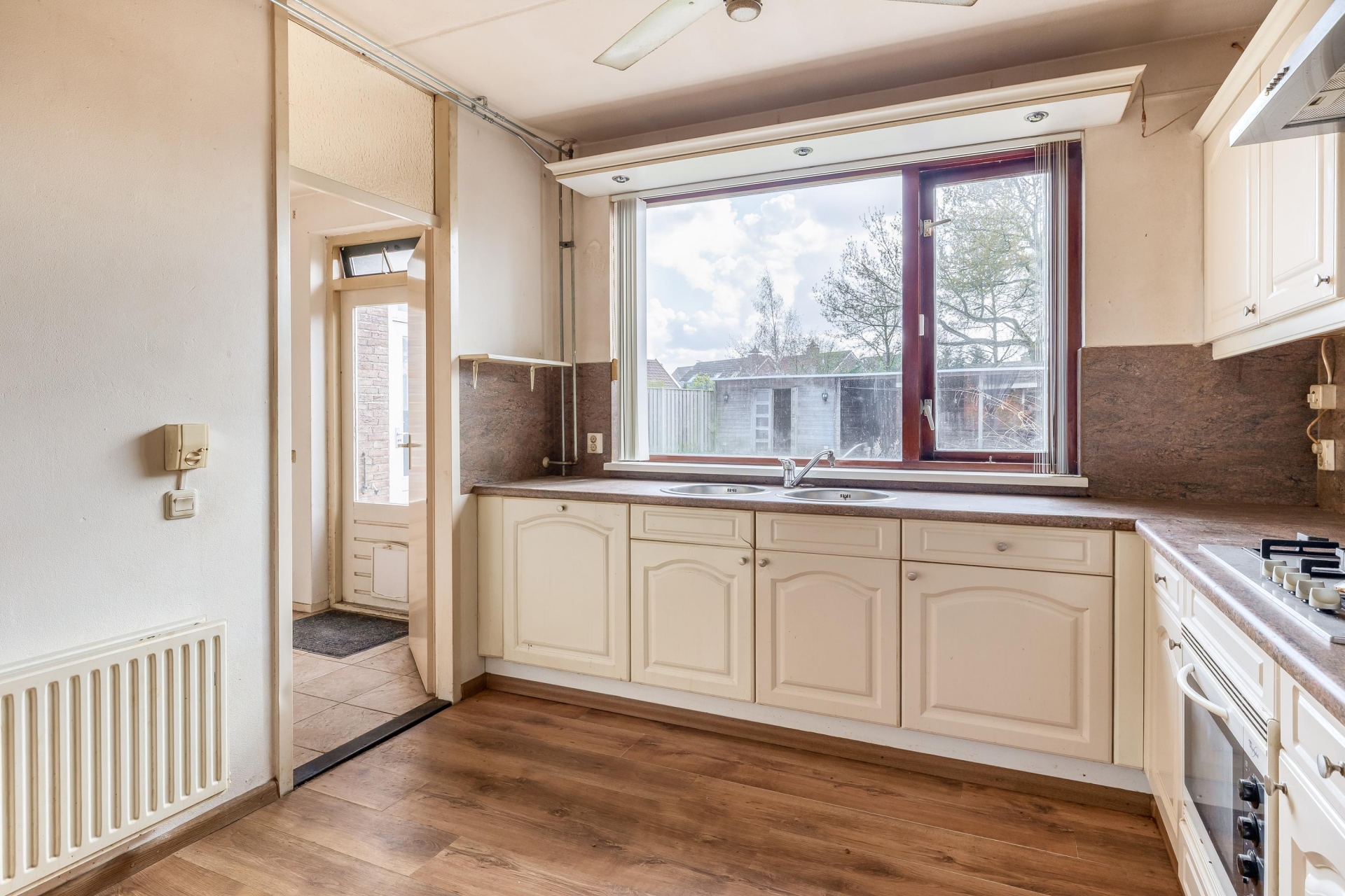 Aan de achterzijde bevindt zich de keuken, met zicht op de tuin. De keuken is functioneel en biedt voldoende kastruimte en werkblad, maar hier ligt ook een mooie kans om het geheel naar eigen smaak te moderniseren. Zie je het al voor je? Een open keuken of een moderne leefkeuken die helemaal aansluit op jouw woonwensen.