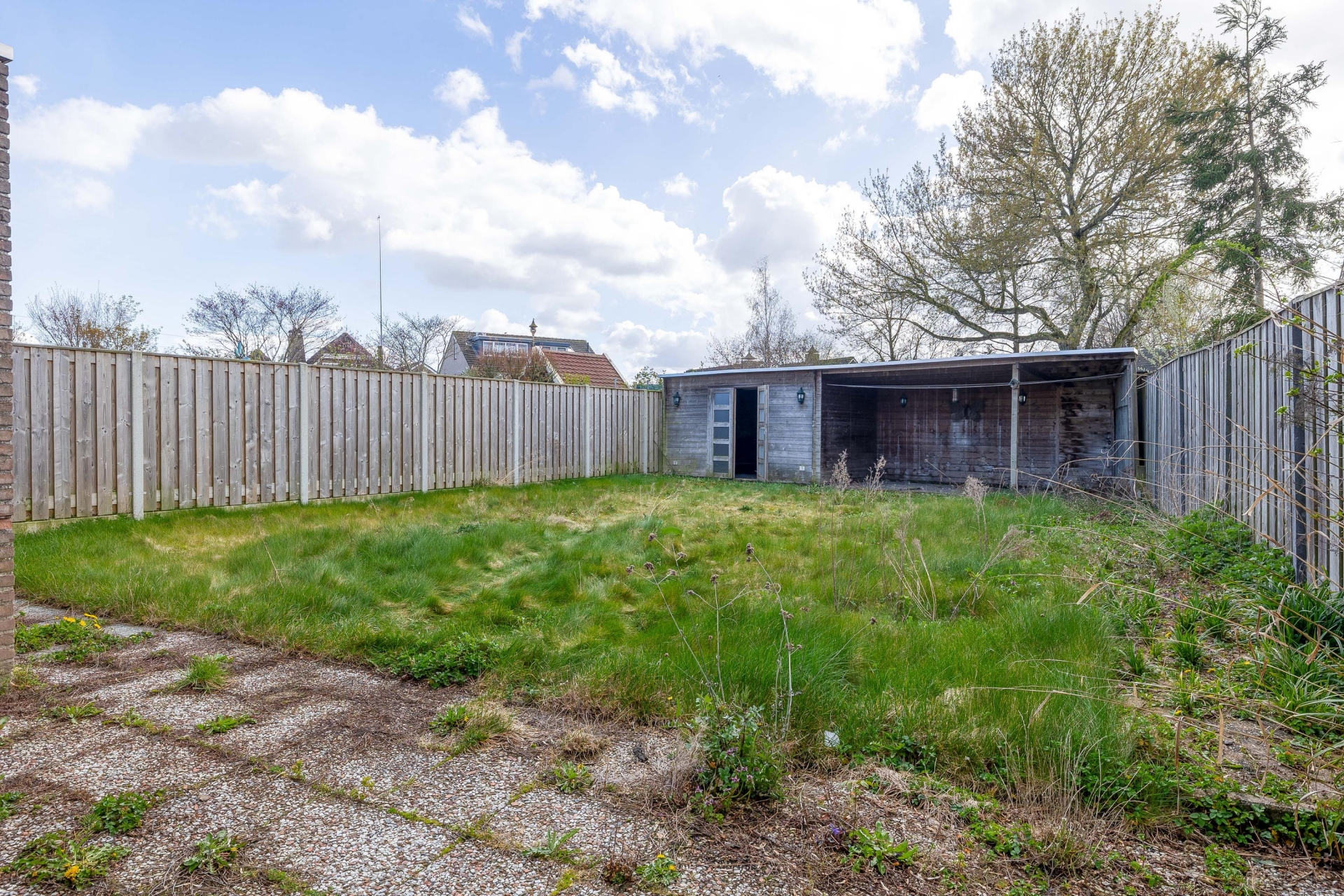 Achterin de tuin staat een berging met overkapping, ideaal voor het opbergen van tuingereedschap of het creëren van een gezellige buitenplek. Of je nu wilt tuinieren, borrelen met vrienden of gewoon lekker wilt ontspannen na een werkdag, hier kan het allemaal.