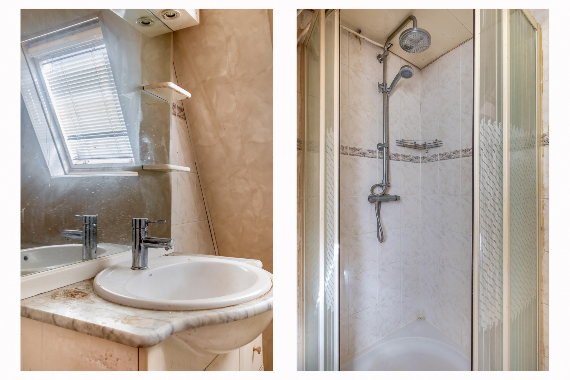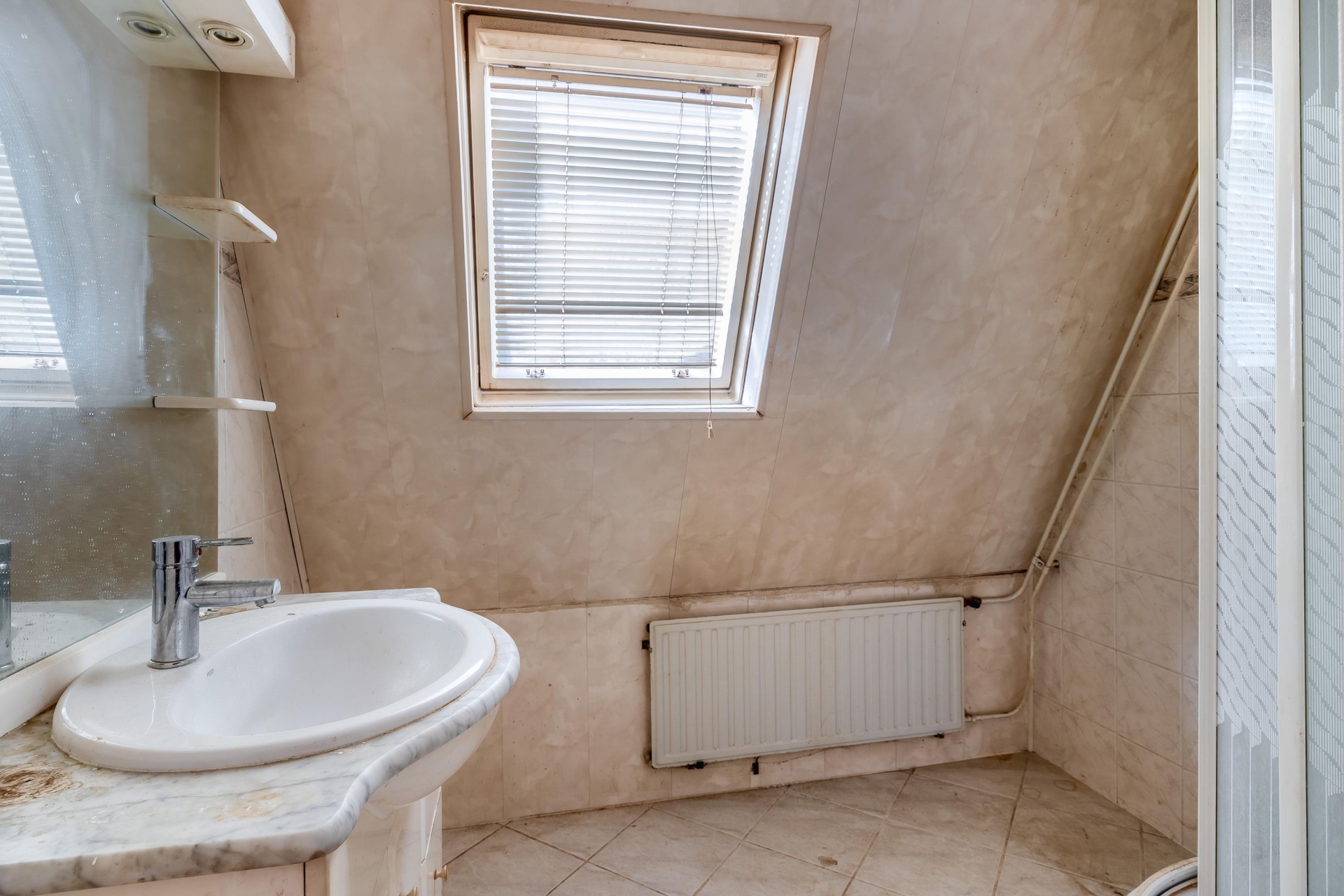 De badkamer is compact en voorzien van een douche en wastafel. Ook hier geldt dat modernisering mogelijk is, zodat je het helemaal naar eigen smaak kunt inrichten.