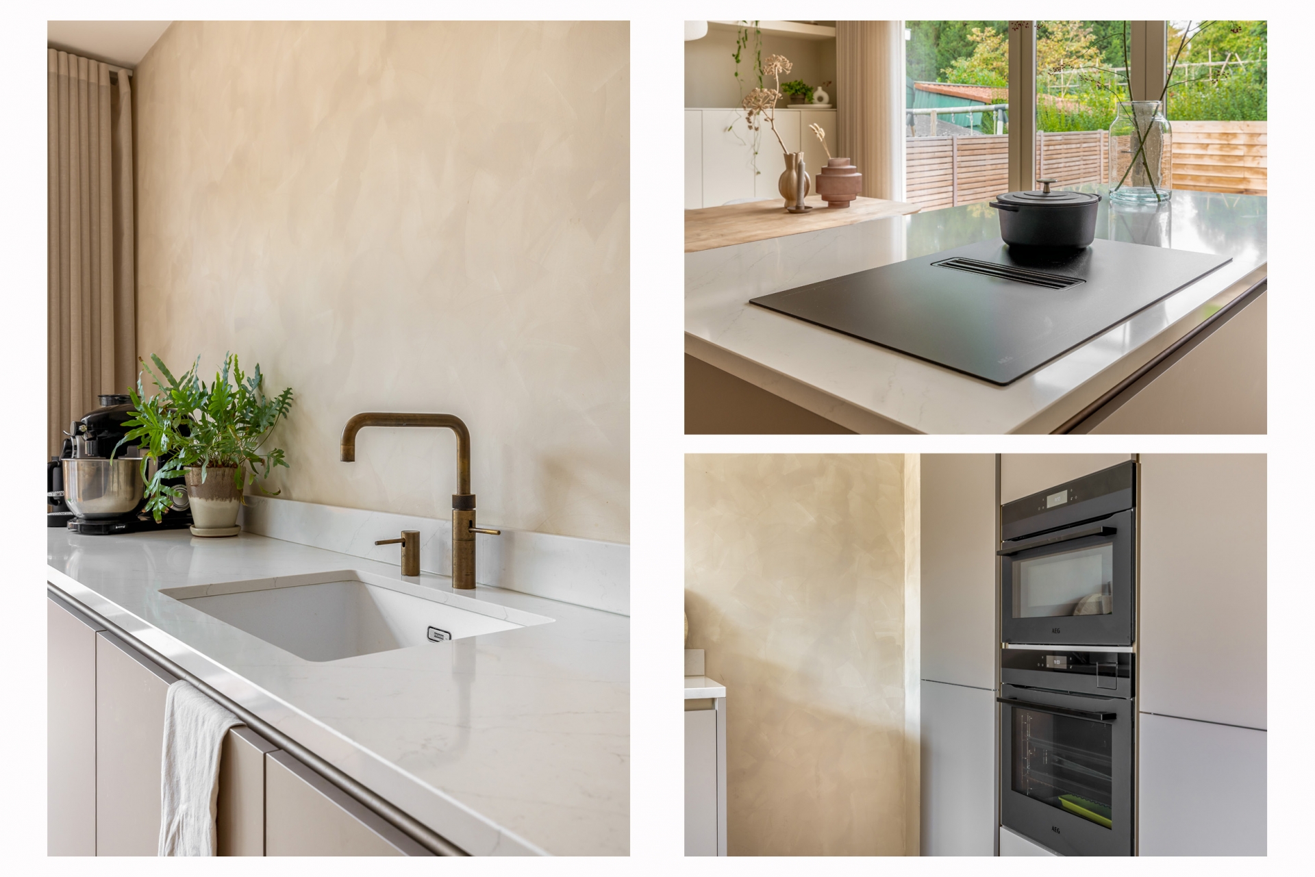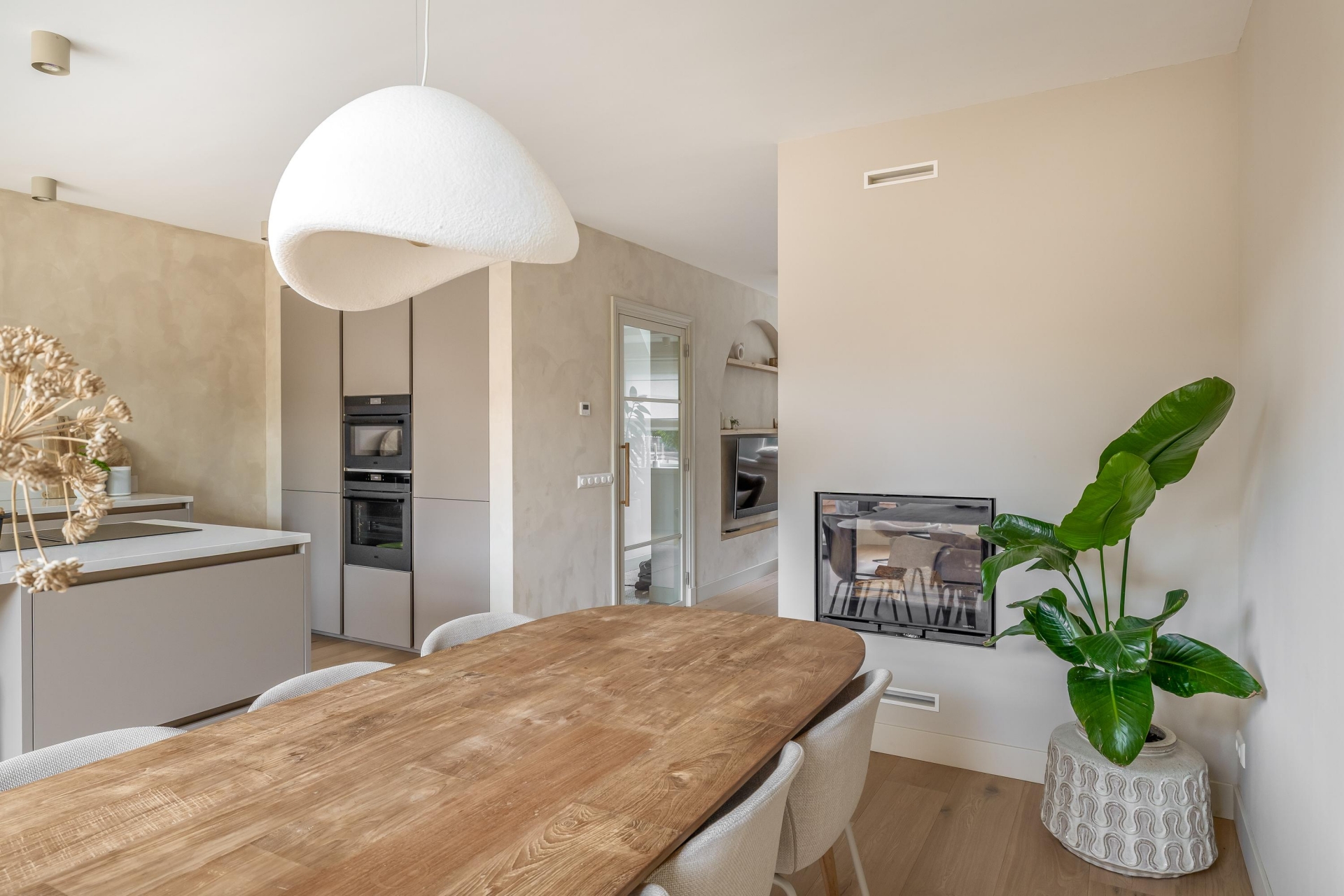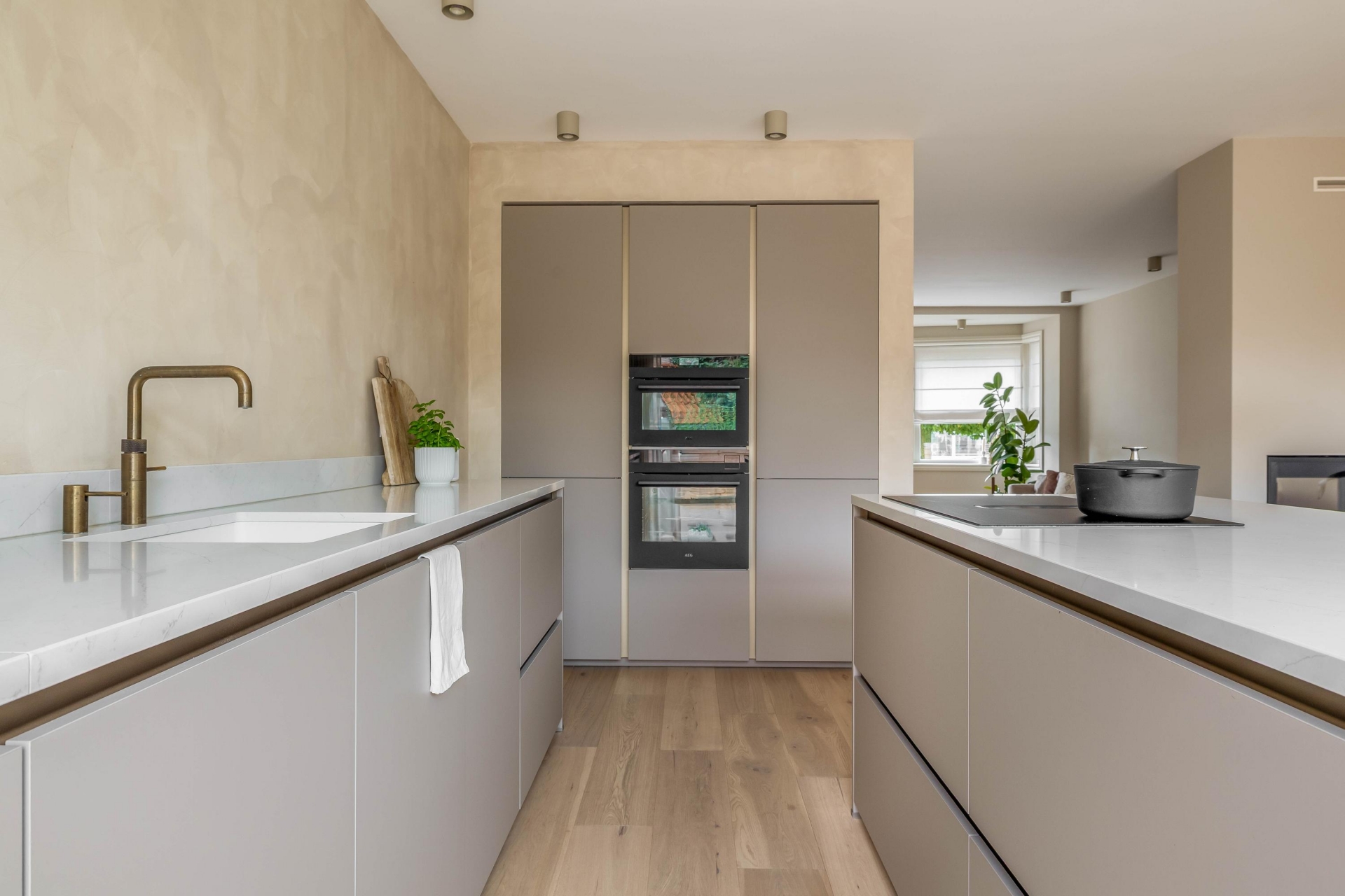 De keuken is zonder twijfel het hart van dit huis. Strak vormgegeven met lichte fronten, een groot kookeiland en moderne apparatuur, biedt deze ruimte alles voor wie graag kookt of gasten ontvangt. Terwijl jij aan het koken bent, klets je gezellig mee met familie of vrienden aan het eiland. De afwerking is tot in detail verzorgd: houten vloeren, glad gestuukte wanden en ingebouwde verlichting zorgen voor een rustige, eigentijdse uitstraling.