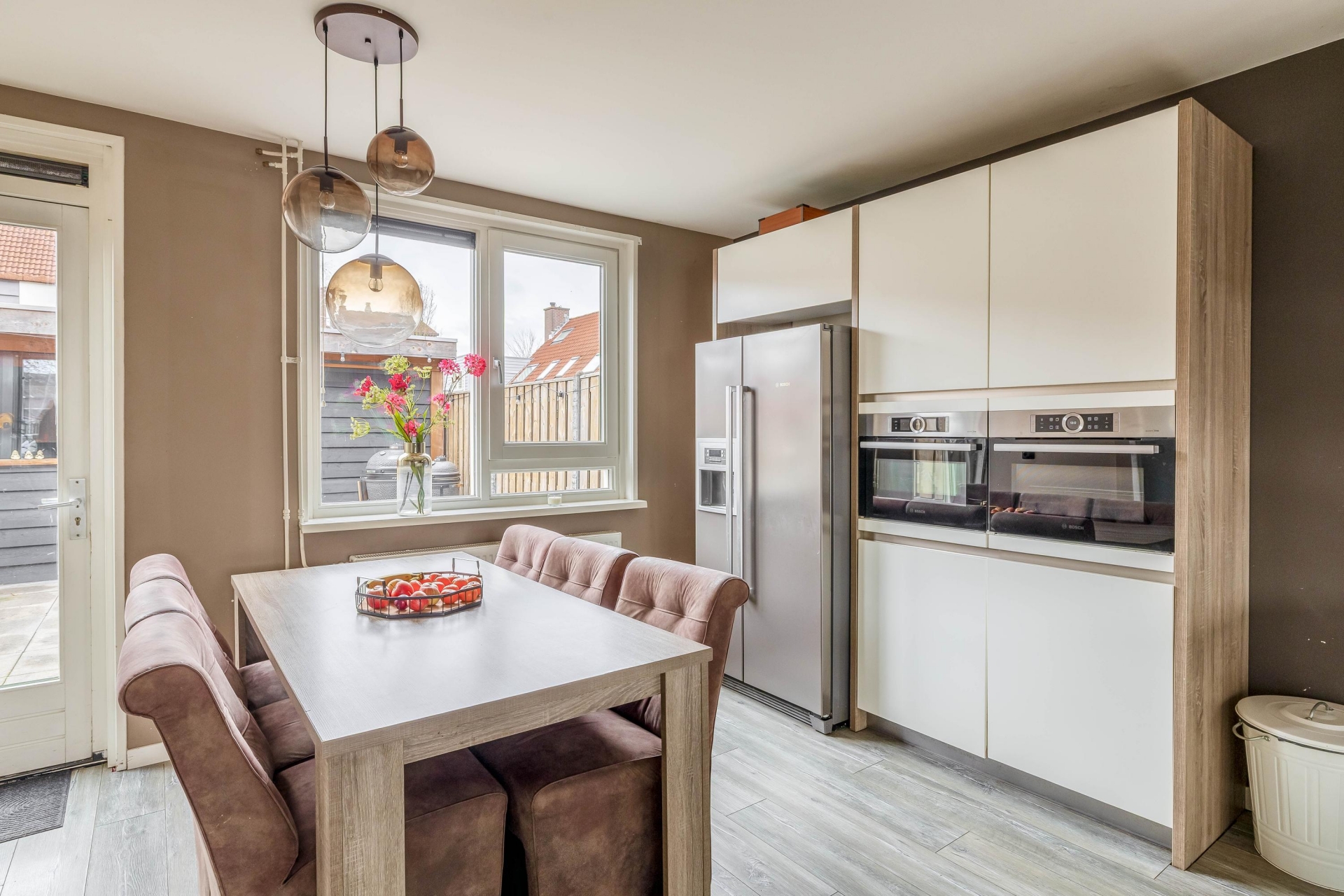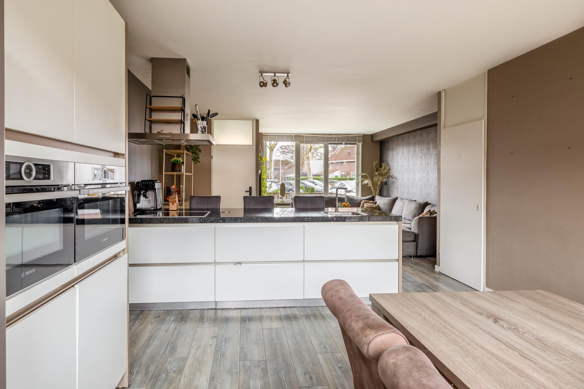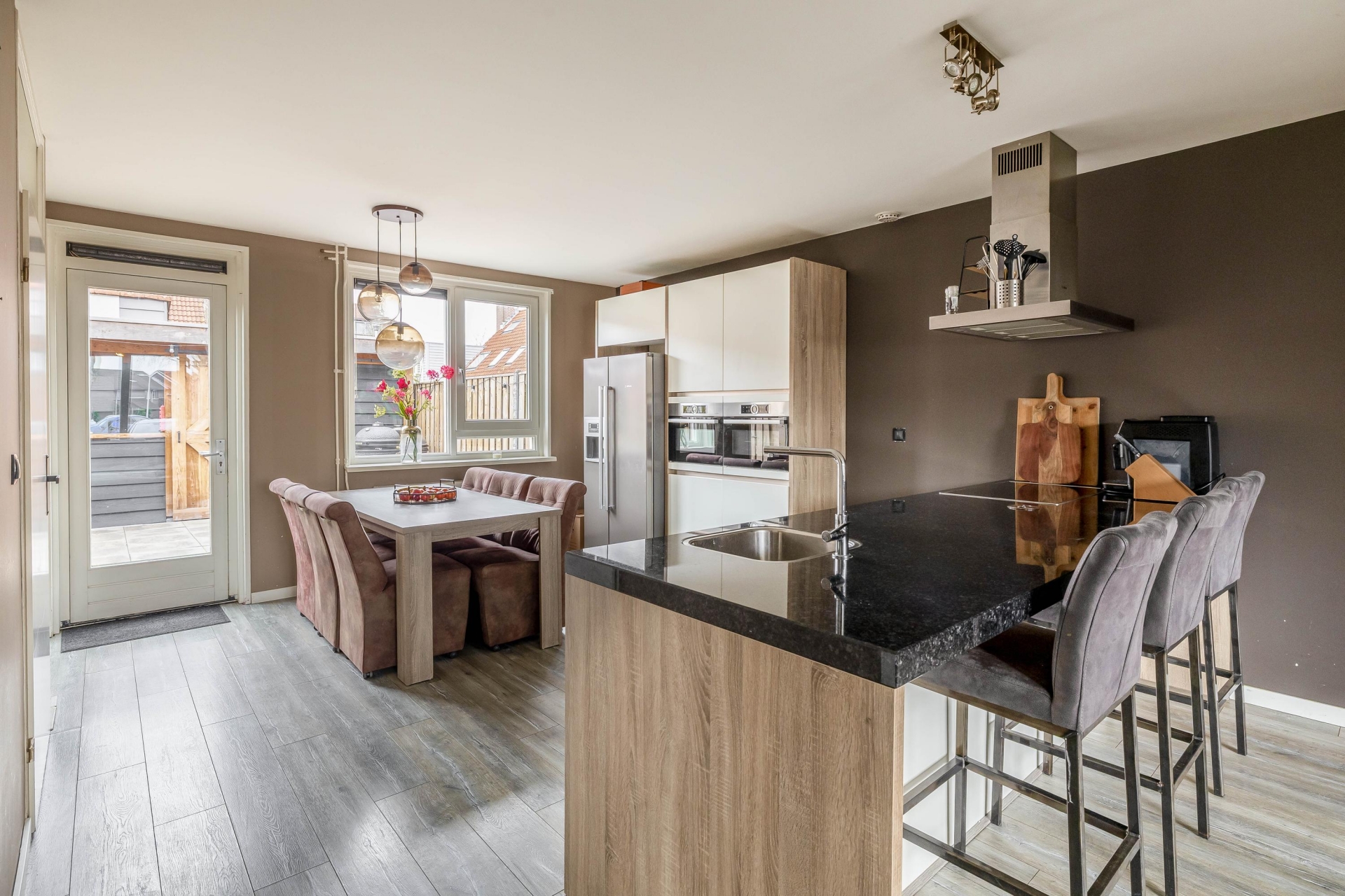 De keuken is modern uitgevoerd en voorzien van een kook- en spoeleiland met baropstelling met zitplaatsen. Ideaal voor een snel ontbijt in de ochtend of een borrel met vrienden terwijl jij het diner voorbereidt. Vanuit de keuken loop je zo de achtertuin in, wat op mooie dagen zorgt voor een verlengstuk van je leefruimte. De afwerking is strak en verzorgd, met een moderne vloer en rustige kleurstellingen.