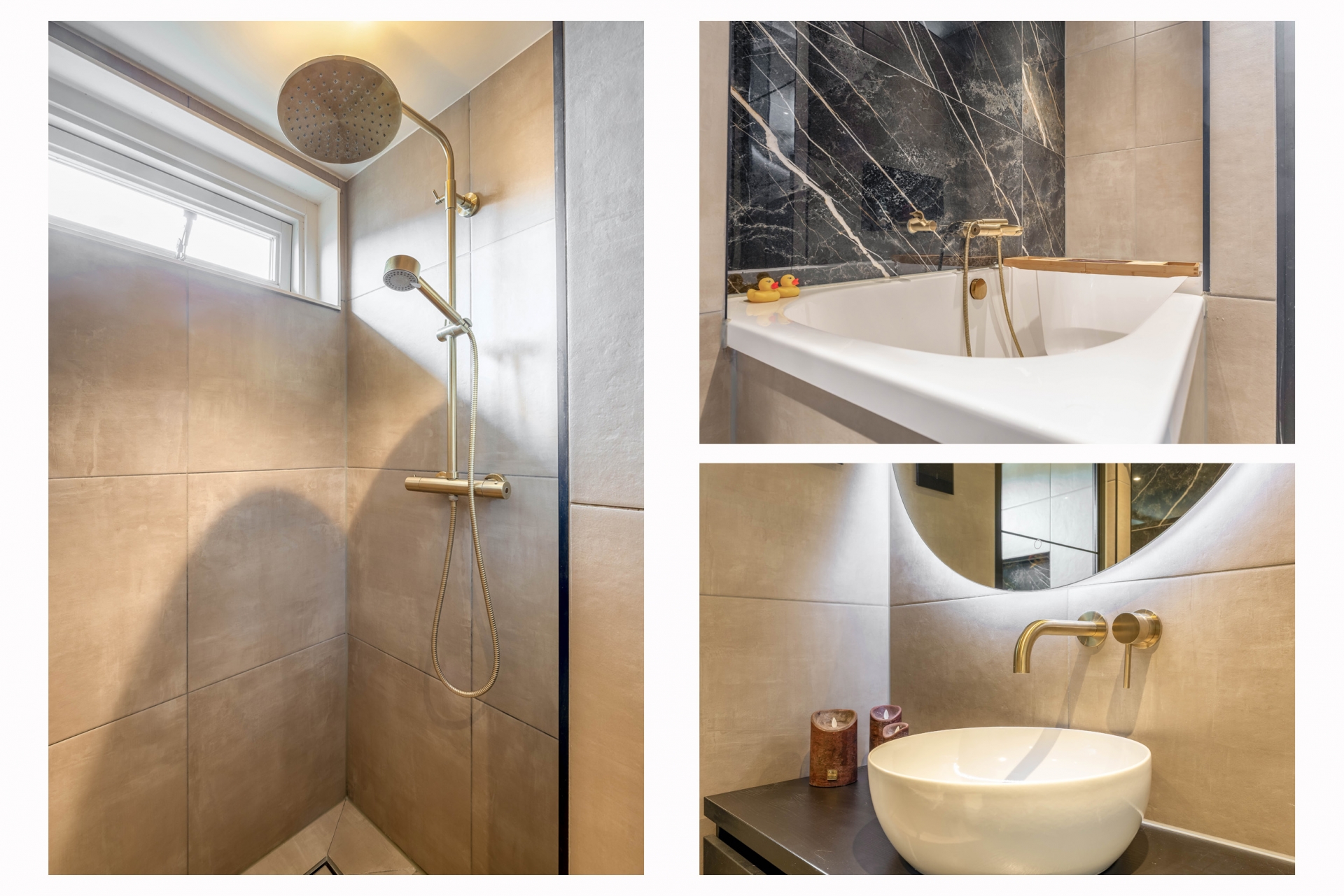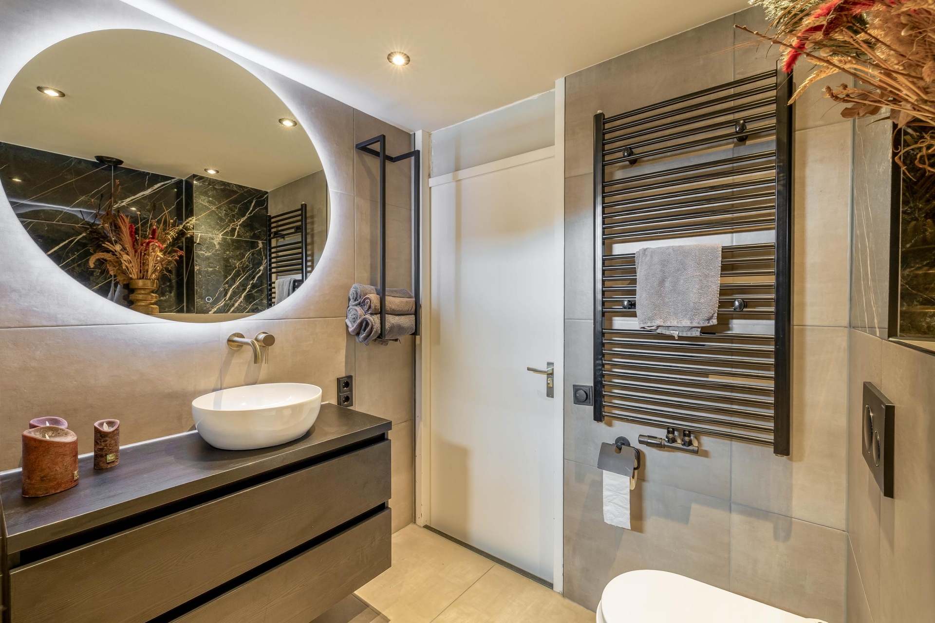 De badkamer is modern en stijlvol uitgevoerd. Hier vind je een ligbad, tweede toilet, een inloopdouche met inbouw infraroodlamp en een fraai wastafelmeubel. De combinatie van donkere en lichte tegels geeft de ruimte een luxe uitstraling. Dankzij het raam is er prettig daglicht en natuurlijke ventilatie.
