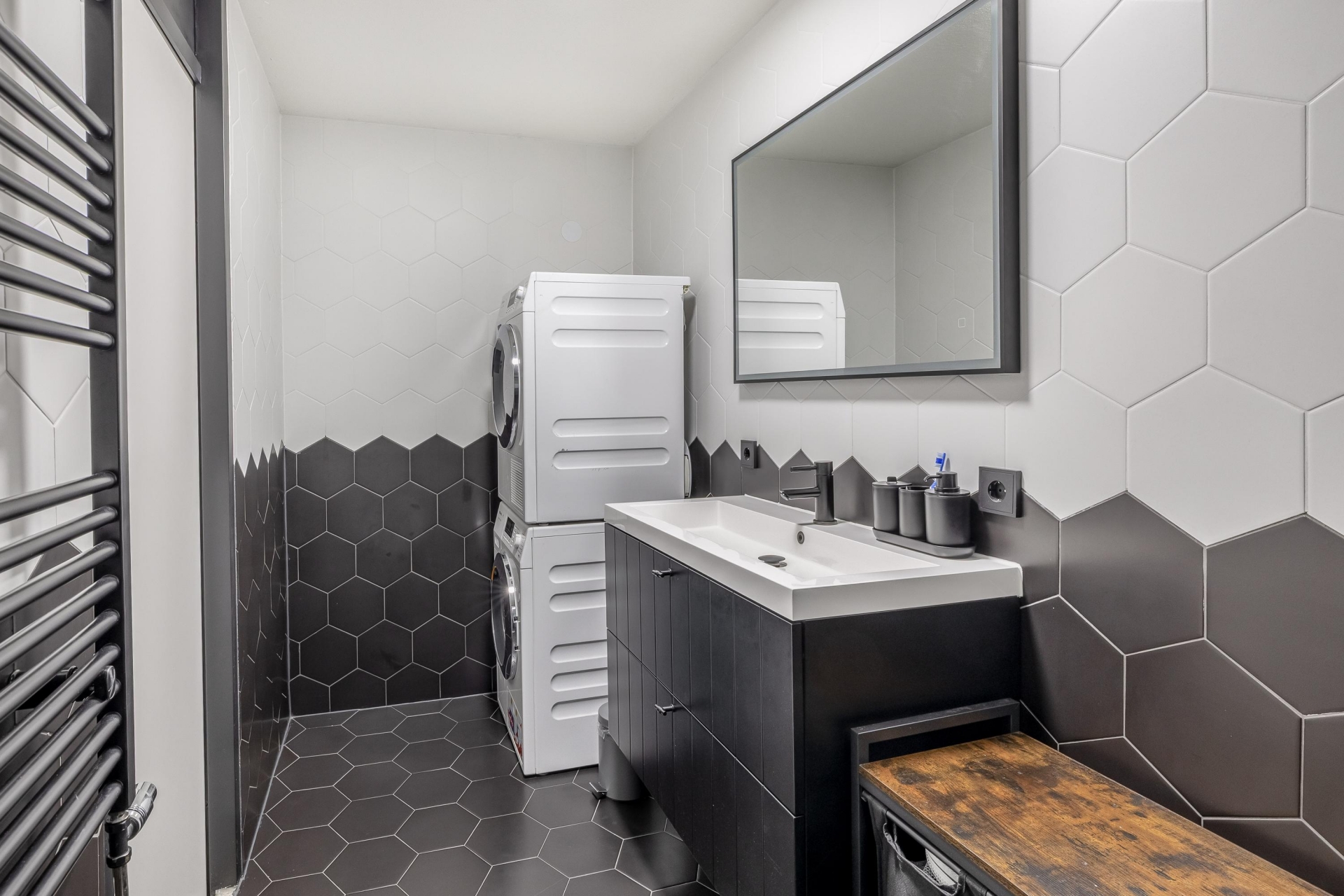 De royale woonkamer is een heerlijke, lichte ruimte met grote raampartijen en een directe verbinding met het brede balkon dat zich uitstrekt over de volledige breedte van de woning. Hier geniet je ’s ochtends van de opkomende zon en een vrij uitzicht, terwijl er voldoende plaats is voor zowel een zit- als eetgedeelte. De open keuken is recent geplaatst en uitgevoerd in een moderne stijl met strak vormgegeven kasten en hedendaags inbouwapparatuur. De twee slaapkamers liggen beide aan de balkonzijde, waardoor ze profiteren van veel licht en zicht op buiten. Ze zijn ideaal te gebruiken als slaap-, werk- of logeerkamer.