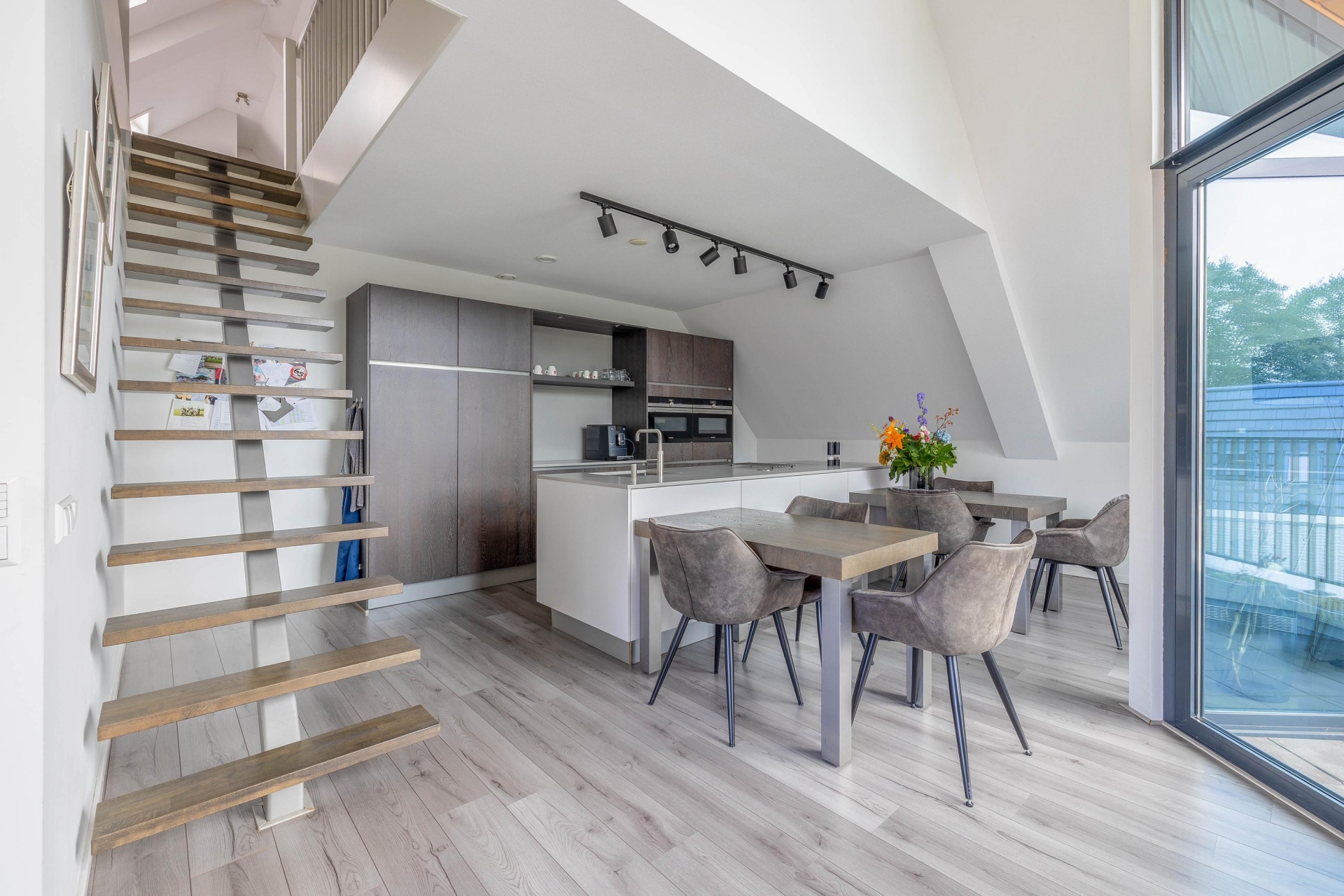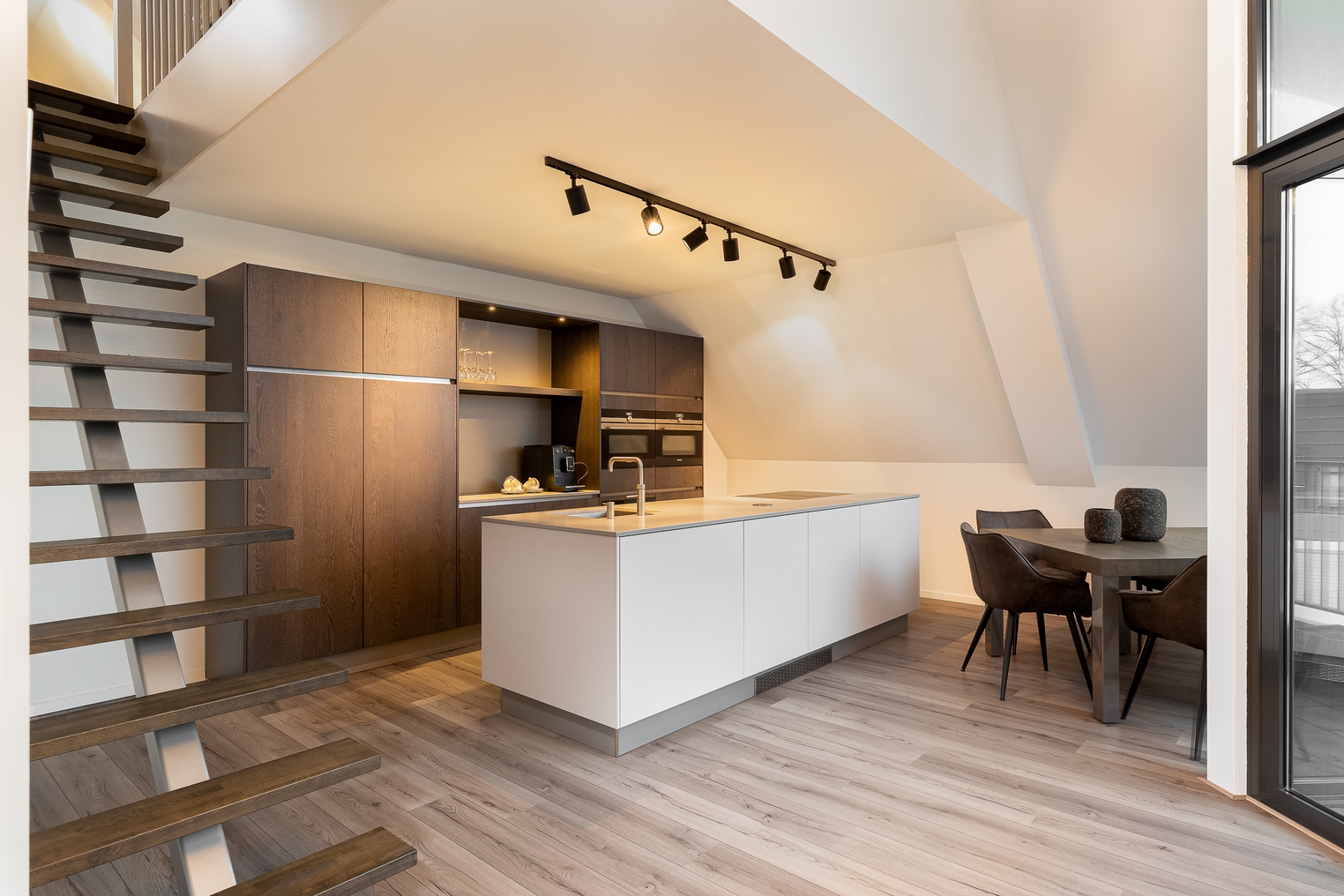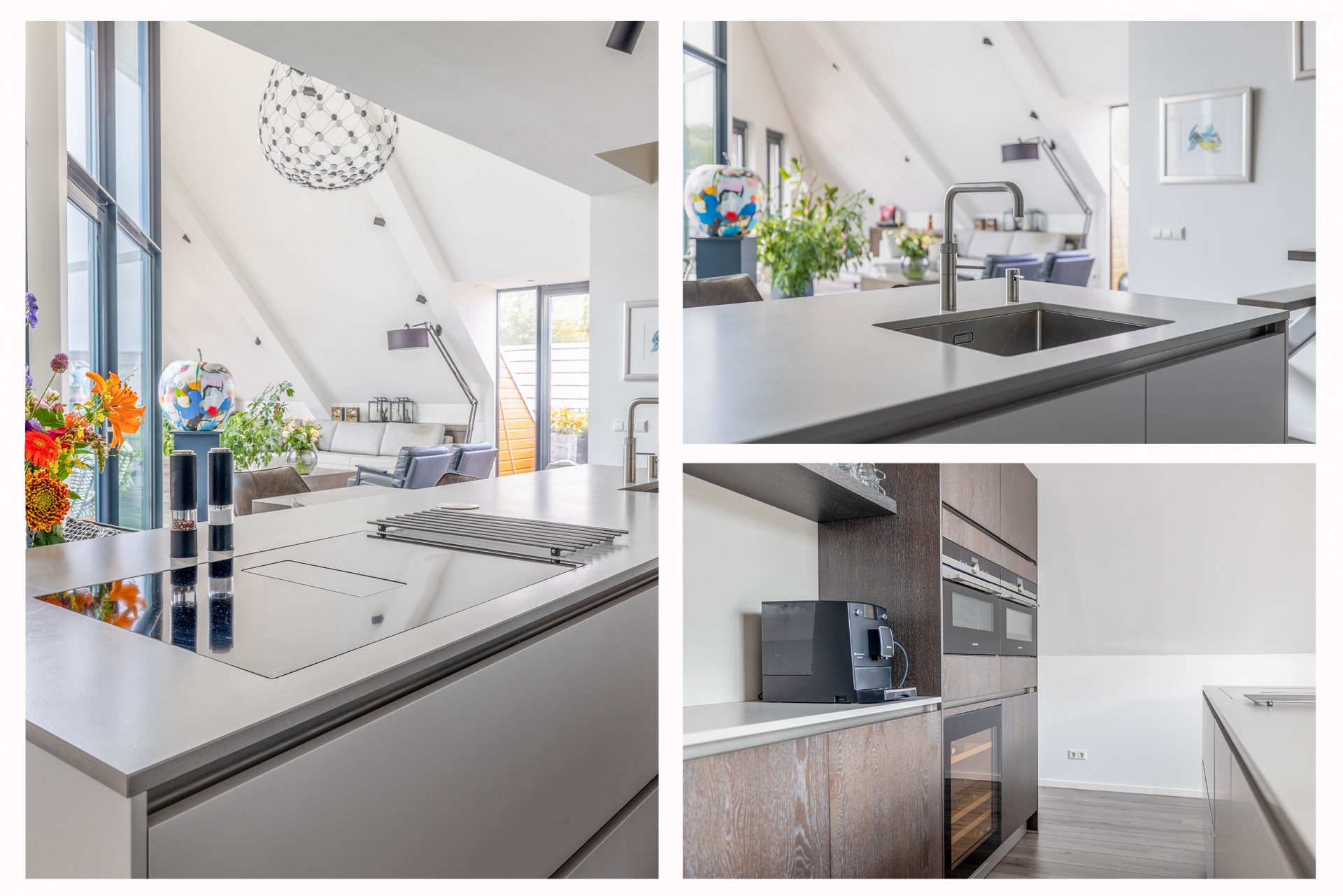 U komt binnen via een fraaie centrale hal op de begane grond en neemt de lift naar de bovenste verdieping. Daar stapt u uit in uw eigen hal, zonder andere bewoners op deze verdieping. Via de hal komt u in de ruime en lichte woonkamer met toegang tot beide terrassen, wat een genot! De open keuken is modern en voorzien van diverse inbouwapparatuur waaronder een inductie kookplaat, quooker, 2 ovens waarvan 1 combi/oven magnetron, vaatwasser, koelkast, vriezer en een eigen wijnkoeler! In de keuken een trap naar de entresol.