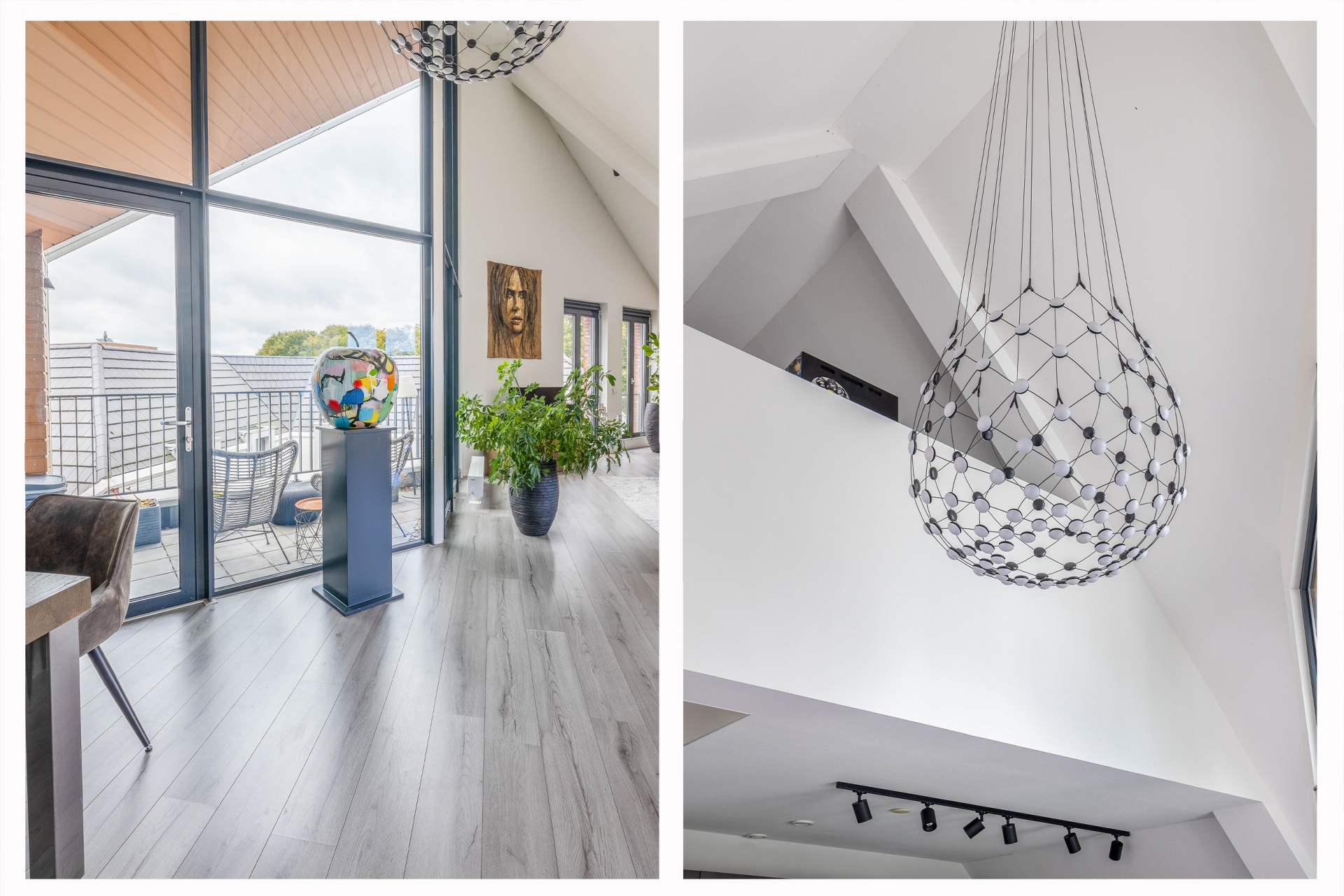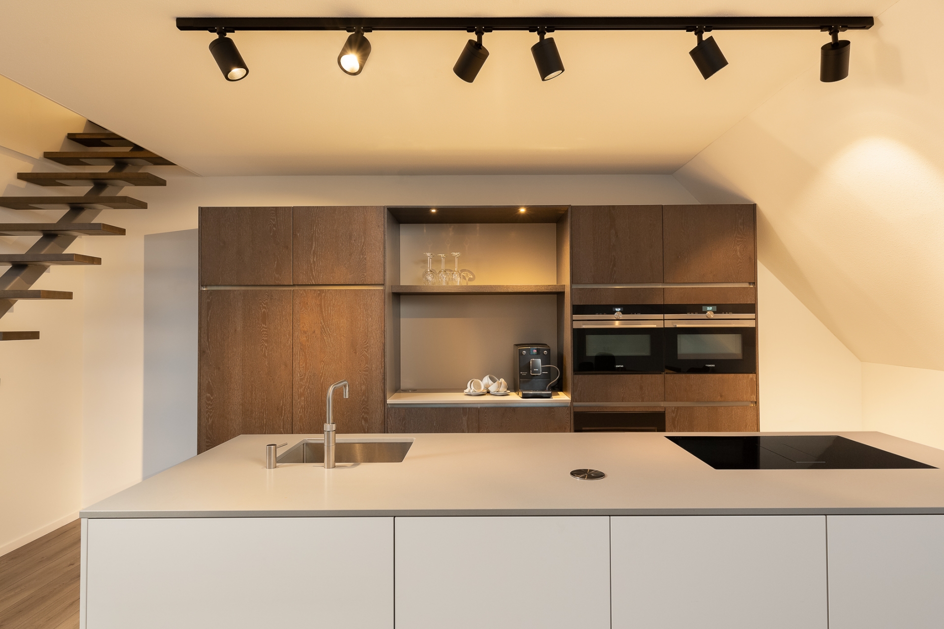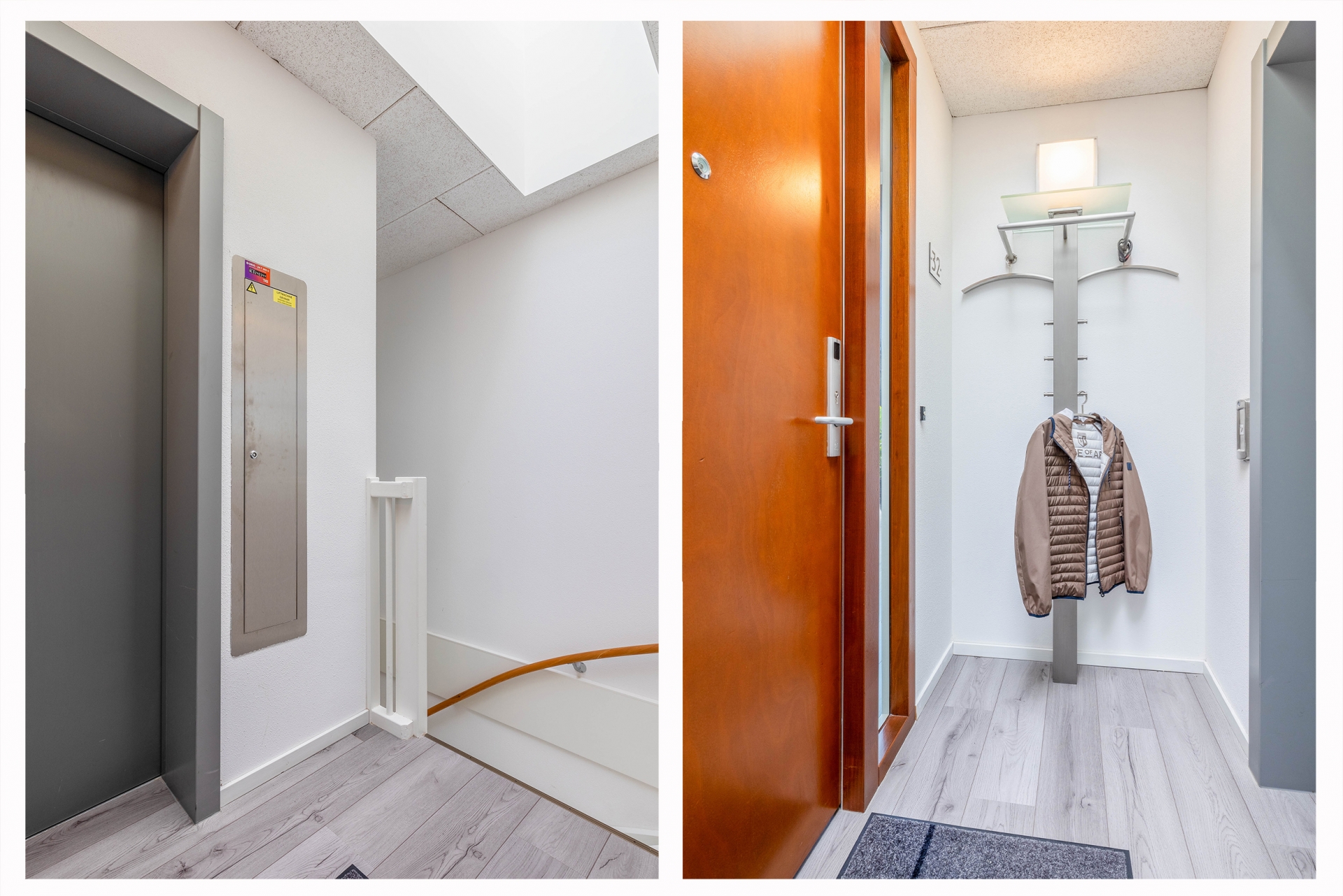 U komt binnen via een fraaie centrale hal op de begane grond en neemt de lift naar de bovenste verdieping. Daar stapt u uit in uw eigen hal, zonder andere bewoners op deze verdieping. Via de hal komt u in de ruime en lichte woonkamer met toegang tot beide terrassen, wat een genot! De open keuken is modern en voorzien van diverse inbouwapparatuur waaronder een inductie kookplaat, quooker, 2 ovens waarvan 1 combi/oven magnetron, vaatwasser, koelkast, vriezer en een eigen wijnkoeler! In de keuken een trap naar de entresol.