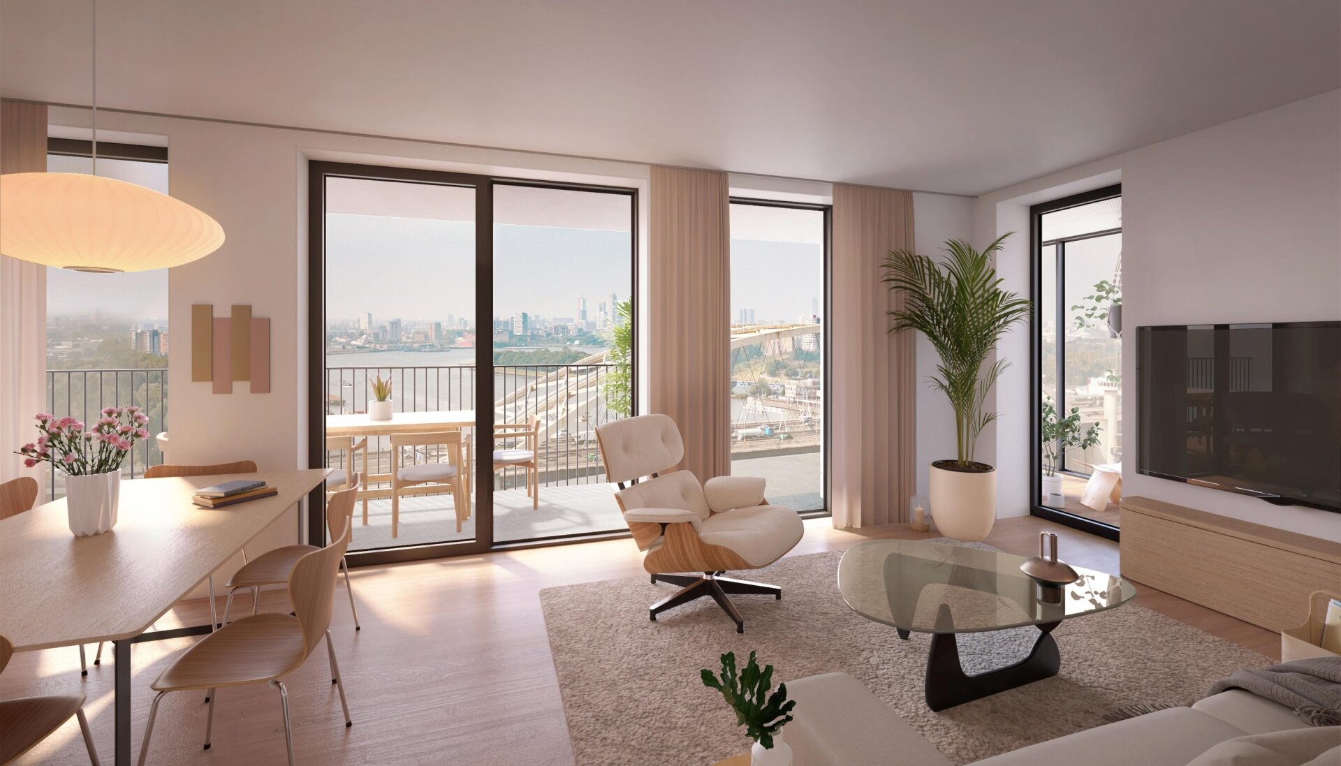Op de bovenste woonlaag van New Maas ligt dit gekoppelde appartement van 131 m², met een schitterend uitzicht over de Kuip, de Van Brienenoordbrug, de Nieuwe Maas en de skyline van Rotterdam.