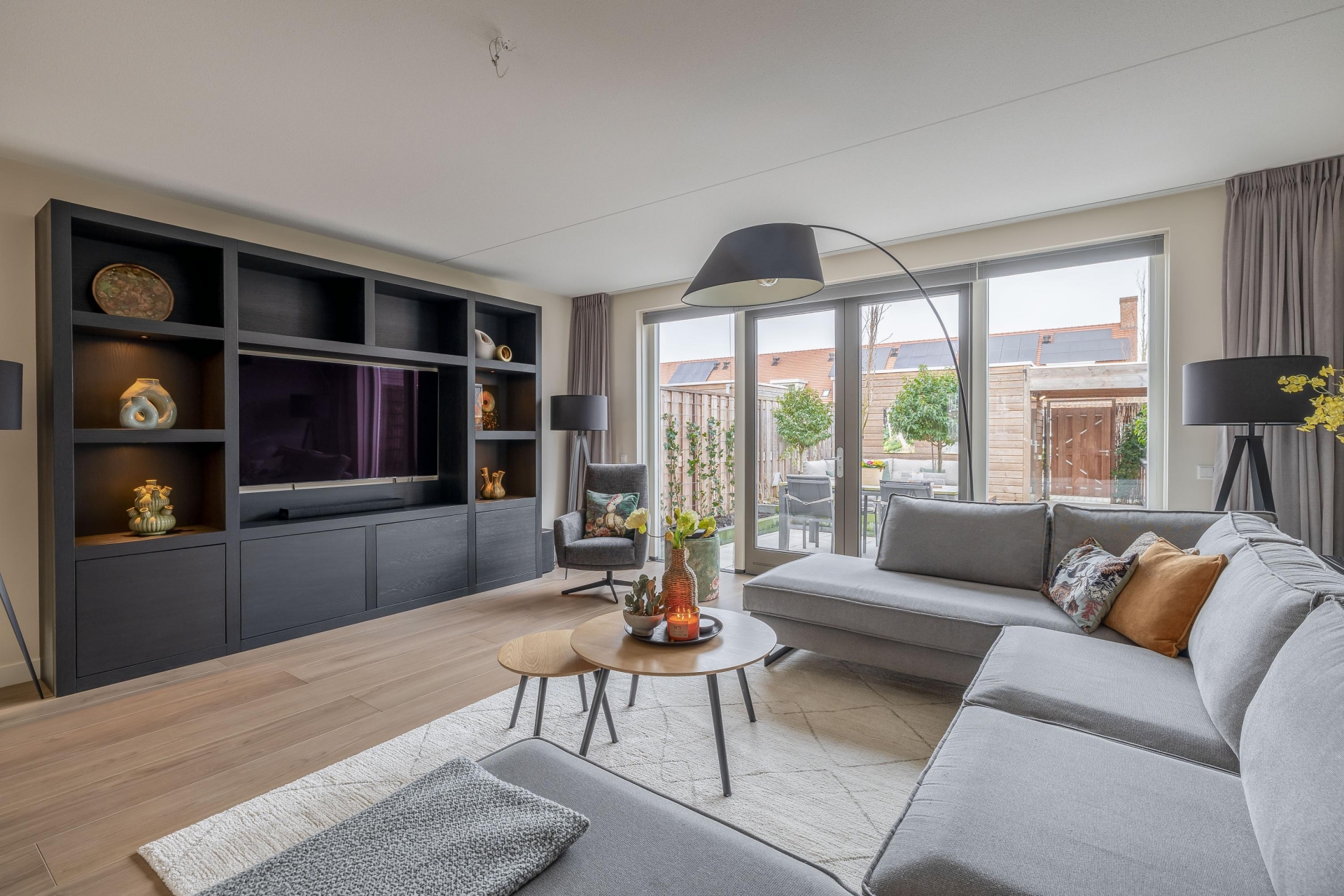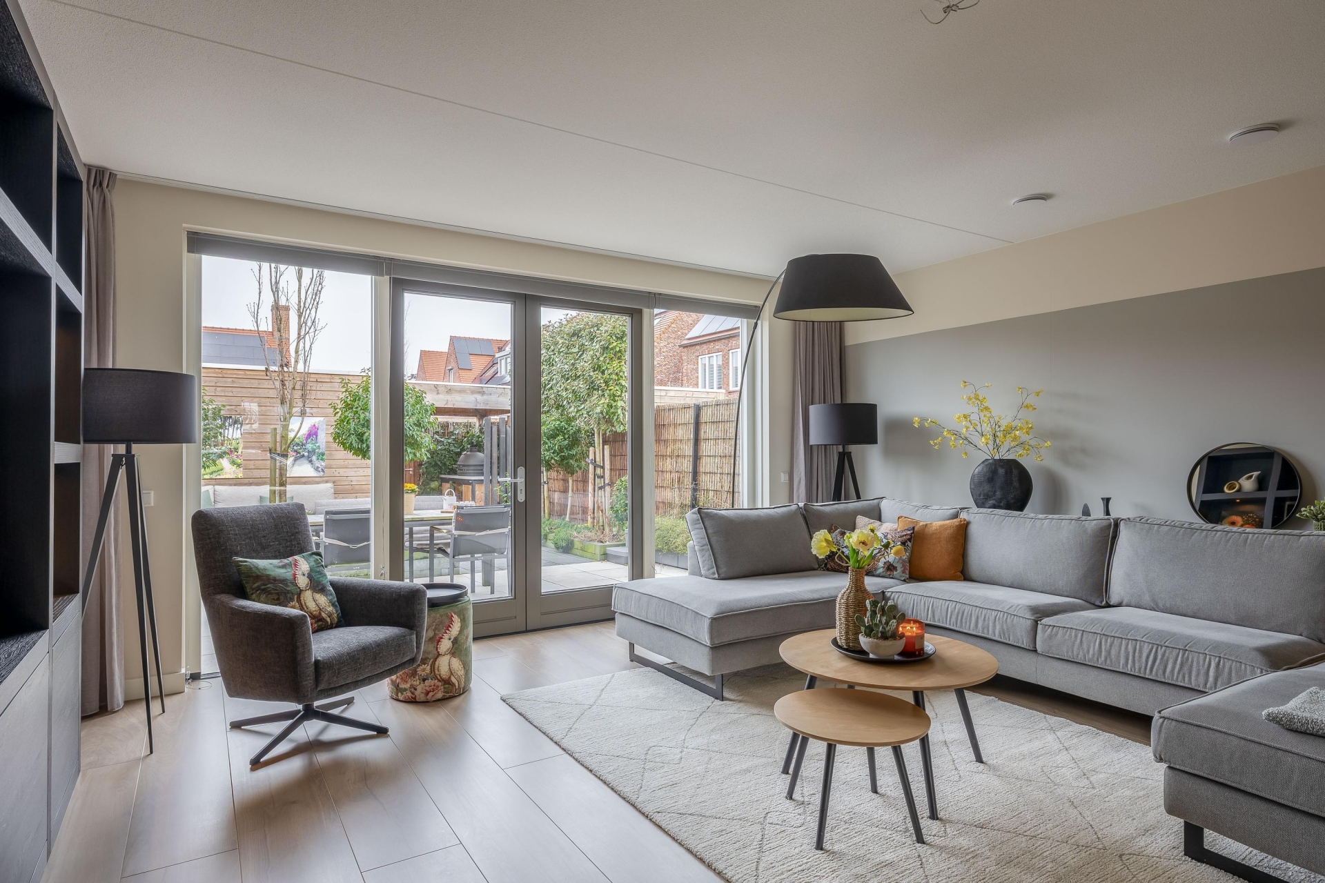 De woonkamer is riant, tuingericht en heerlijk licht dankzij de brede glazen pui met dubbele openslaande deuren aan de achterzijde. De strakke wandafwerking en de mooie vloerafwerking vallen direct op. Er is volop ruimte voor een royale zithoek en een grote eettafel. De openslaande deuren verbinden binnen direct met buiten, waardoor de tuin echt een verlengstuk van de leefruimte wordt.