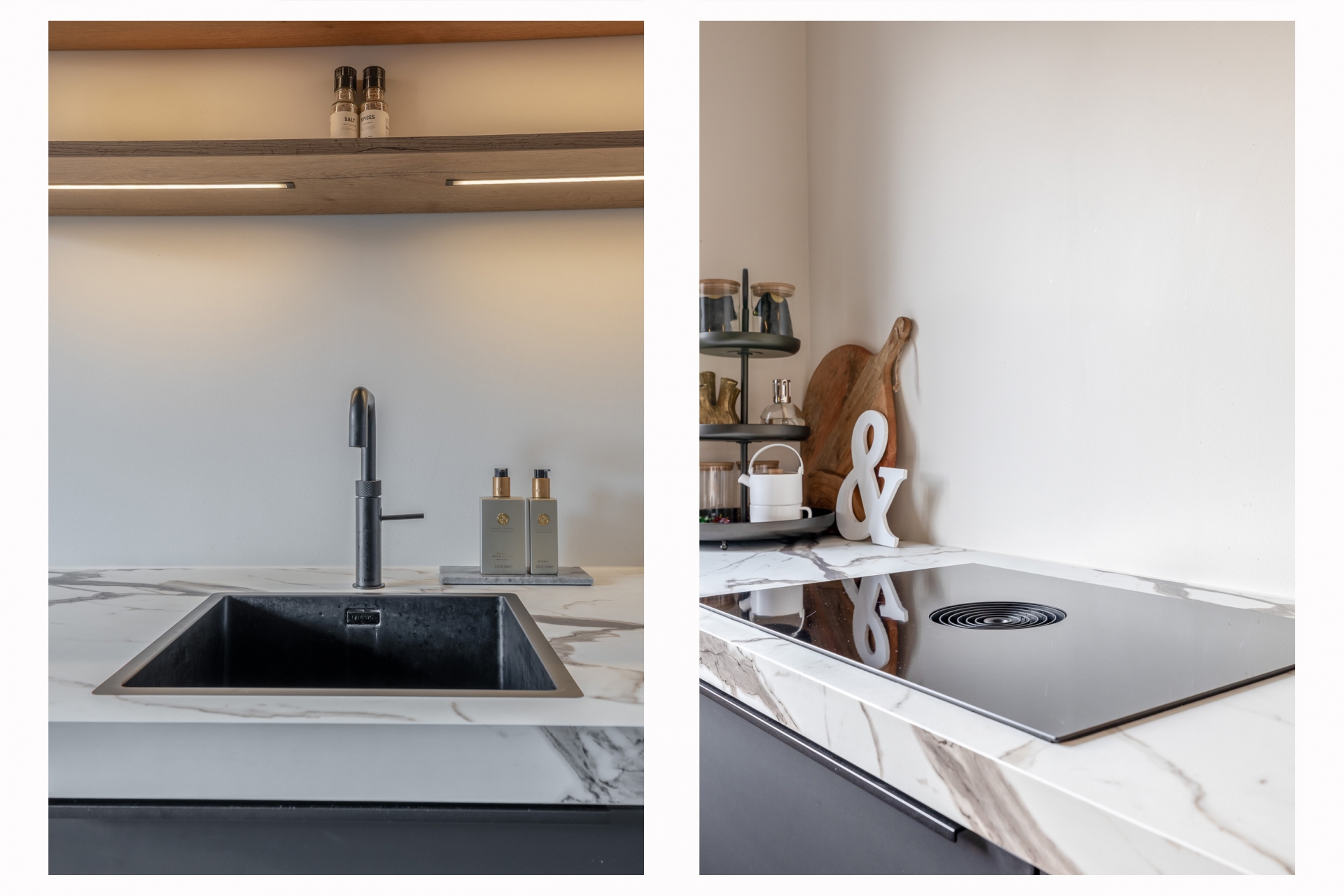 Aan de voorzijde is de luxe keuken gesitueerd. Deze keuken in parallel opstelling met zwarte fronten en een marmerlook werkblad geeft direct een stijlvolle uitstraling, een echte eyecatcher! Uiteraard is de keuken voorzien van alle benodigde luxe inbouwapparatuur. Hier kook je met gemak voor een groot gezelschap!