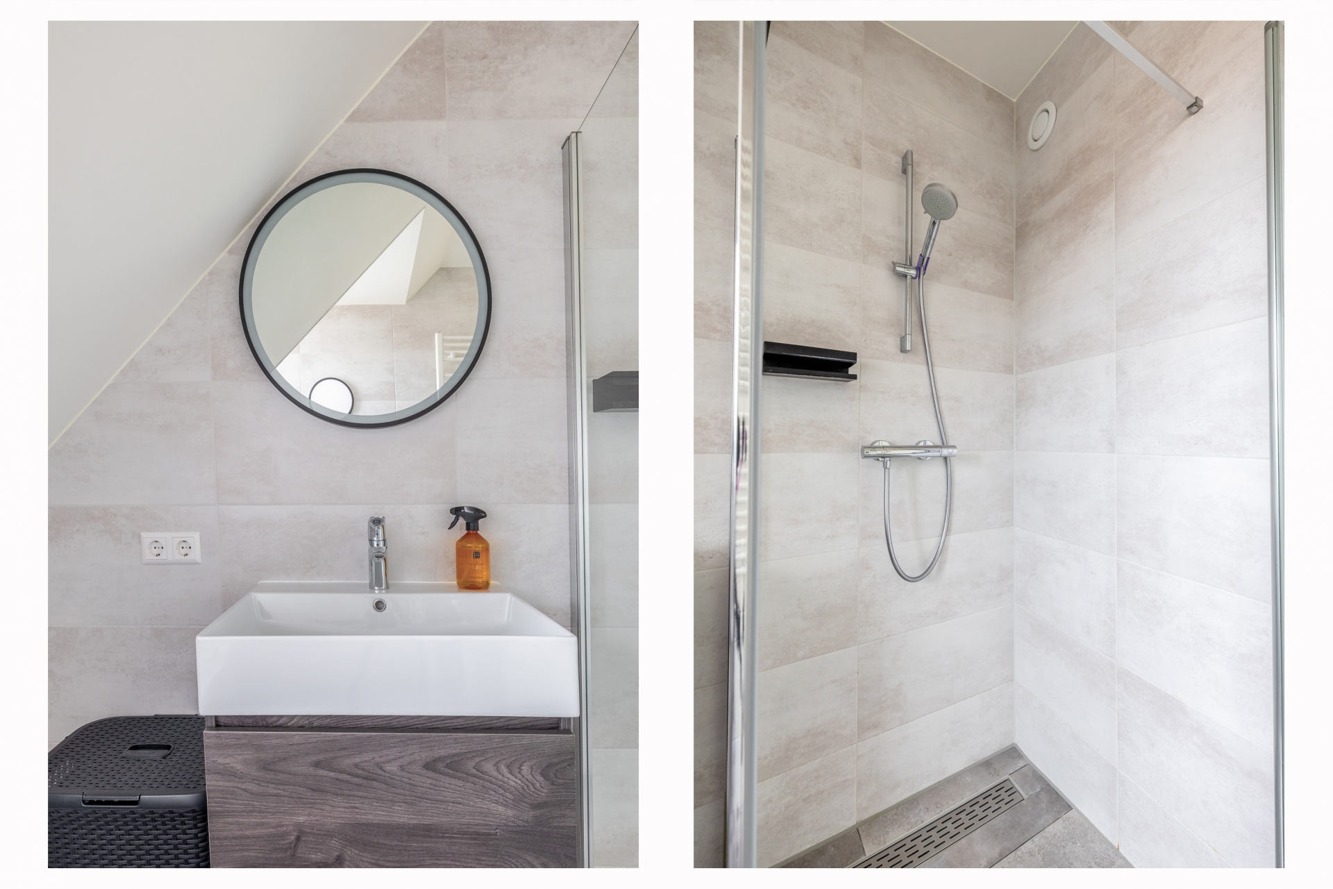 Op de eerste verdieping bevinden zich drie ruime slaapkamers en de eerste badkamer. De grootste slaapkamer biedt meer dan voldoende ruimte voor een kingsize bed en een grote kastenwand. De overige kamers zijn ideaal als kinderkamer, werkkamer of logeerkamer. De badkamer is strak en modern uitgevoerd met betonlook tegels, een royale inloopdouche met regendouche en een stijlvol wastafelmeubel. Alles is netjes afgewerkt en voelt als nieuw, wat ook logisch is bij een huis uit 2022.