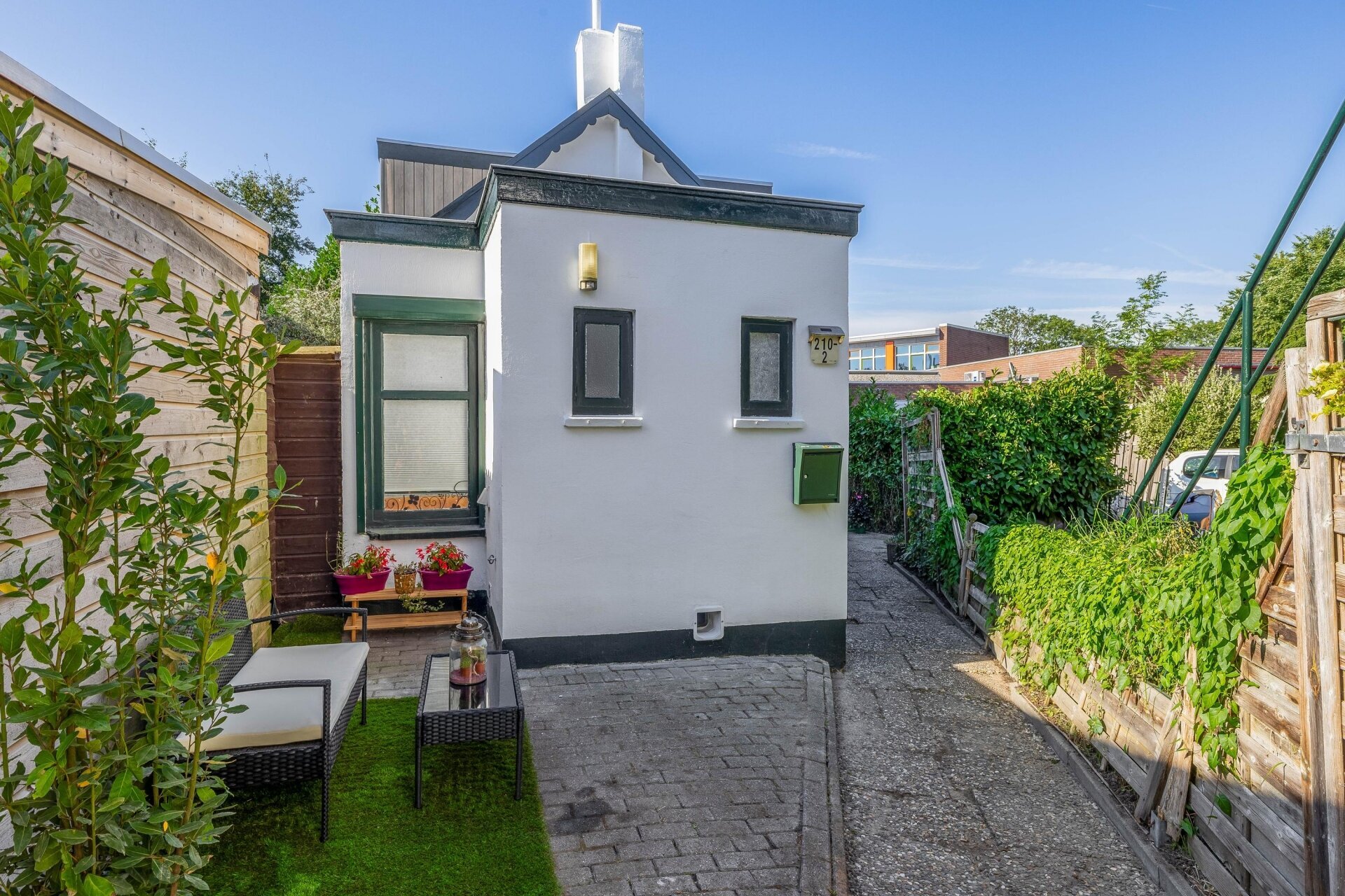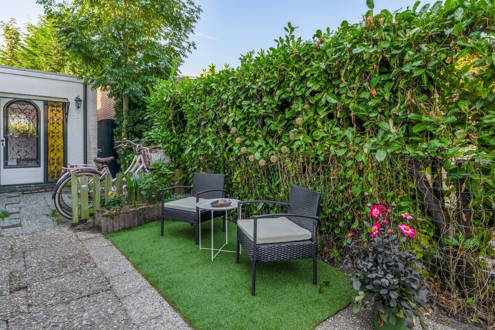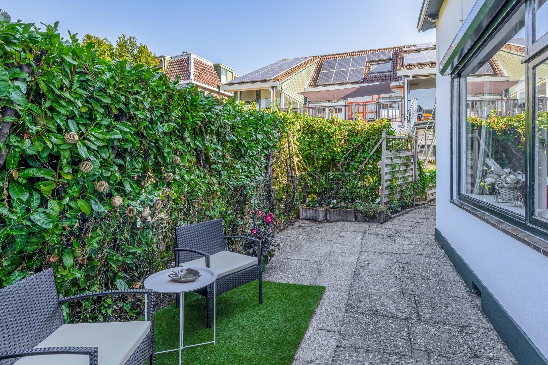 Aan de achterzijde van het huis ligt een beschutte tuin, groen aangelegd en voorzien van een knusse zithoek. De ligging op het westen zorgt ervoor dat je hier vooral in de middag en avond heerlijk van de zon kunt genieten – ideaal voor een etentje buiten of een drankje na werk.