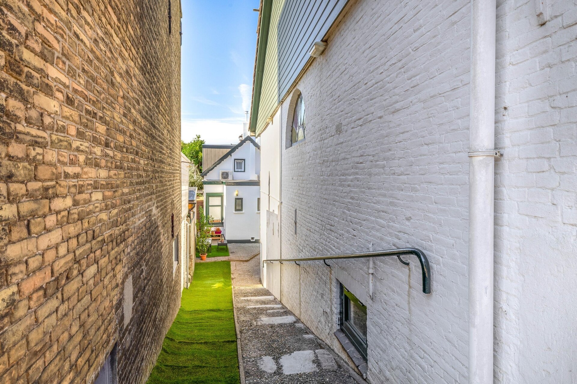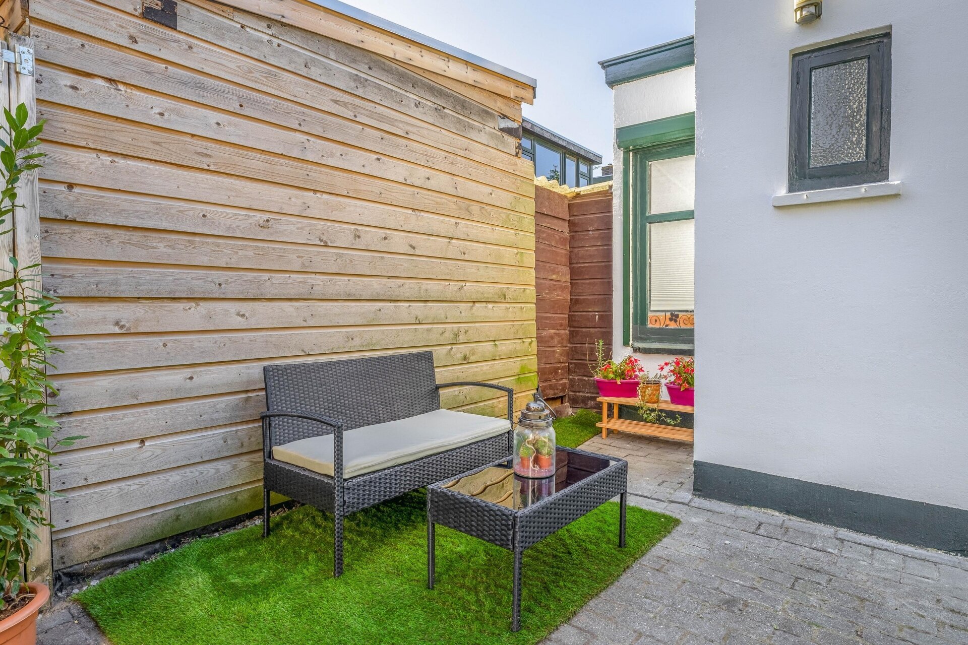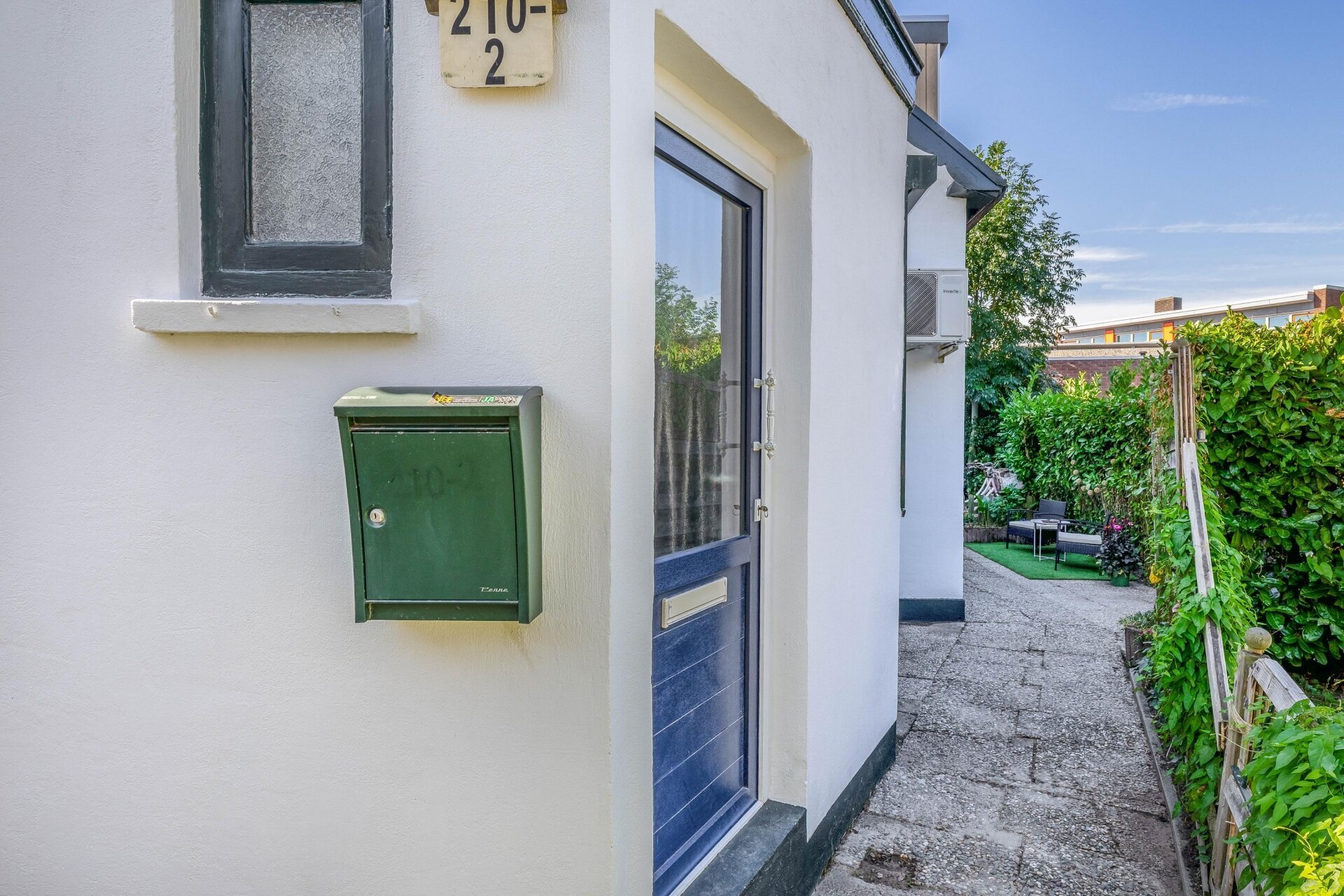 Aan de achterzijde van het huis ligt een beschutte tuin, groen aangelegd en voorzien van een knusse zithoek. De ligging op het westen zorgt ervoor dat je hier vooral in de middag en avond heerlijk van de zon kunt genieten – ideaal voor een etentje buiten of een drankje na werk.