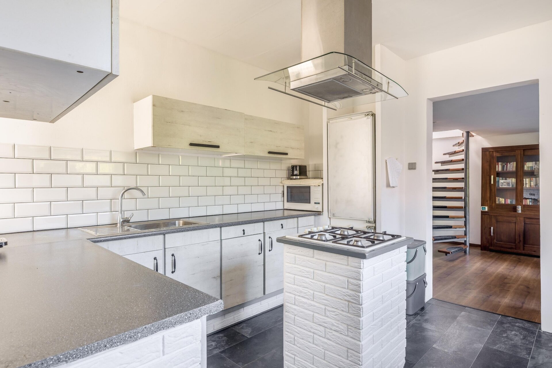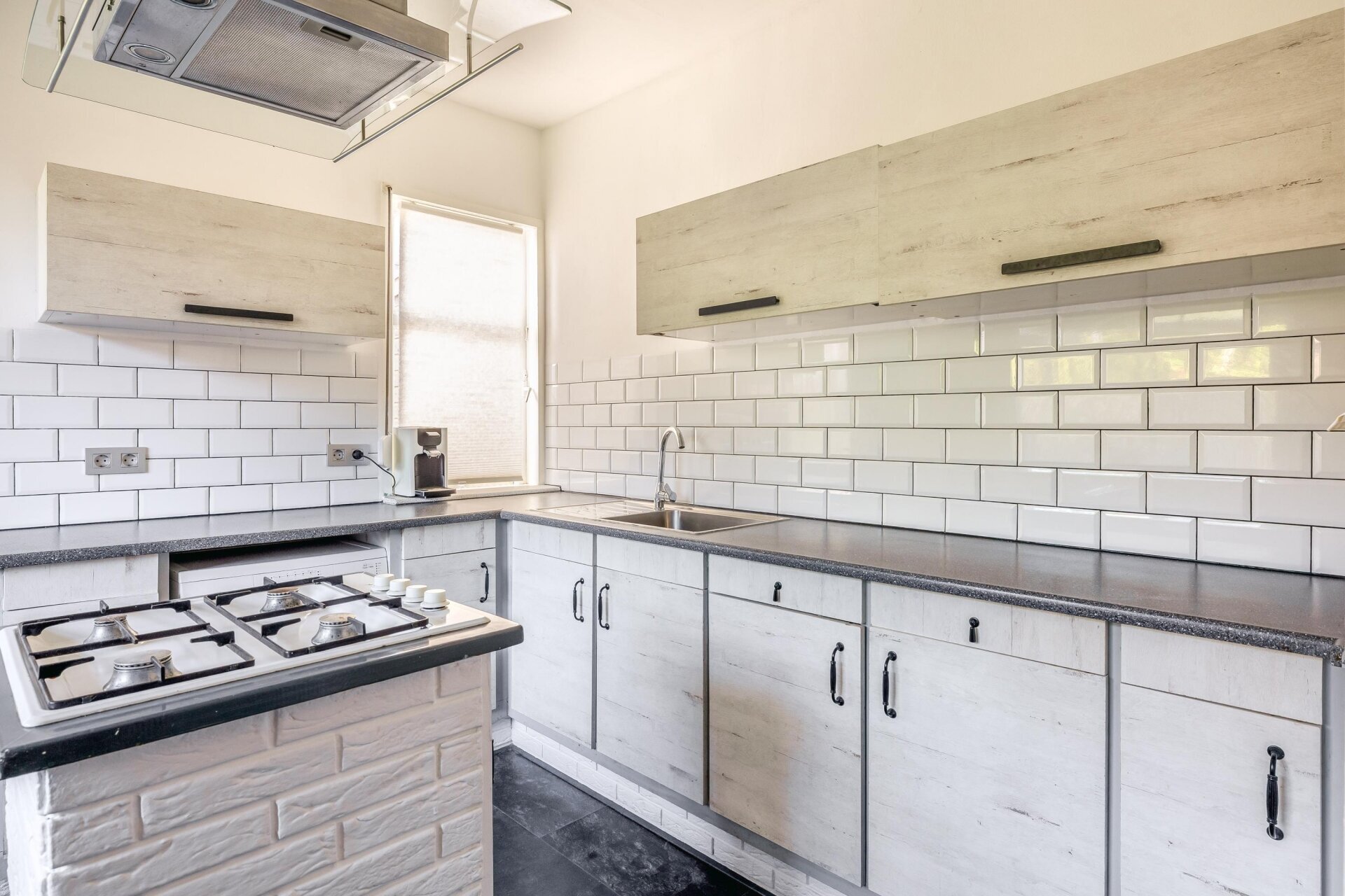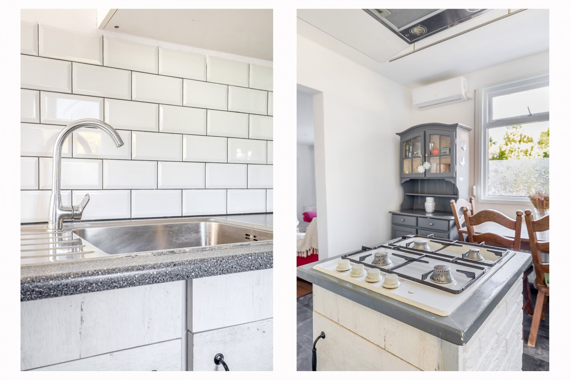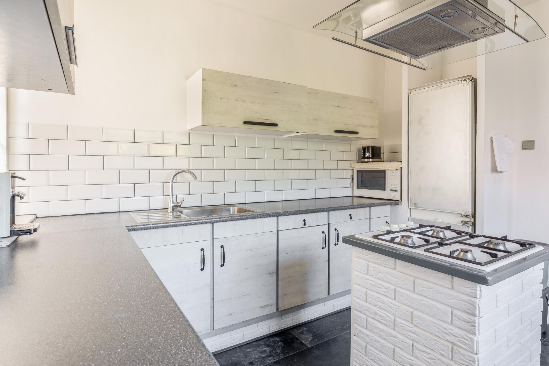 De keuken is strak uitgevoerd in wit met robuuste accenten en voorzien van een gaskookplaat op een losstaand blok, magnetron, afzuigkap, spoelbak en voldoende werk- en kastruimte. De witte wandtegels en landelijke uitstraling maken het geheel tijdloos.