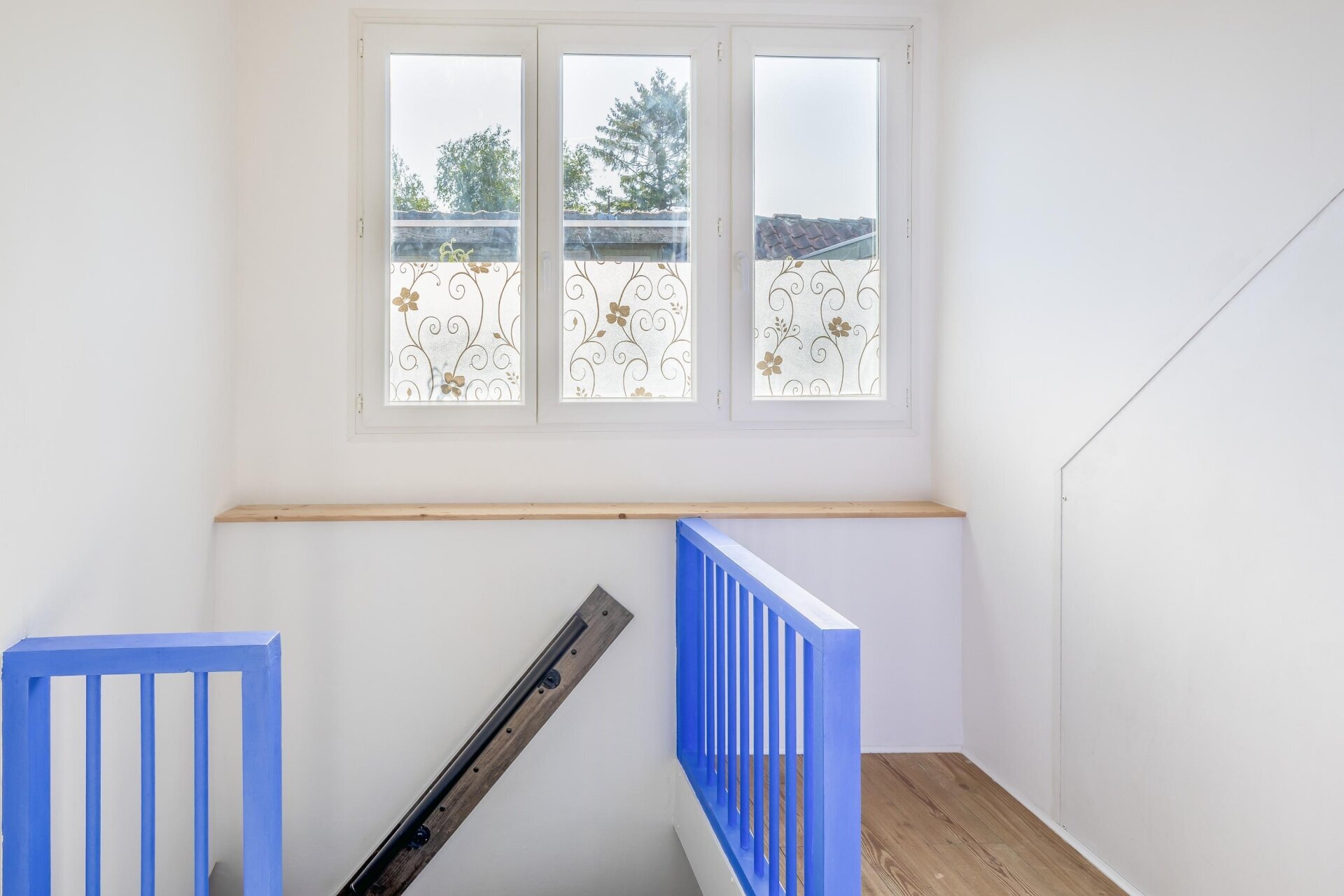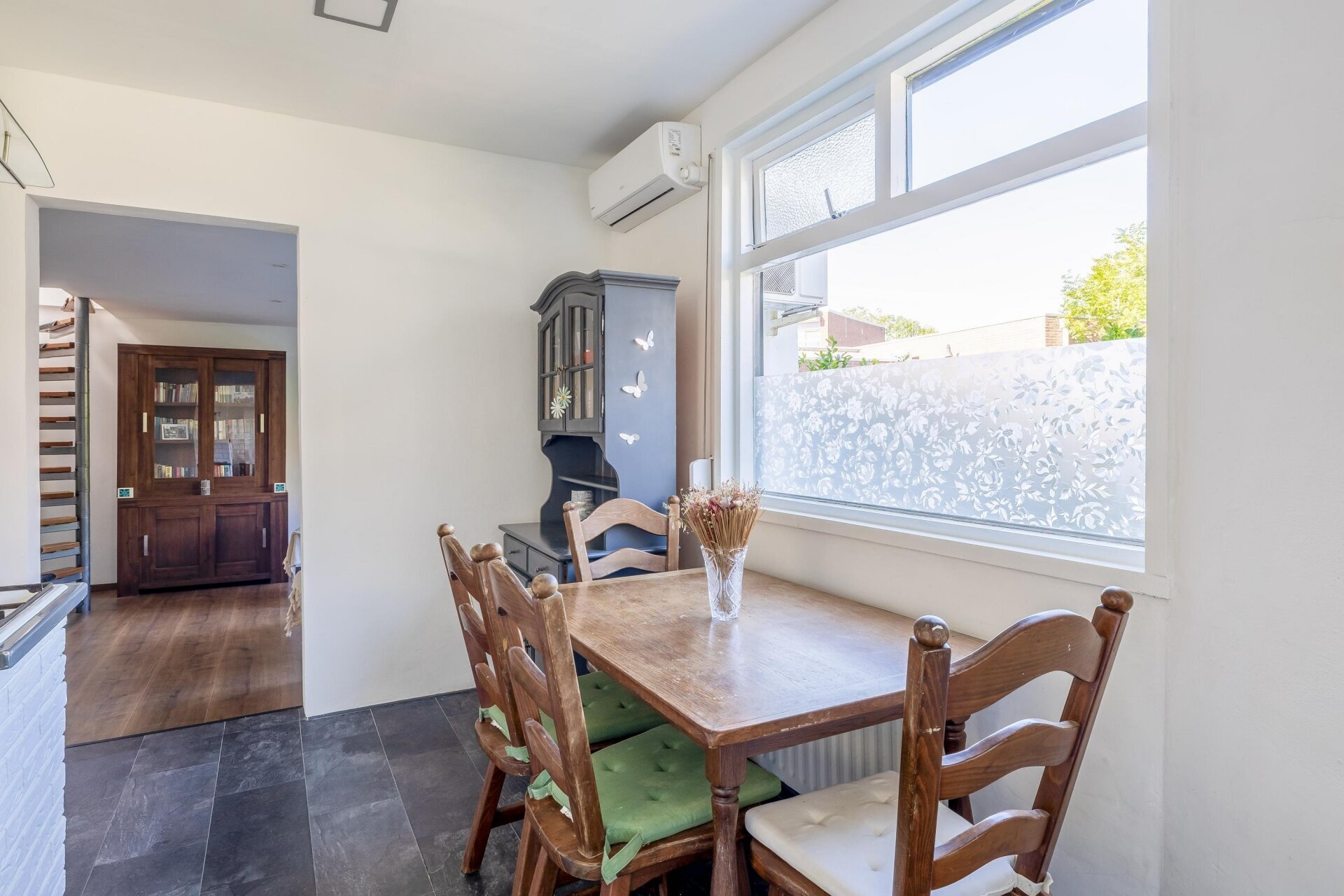 Bij binnenkomst valt meteen de warme, huiselijke sfeer op. De woonkamer is netjes afgewerkt, voorzien van een mooie laminaatvloer en biedt plek voor zowel een gezellige zithoek als een eethoek. De open trap zorgt voor een speelse indeling en benadrukt het lichte karakter van de ruimte.