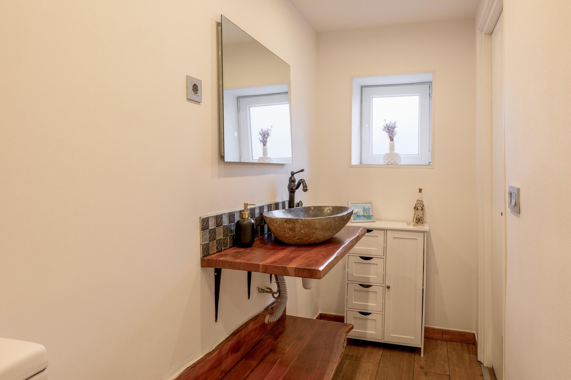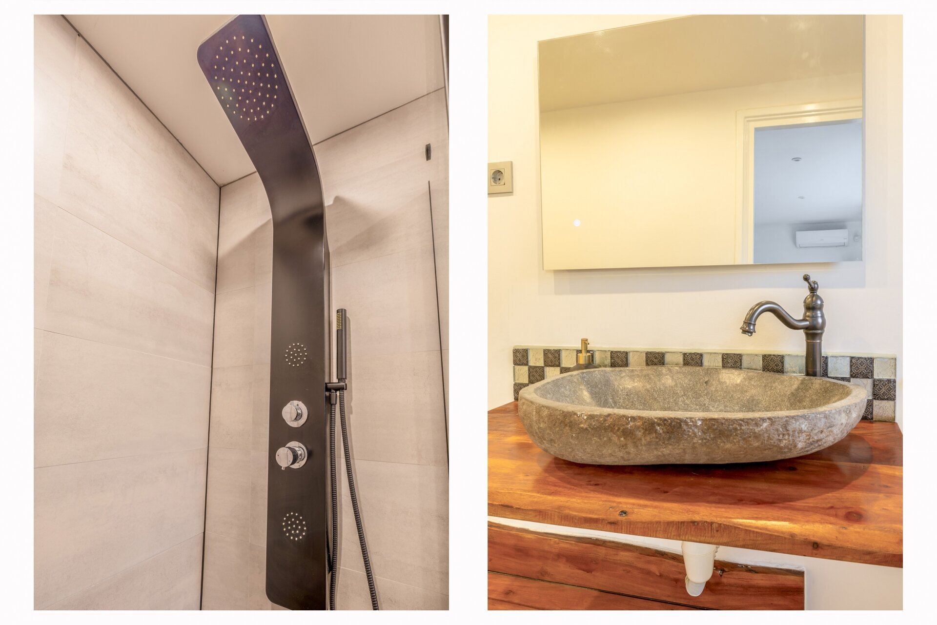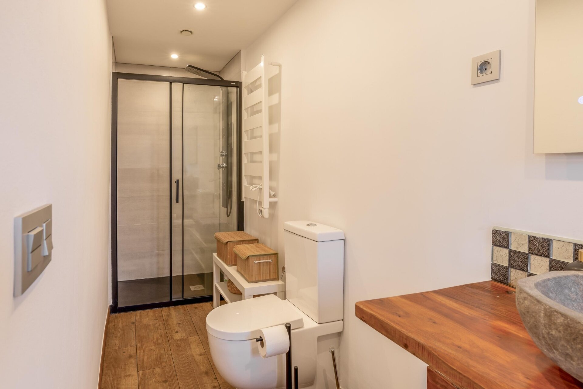 De badkamer op de begane grond (2023) is eenvoudig maar verzorgd, met douche, toilet en wastafel. Alles is netjes onderhouden, waardoor je er zo in kunt trekken.