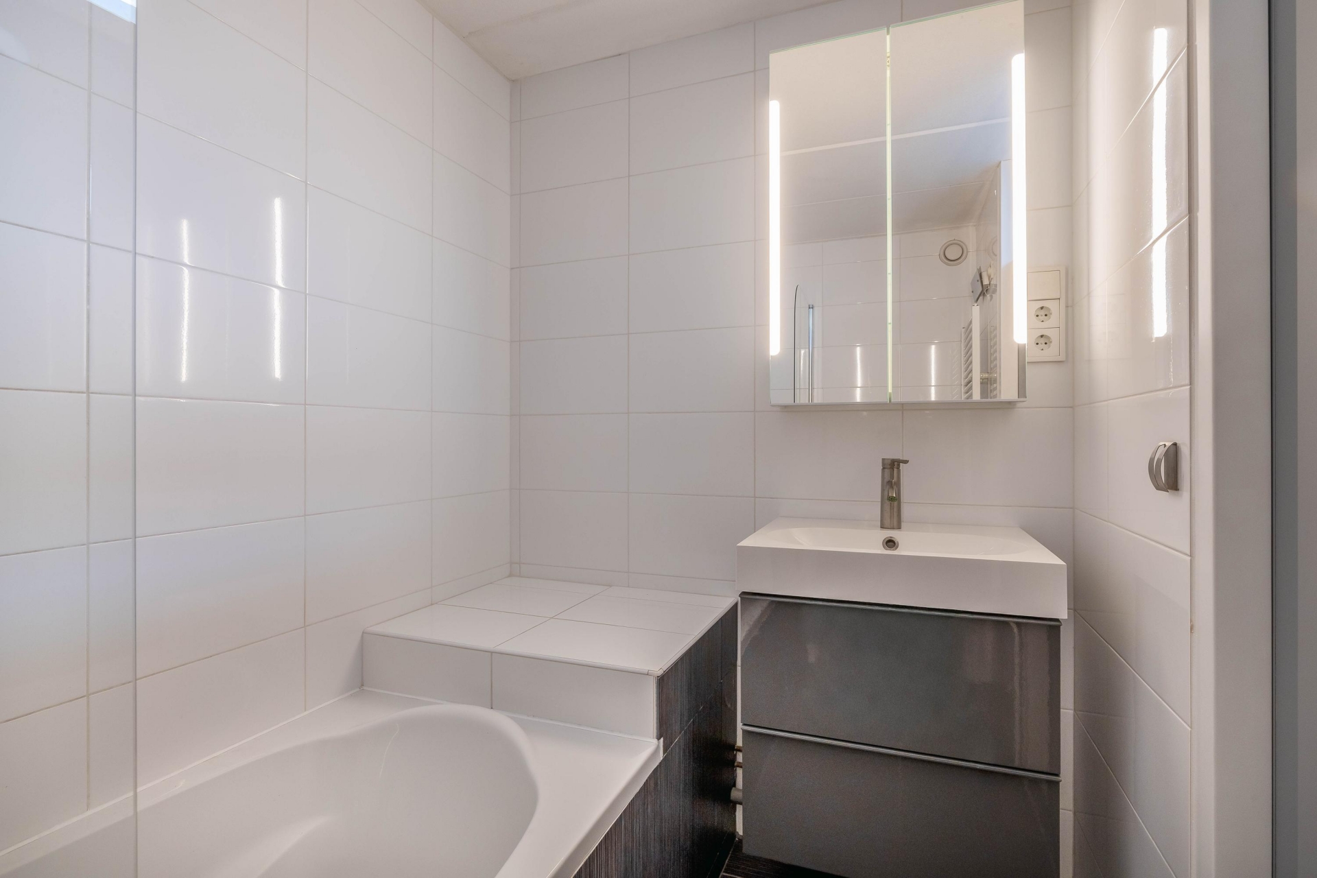 Op de verdieping zijn 2 ruime slaapkamers aan de achterzijde en een woning brede technische ruimte aan de voorzijde. Hier is de opstelling van de wasmachine, droger en cv-ketel (2014). De ruimte biedt nog tal van opbergmogelijkheden. Centraal is de badkamer gelegen. Deze is volledig betegeld en beschikt over een ligbad met douchefunctie, een wastafel met meubel en een radiator voor de handdoeken. Aan daglichttoetreding is ook gedacht, de overloop beschikt over een lichtkoepel in het plafond. Samengevat, een compleet appartement!