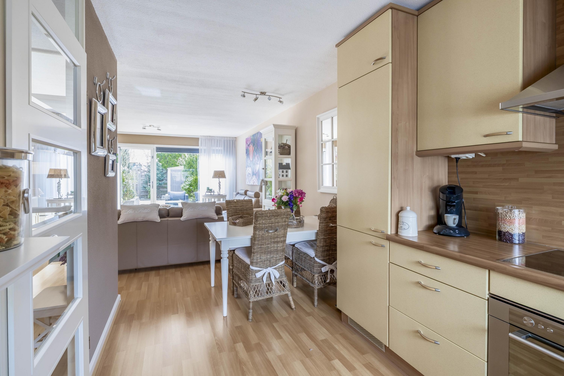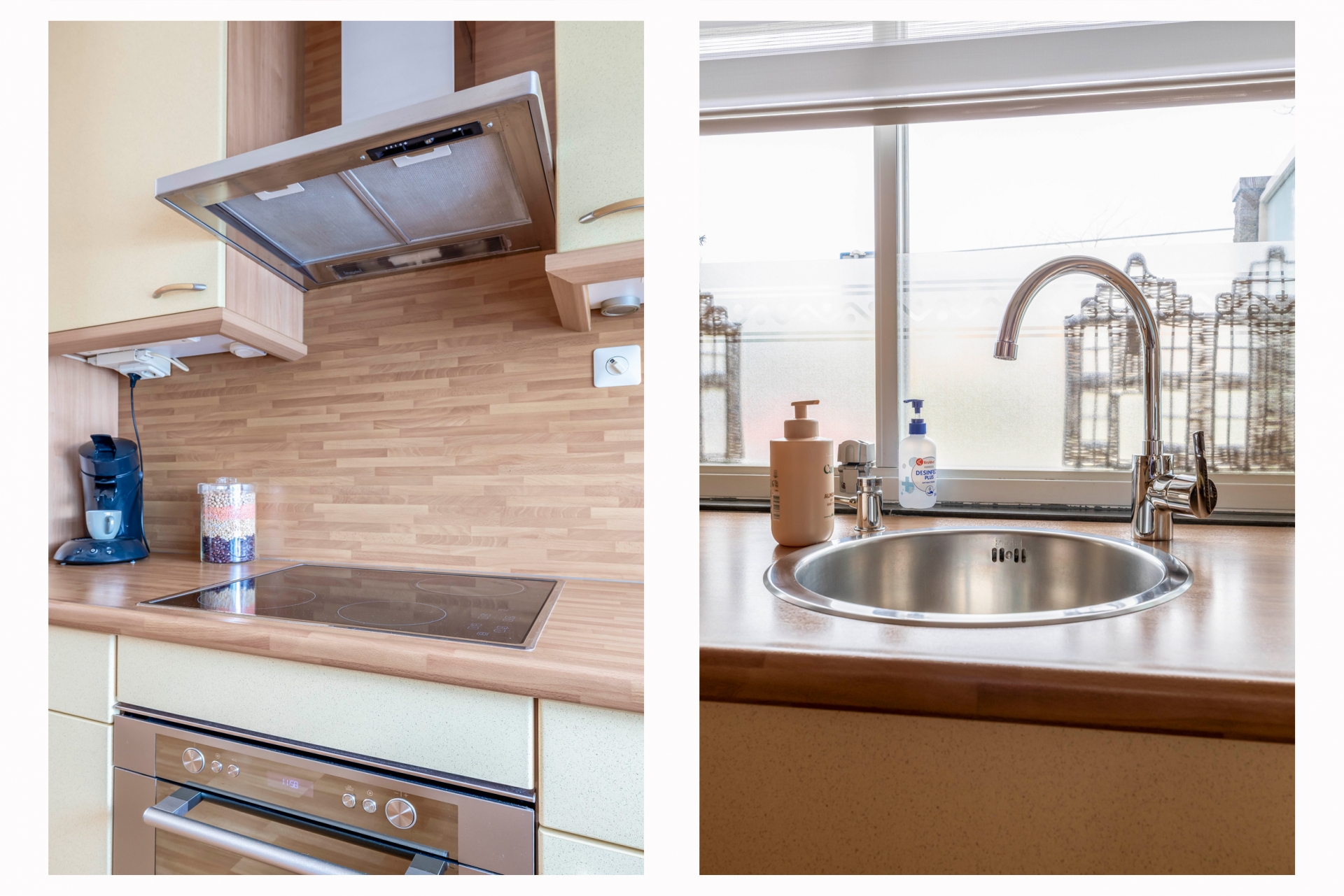 De keuken is aan de voorzijde van de woning gelegen en opgesteld in een L-vorm. Deze is voorzien van diverse inbouwapparatuur en biedt voldoende werk- en opbergruimte.