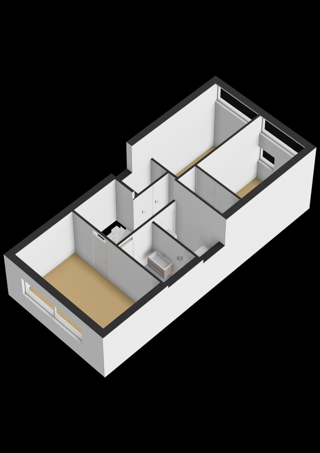 De overloop geeft toegang tot alle vertrekken. Aan de achterzijde bevinden zich twee slaapkamers van circa 10 m² en 8 m².