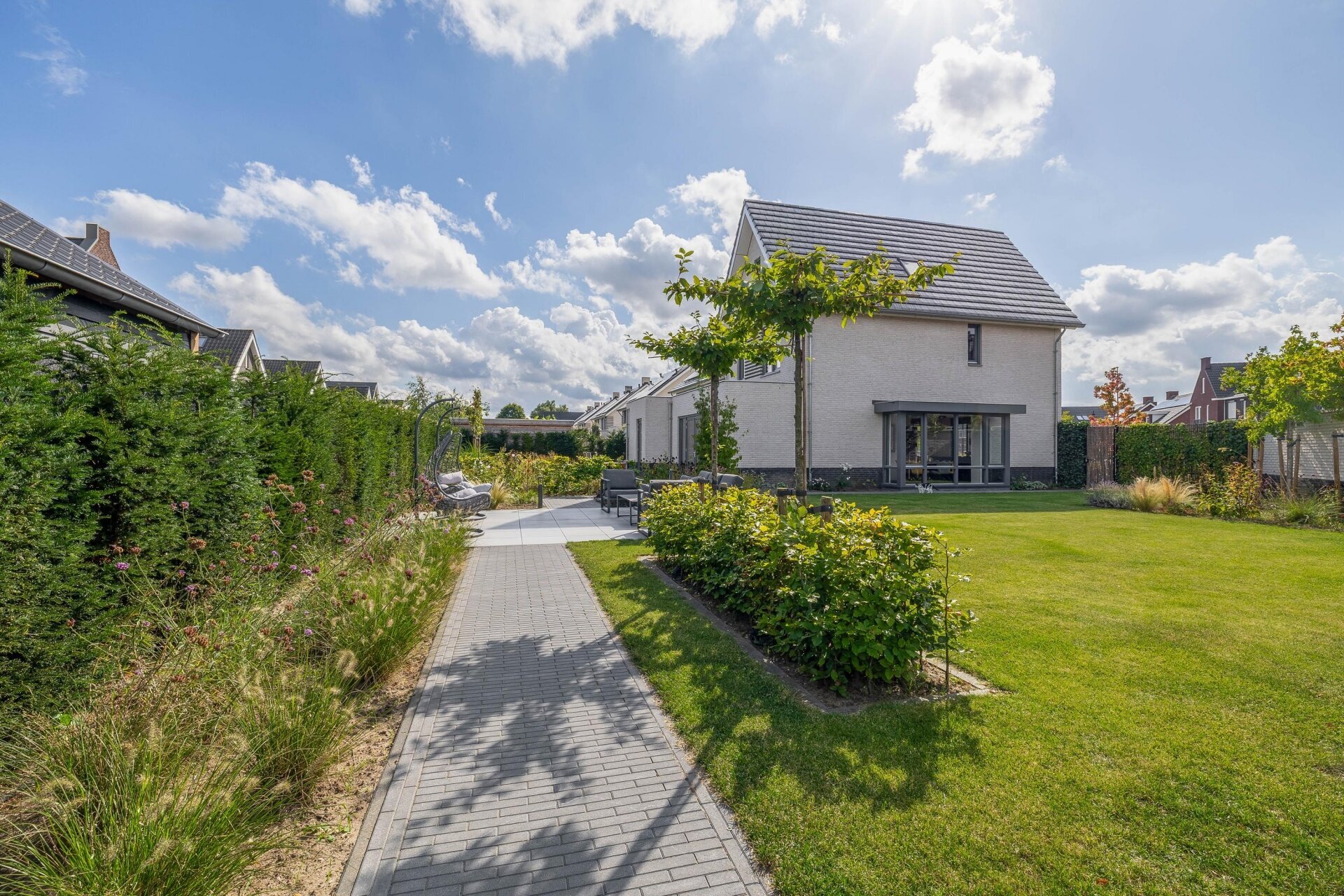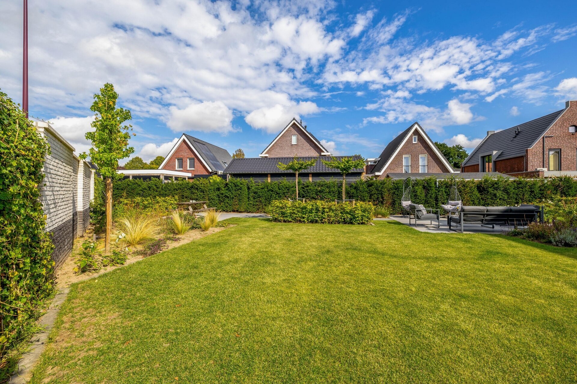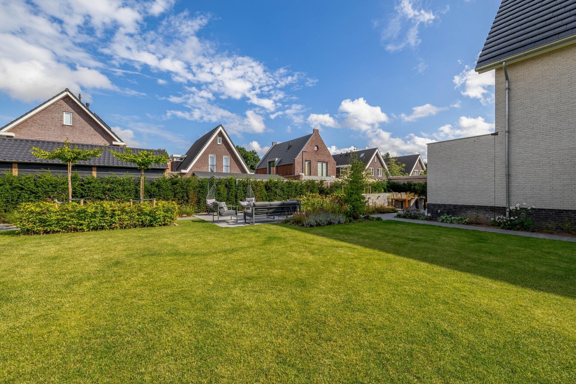De tuin is modern aangelegd met meerdere terrassen, een strak gazon en volwassen beplanting. Er staat geen aparte berging in de tuin, maar dankzij de aangebouwde garage heb je voldoende praktische opbergruimte. De brede oprit biedt plaats aan circa vier auto’s op eigen terrein.