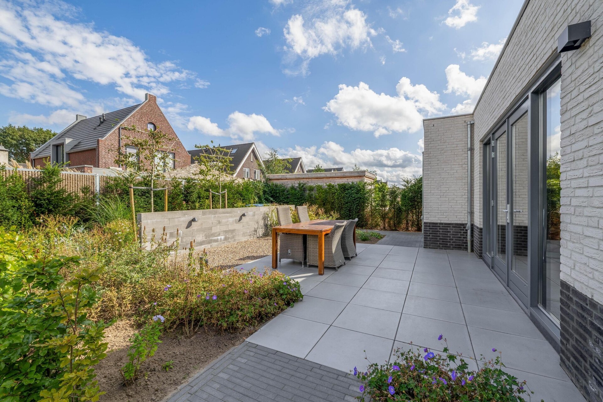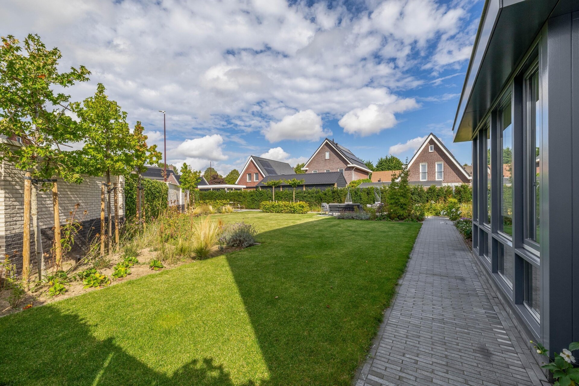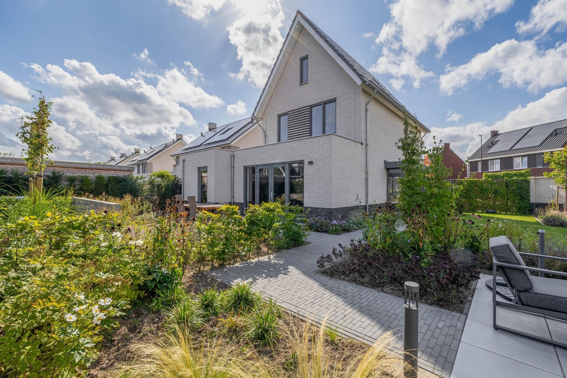 De tuin is modern aangelegd met meerdere terrassen, een strak gazon en volwassen beplanting. Er staat geen aparte berging in de tuin, maar dankzij de aangebouwde garage heb je voldoende praktische opbergruimte. De brede oprit biedt plaats aan circa vier auto’s op eigen terrein.