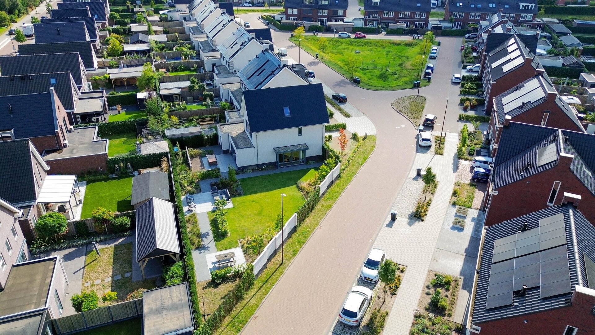 De gevels zijn fris wit gemetseld, wat mooi contrasteert met het zwarte pannendak en de donkere kozijnen. De ligging aan een rustige straat in een kindvriendelijke woonwijk maakt dit huis bijzonder aantrekkelijk voor doorstromers die meer ruimte én comfort zoeken.