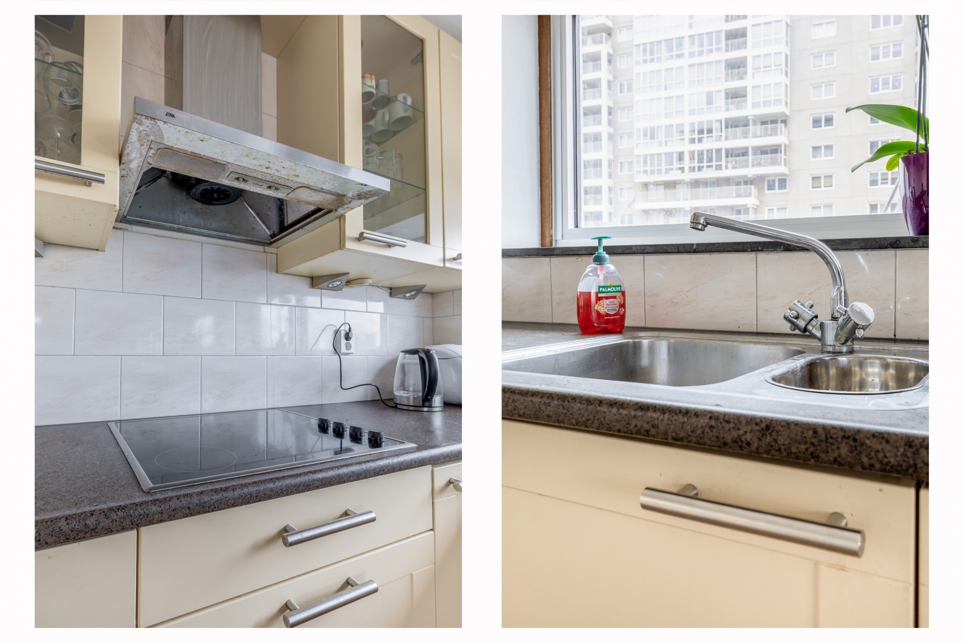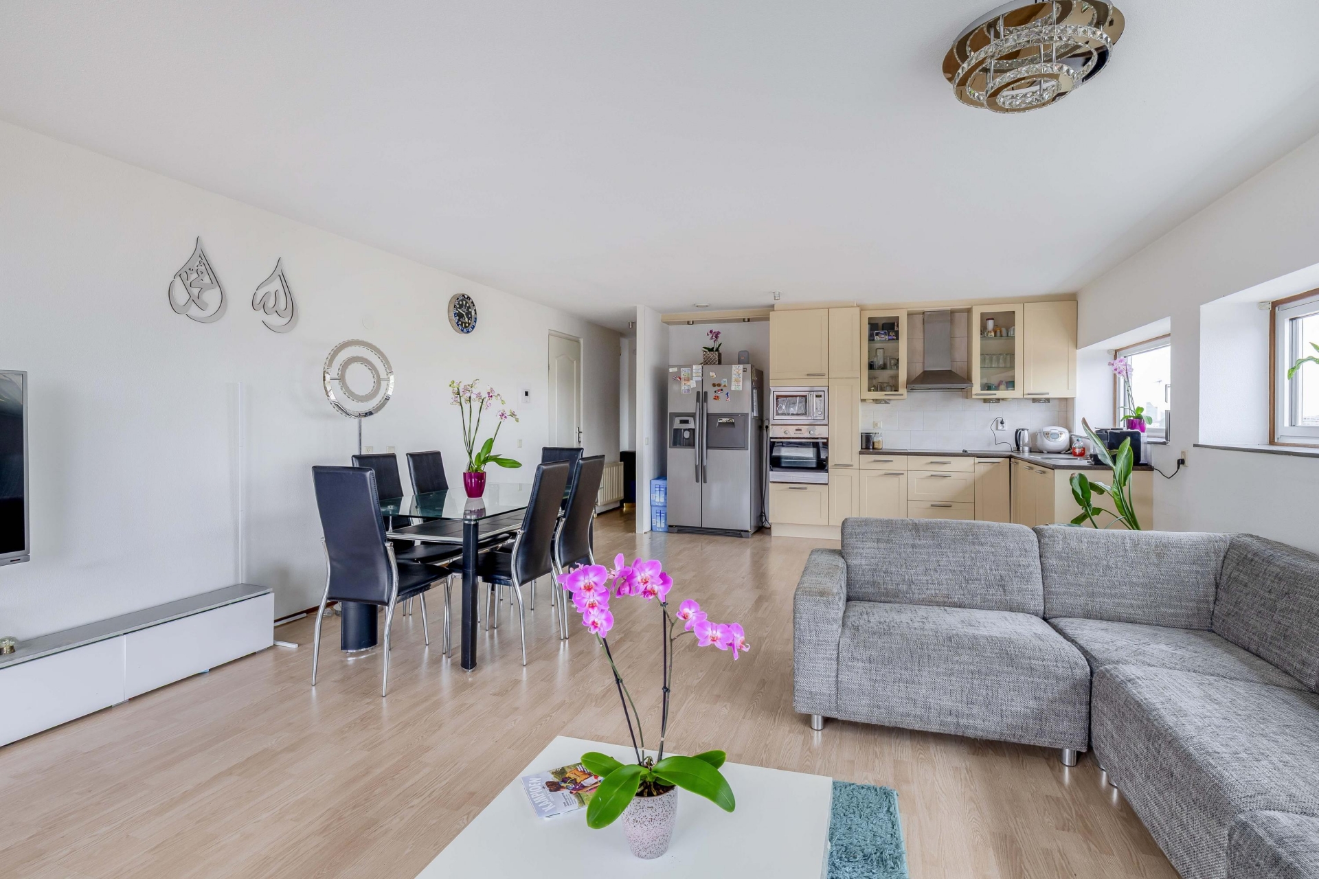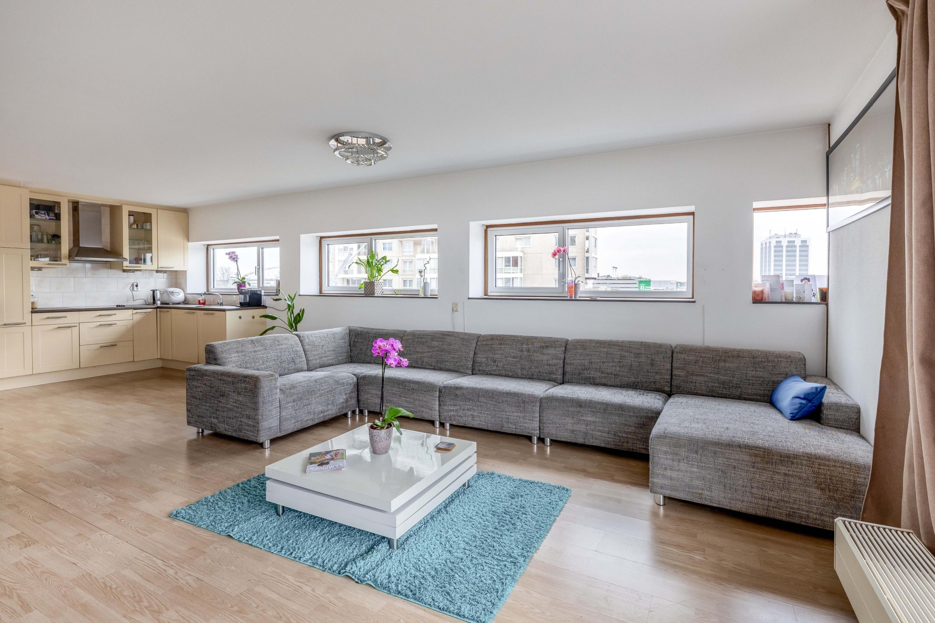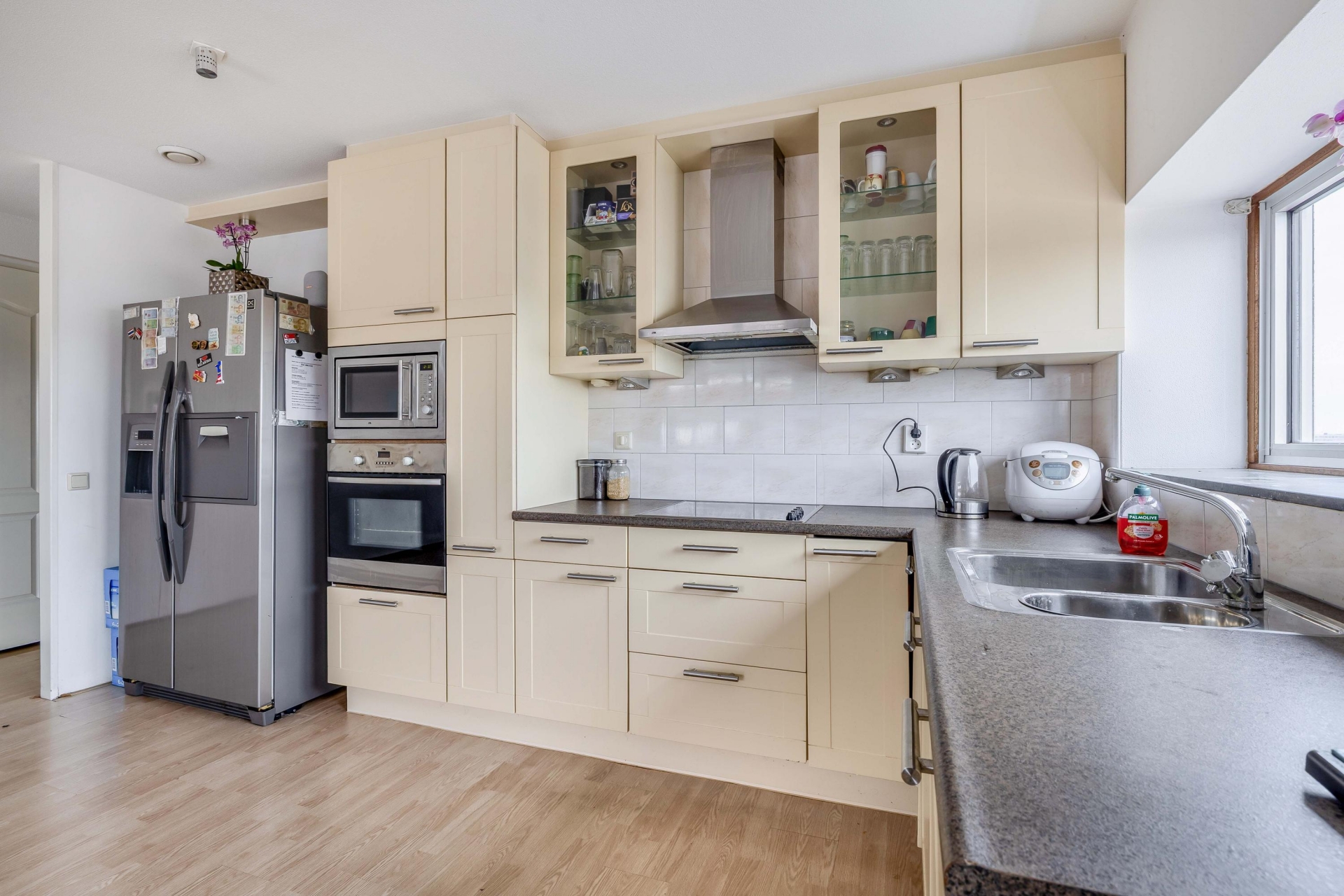 Zodra je de woonkamer binnenstapt valt het licht direct op. De grote raampartijen en de ligging op de vierde verdieping zorgen voor een open en vrij gevoel. Hier richt je met gemak een comfortabele zithoek en een eethoek in, zonder concessies te doen aan ruimte. De woonkamer staat in directe verbinding met het terras, wat echt een verlengstuk van je leefruimte vormt. Het terras is ruim opgezet en ligt op het zuiden, waardoor je hier een groot deel van de dag van de zon kunt genieten. Er is voldoende plek voor een loungeset én een eettafel, wat het ideaal maakt voor zowel ontspannen momenten als gezellige avonden met vrienden. De beschutte ligging en het vrije uitzicht geven het geheel extra kwaliteit. De open keuken sluit naadloos aan op de woonkamer en heeft een praktische L-opstelling. Hier heb je alles bij de hand tijdens het koken, terwijl je toch contact houdt met de woonkamer. De opstelling is overzichtelijk en functioneel, precies wat je zoekt in een appartement als dit.