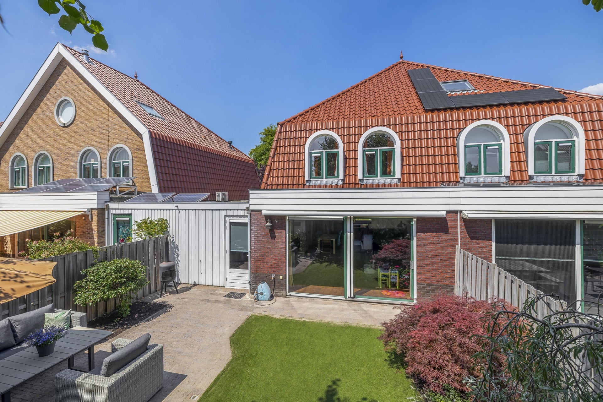 De achtertuin beschikt over een elektrisch zonnescherm en een kunststof blokhut. Dankzij de royale afmetingen van de achtertuin kunt u de hele dag kiezen voor een heerlijke plek in de zon of juist in de schaduw.