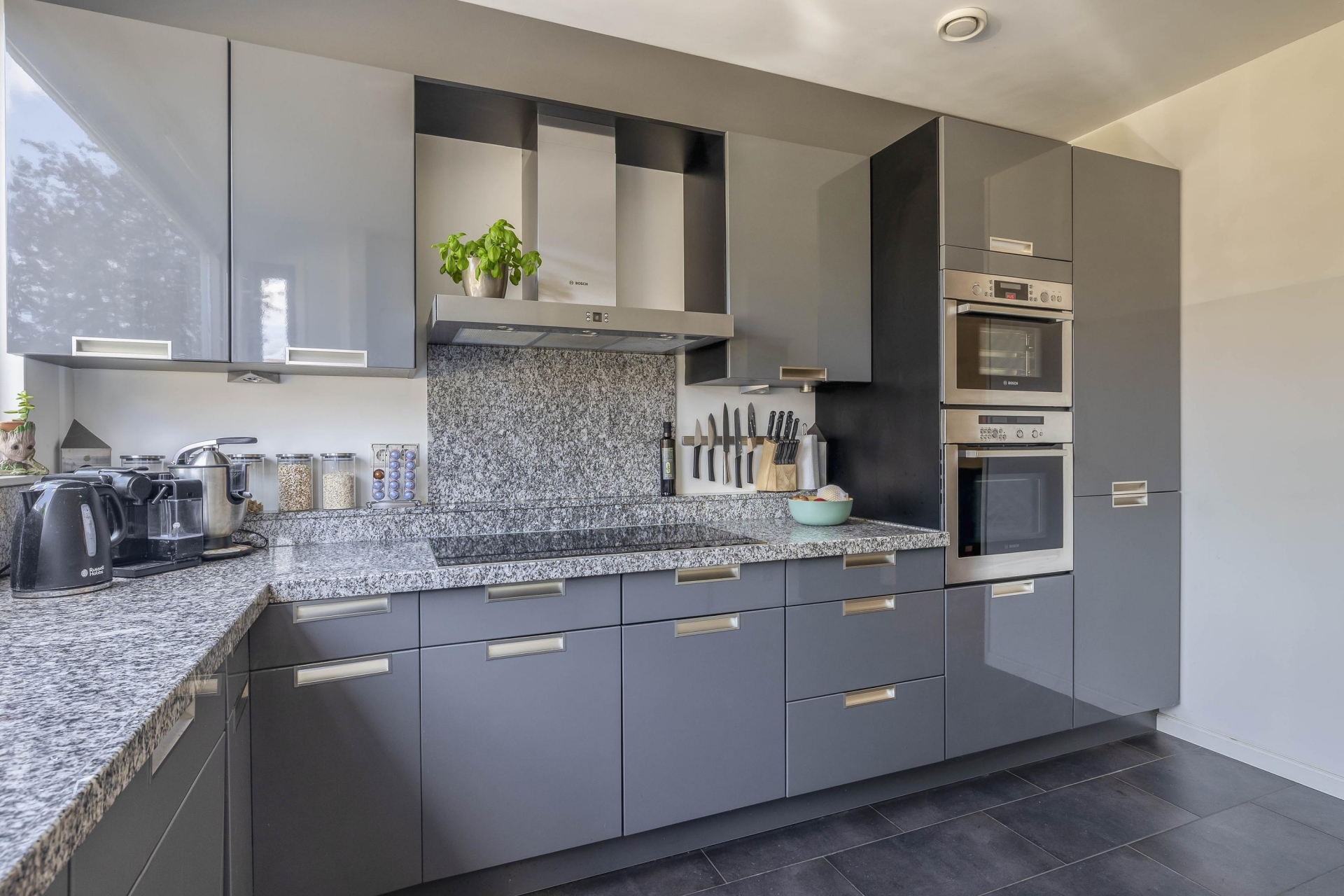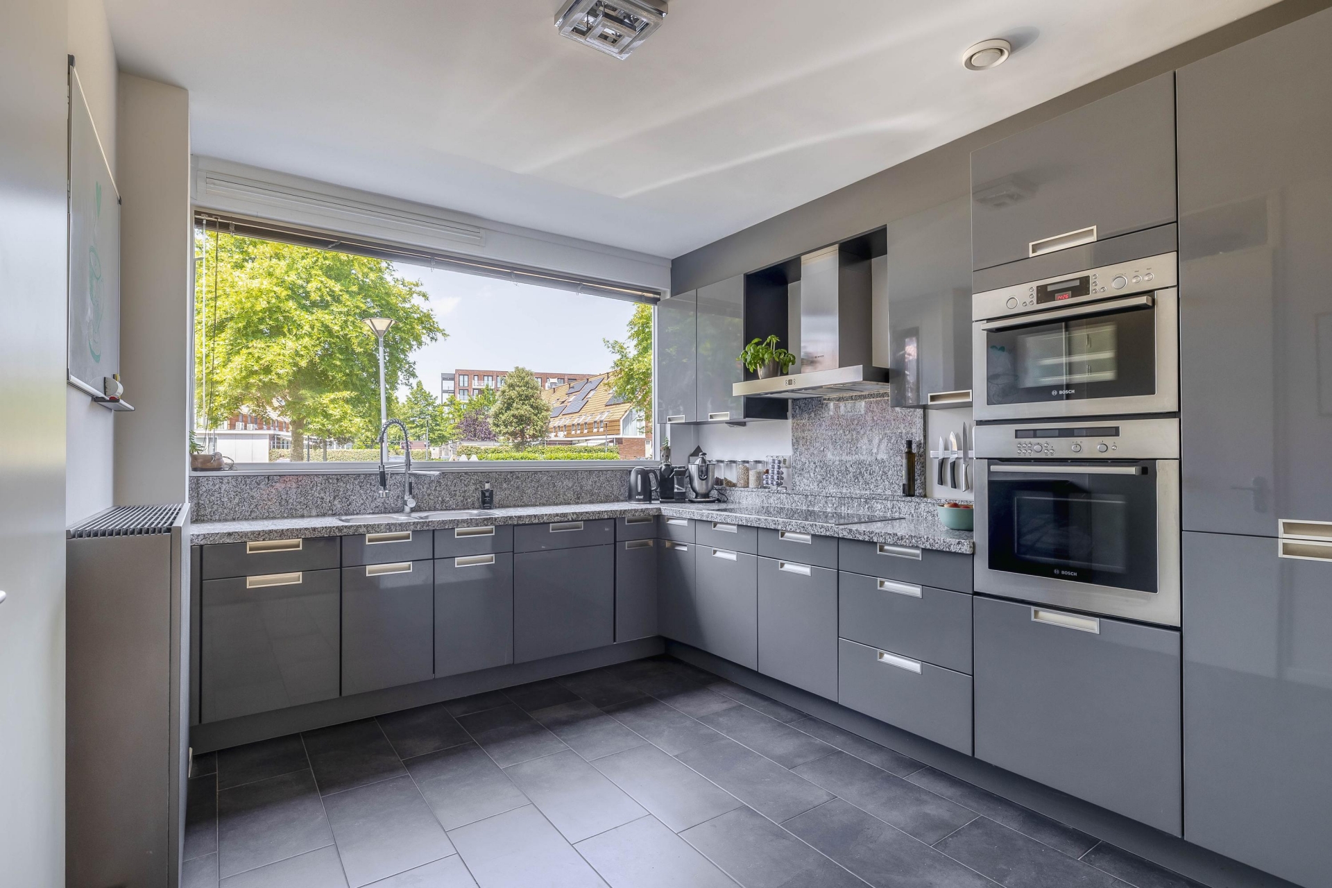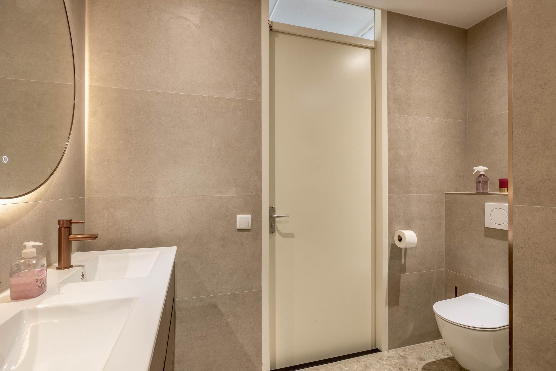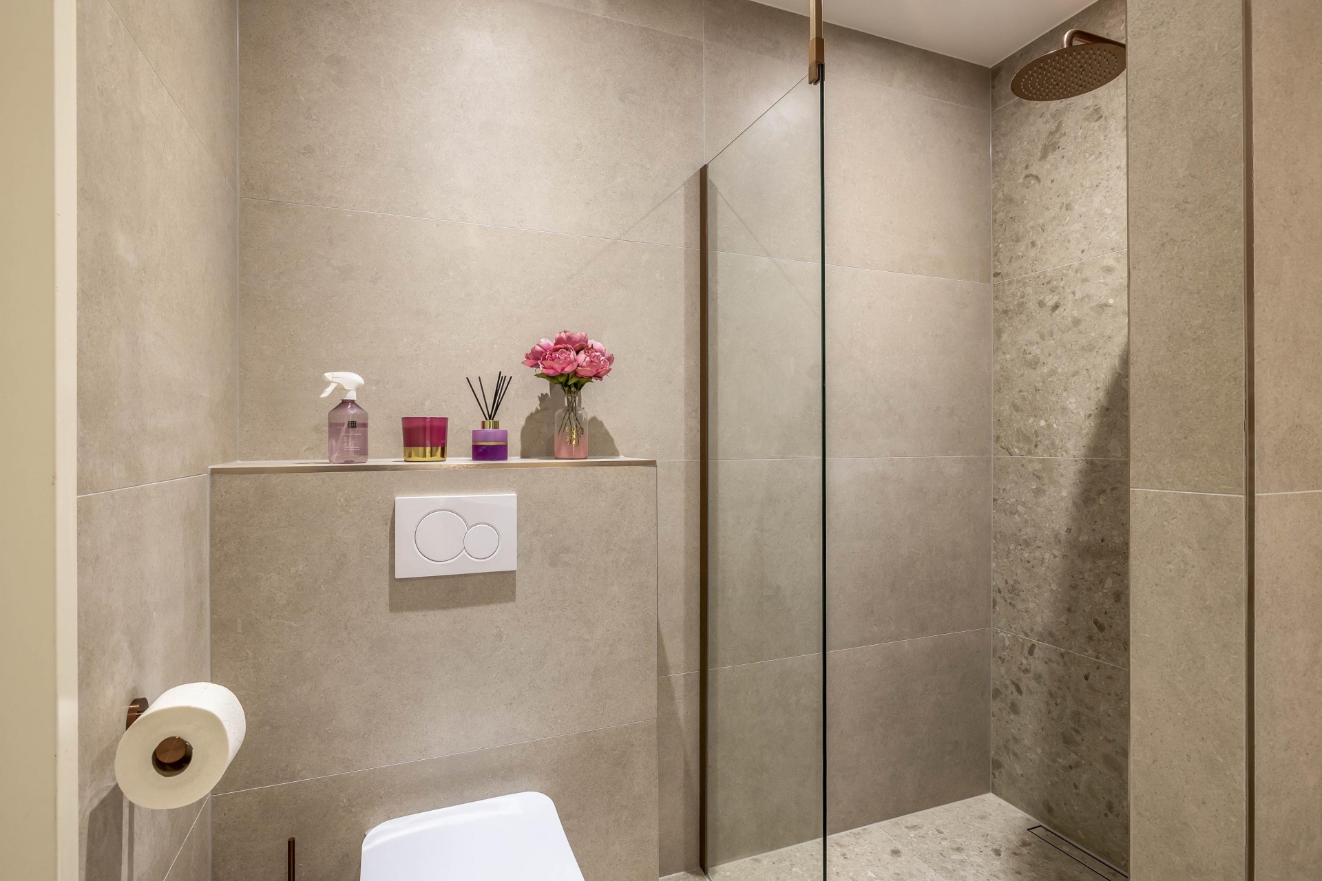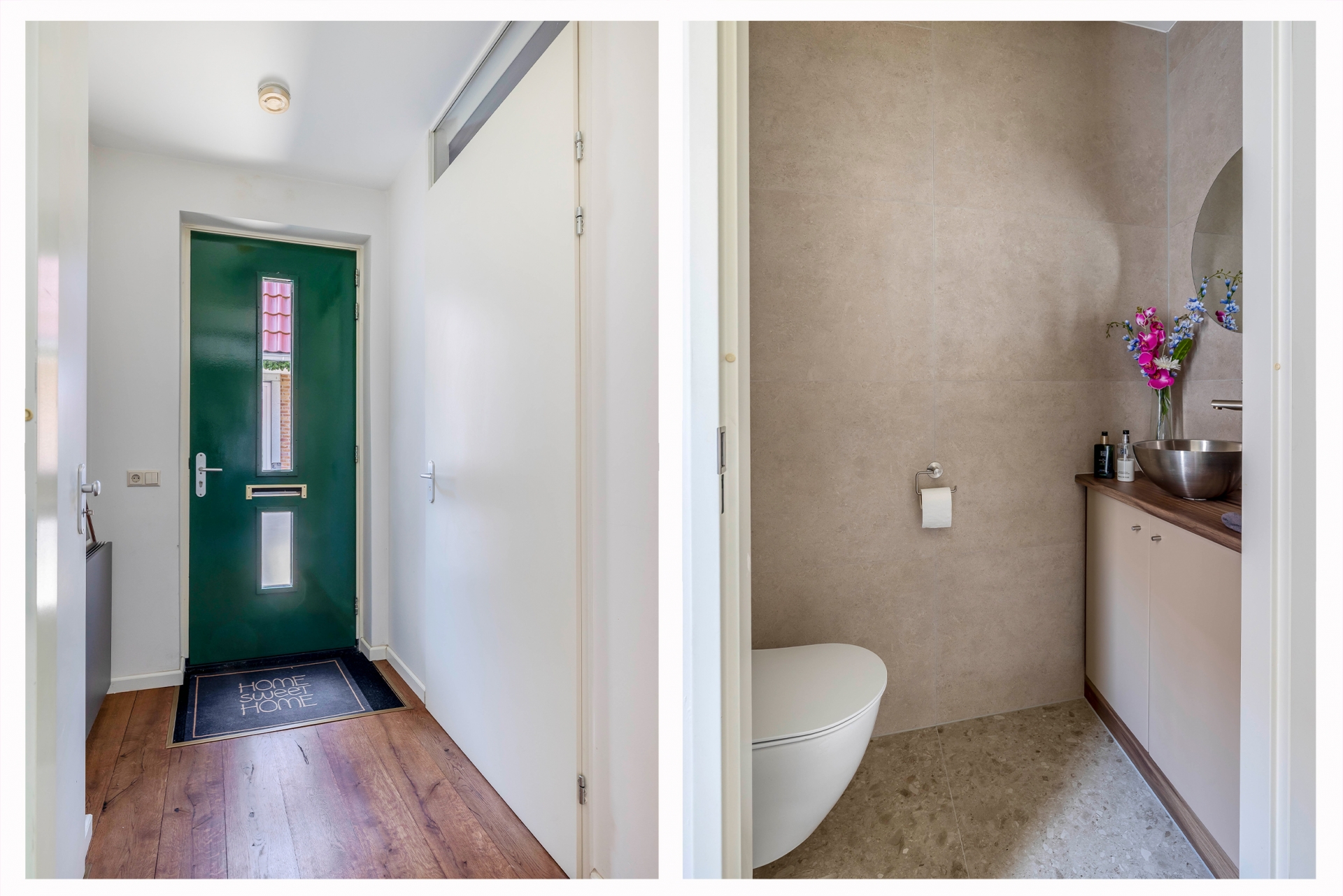 Ruime hal met garderobe, meterkast (stadsverwarming) en luxe toiletruimte met fontein (2025). Aan de voorzijde bevindt zich de open keuken in L-opstelling, uitgevoerd met een natuurstenen werkblad en compleet met een vaatwasser, 5 pits inductie kookplaat, afzuigschouw, koel-vriescombinatie, stoomoven, en combi-oven.