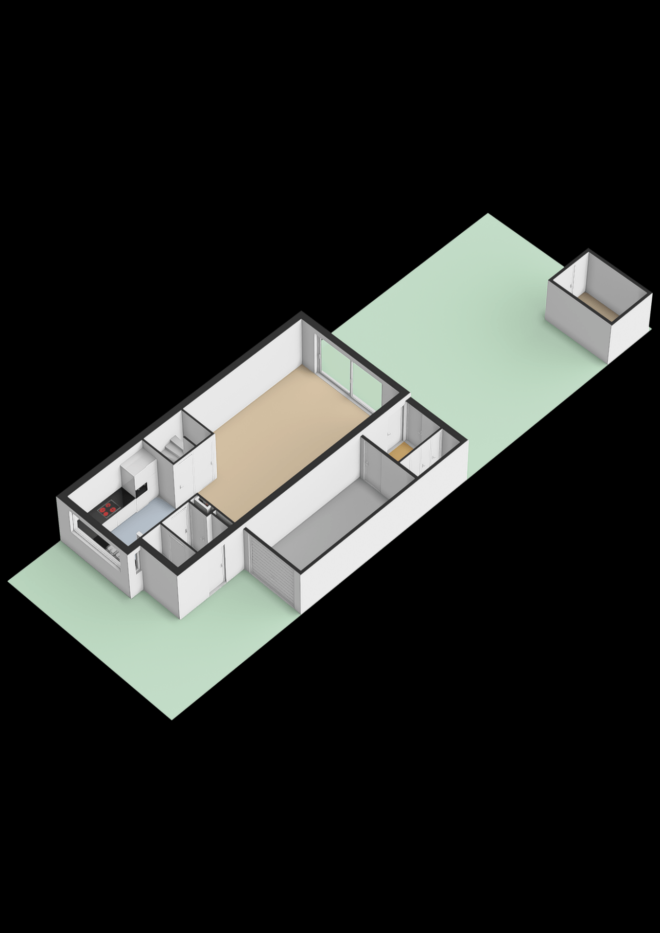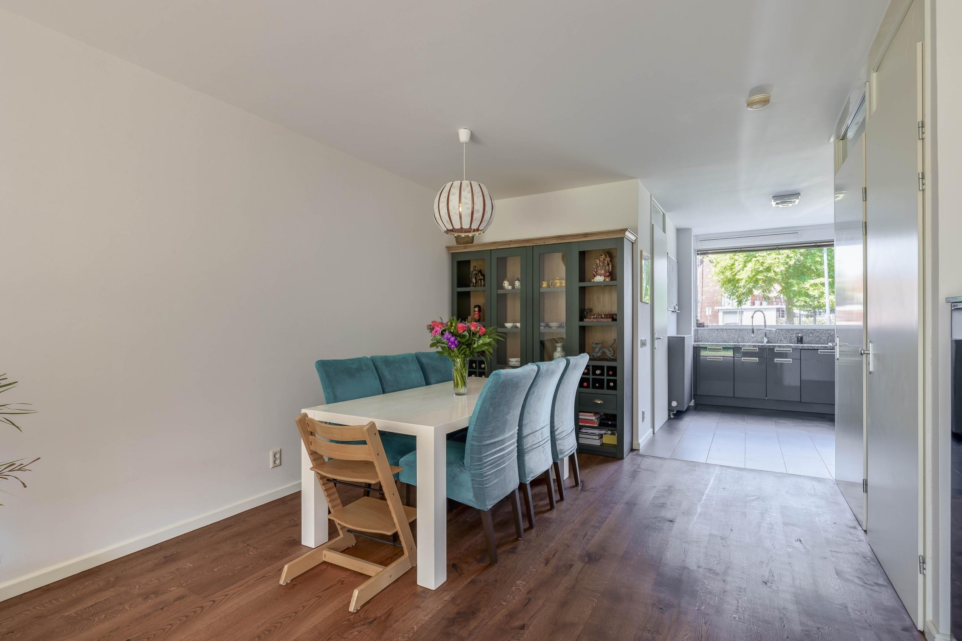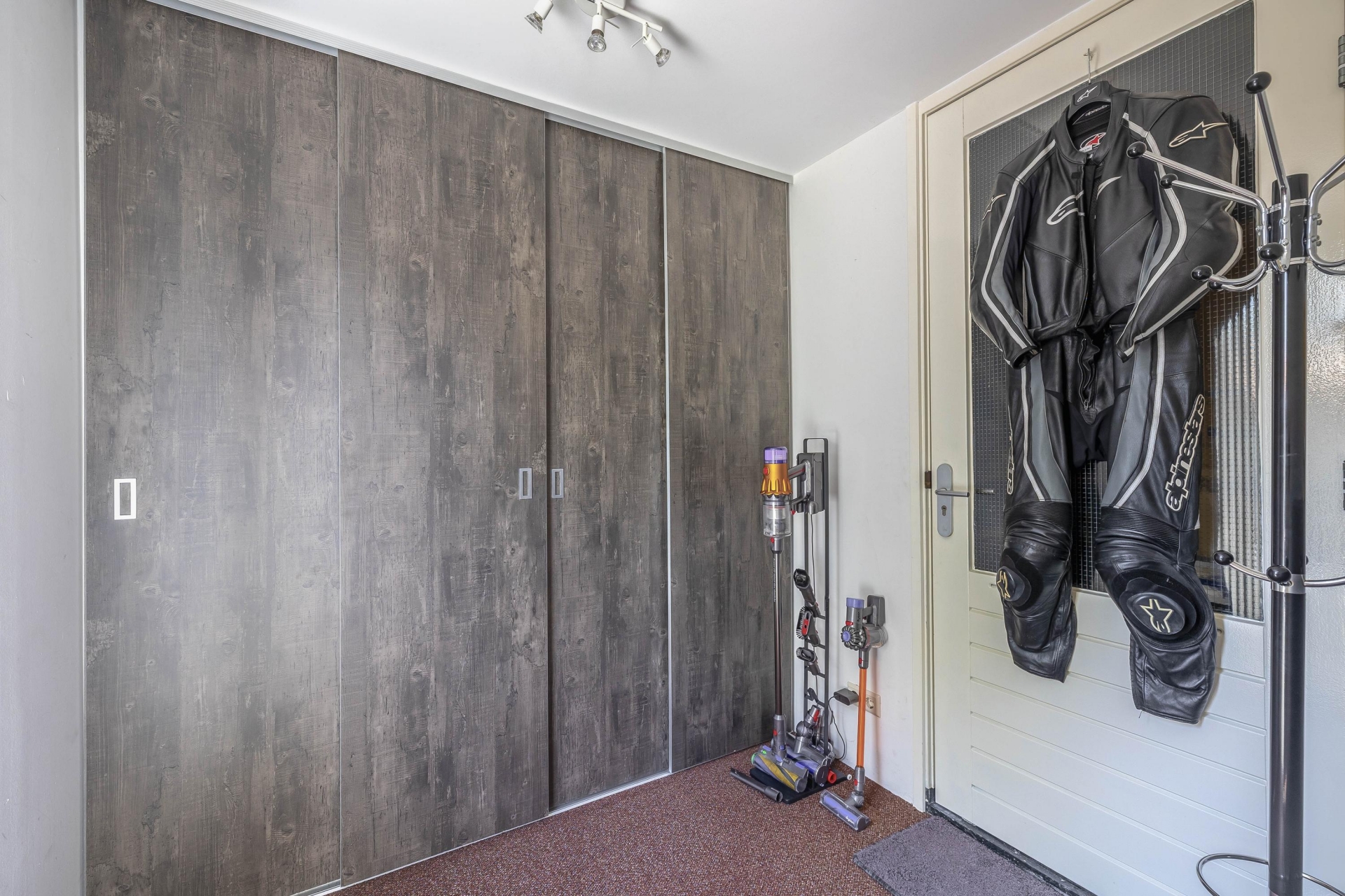 De lichte, uitgebouwde woonkamer is voorzien van een trapkast en een schuifpui naar de zonnige achtertuin op het zuidoosten. Vanuit de woonkamer is er toegang tot een multifunctionele zijkamer (momenteel garderobe-/werkkamer) en aansluitend de garage met handmatige garagedeur.