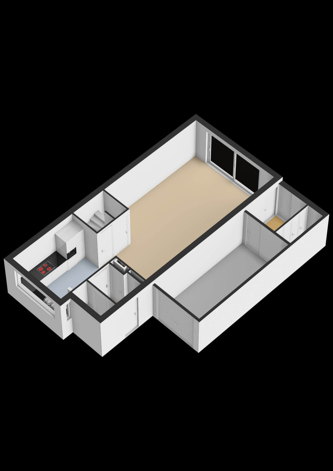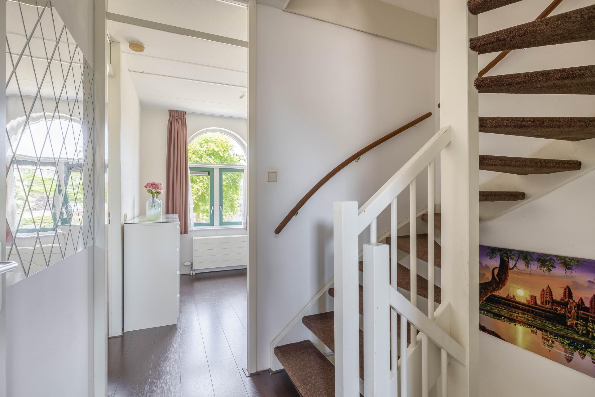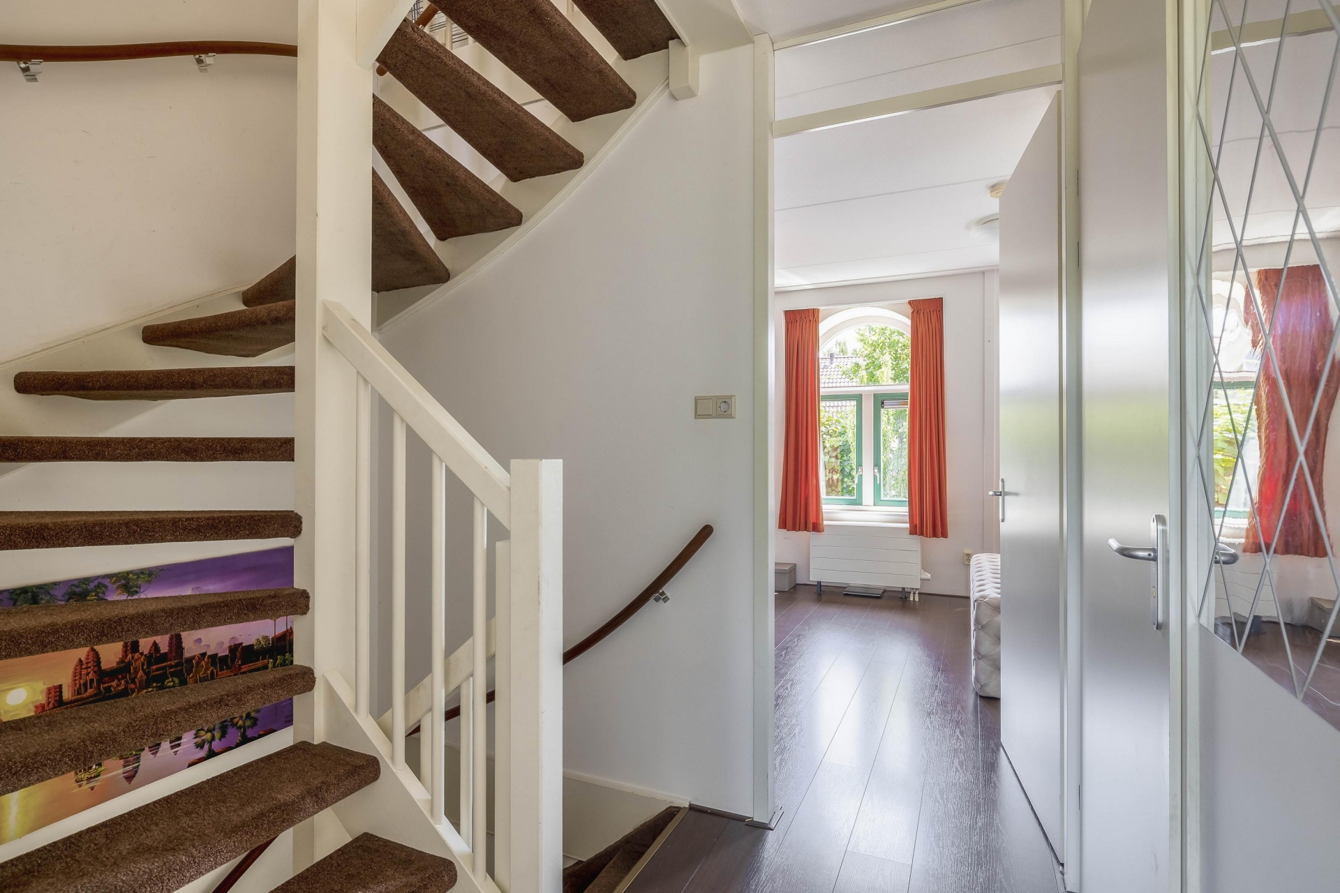 De lichte, uitgebouwde woonkamer is voorzien van een trapkast en een schuifpui naar de zonnige achtertuin op het zuidoosten. Vanuit de woonkamer is er toegang tot een multifunctionele zijkamer (momenteel garderobe-/werkkamer) en aansluitend de garage met handmatige garagedeur.