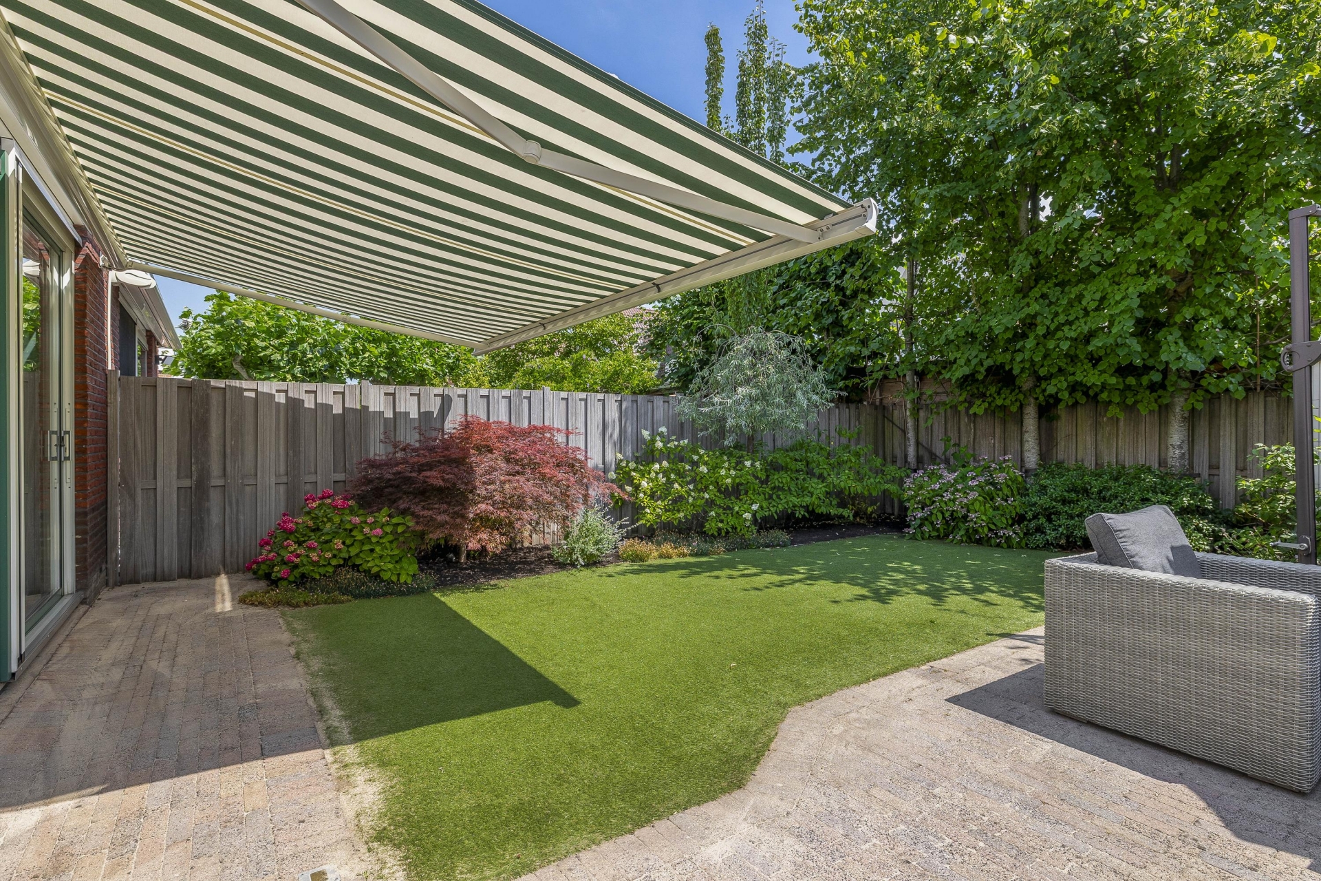 De achtertuin beschikt over een elektrisch zonnescherm en een kunststof blokhut. Dankzij de royale afmetingen van de achtertuin kunt u de hele dag kiezen voor een heerlijke plek in de zon of juist in de schaduw.