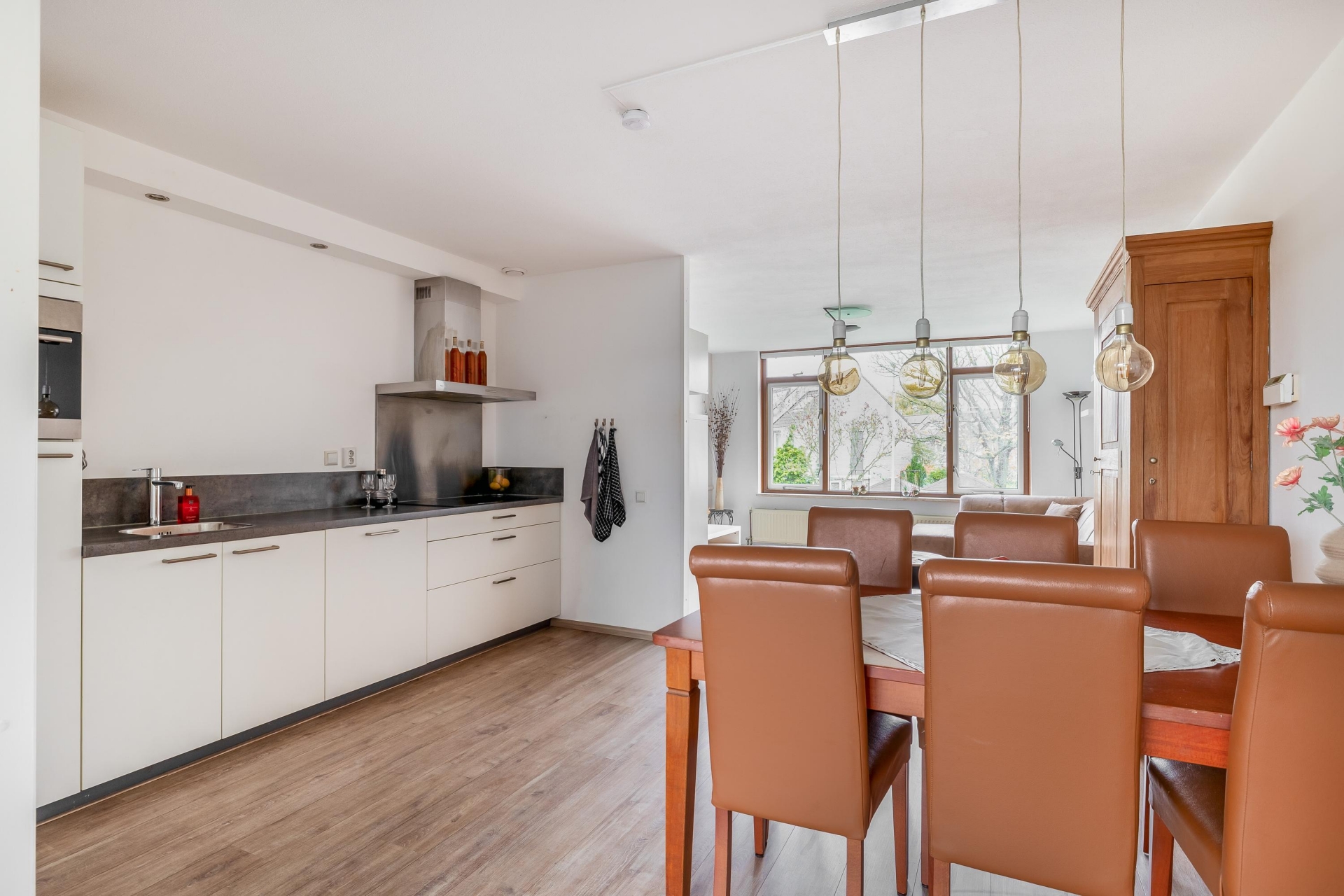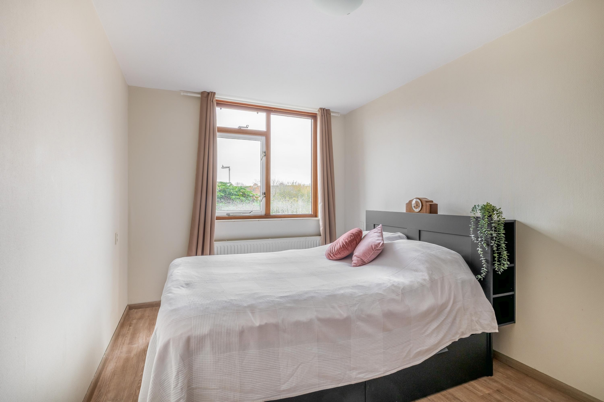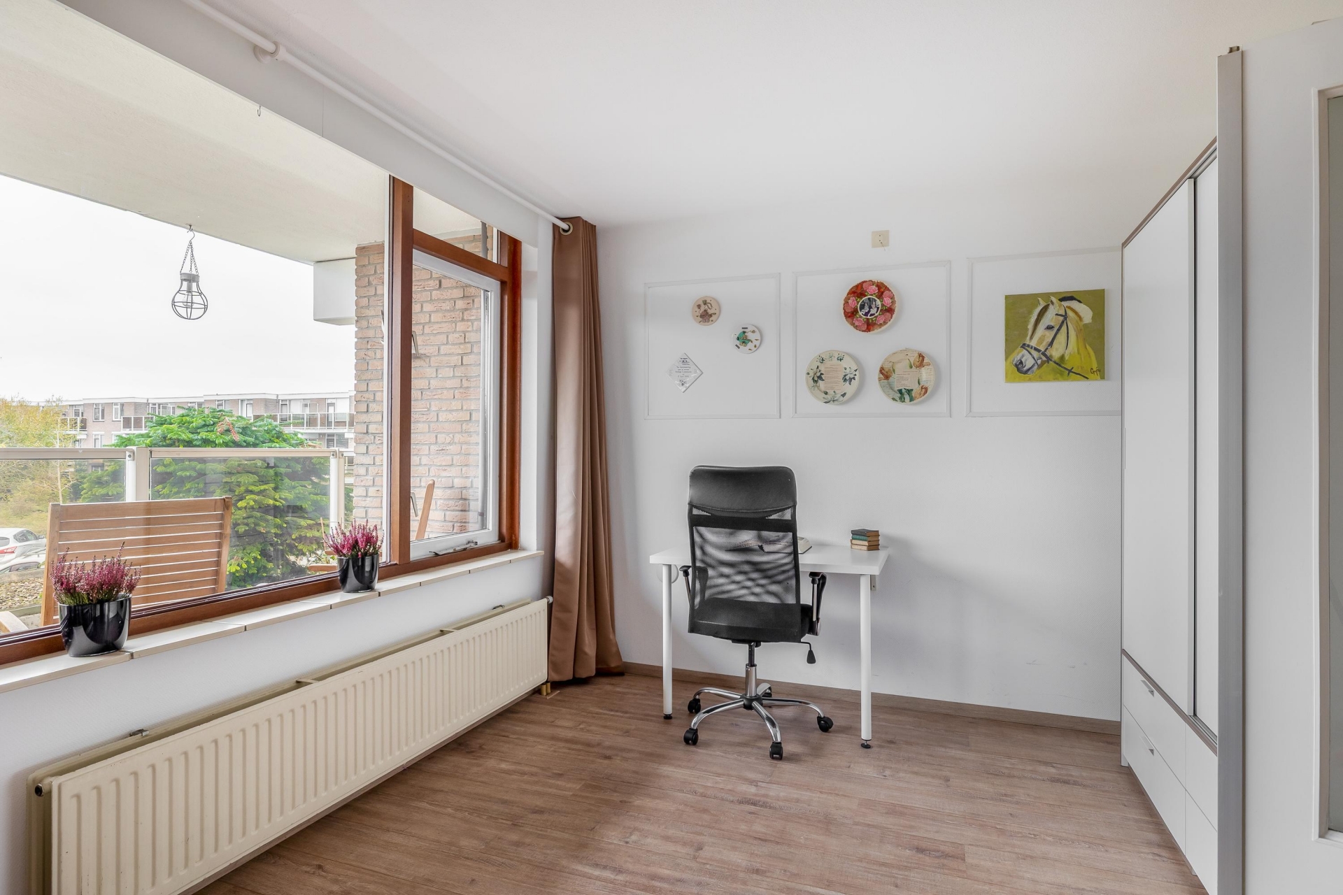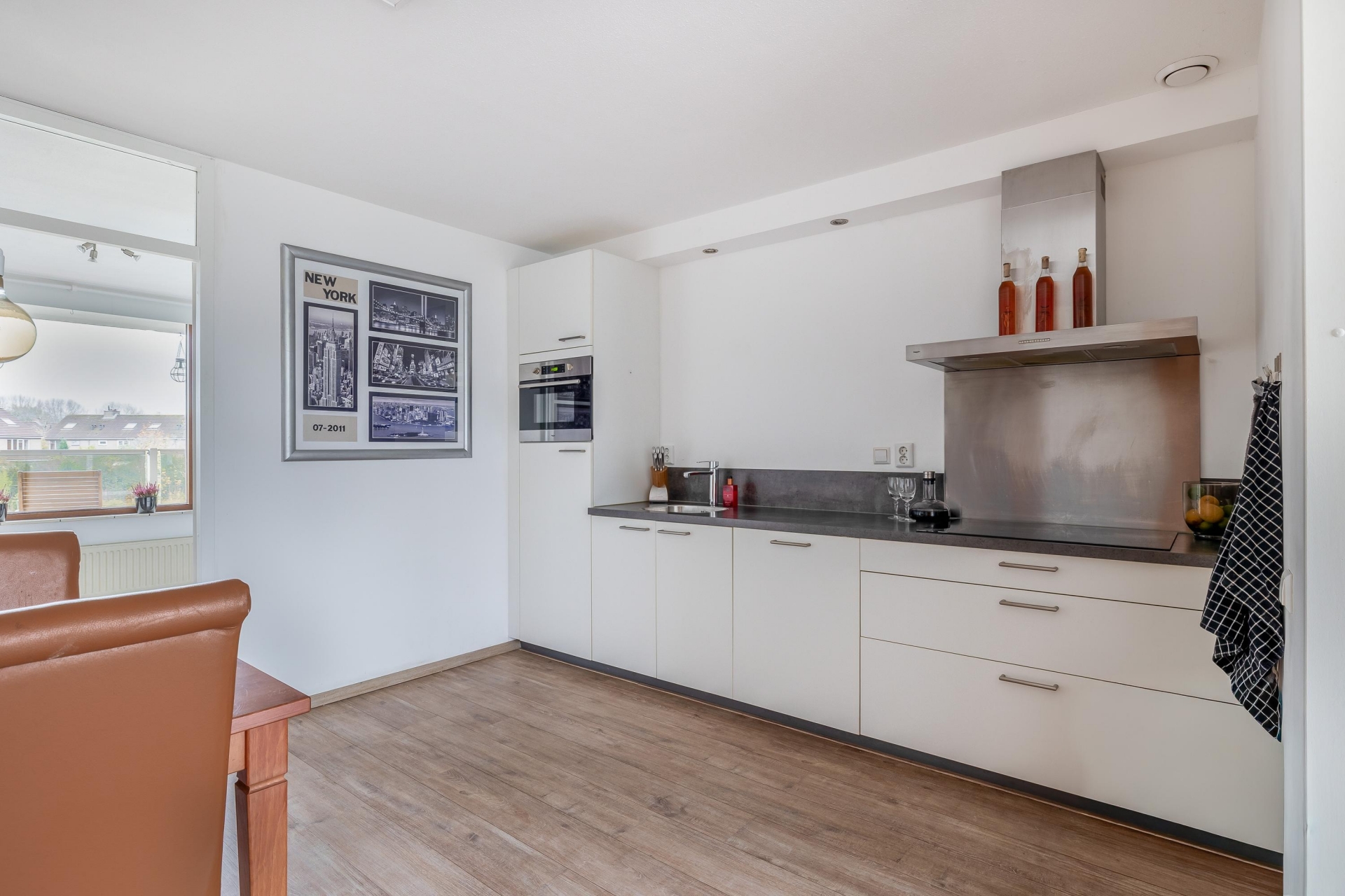 De woonkamer is een fijne, open ruimte met plek voor een royale zithoek én een gezellige eethoek. Dankzij de grote raampartijen valt het daglicht rijkelijk naar binnen. Via de slaapkamer aan de achterzijde stap je zo het balkon op, gelegen op het zuidoosten. Perfect voor een kop koffie in de ochtendzon of juist om ’s middags van het zonnetje te genieten. De warme kleur van de laminaatvloer zorgt voor een gezellige sfeer en een rustige basis voor elke woonstijl.