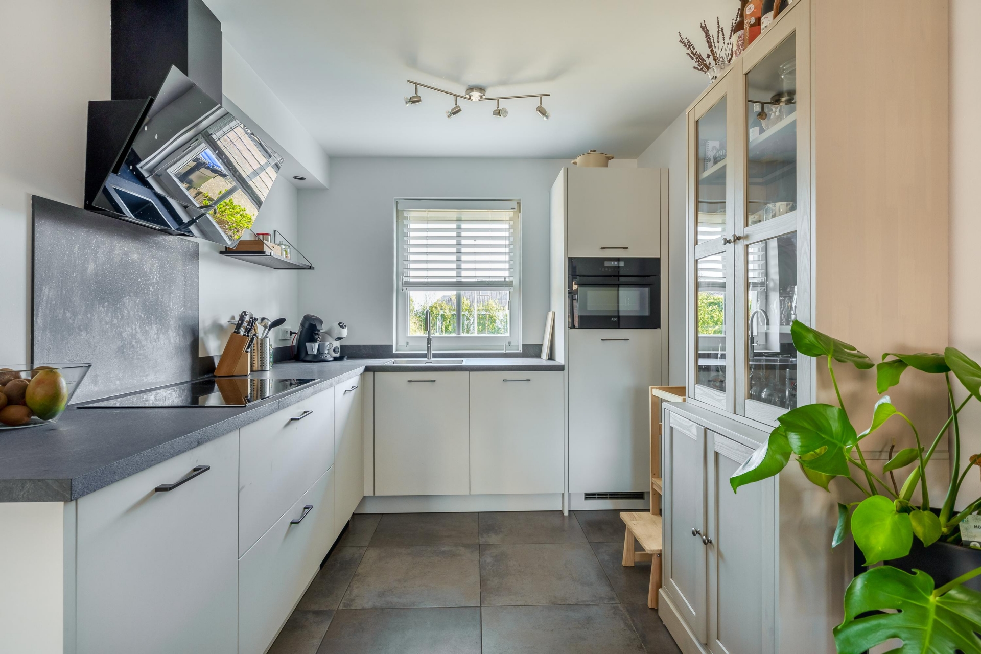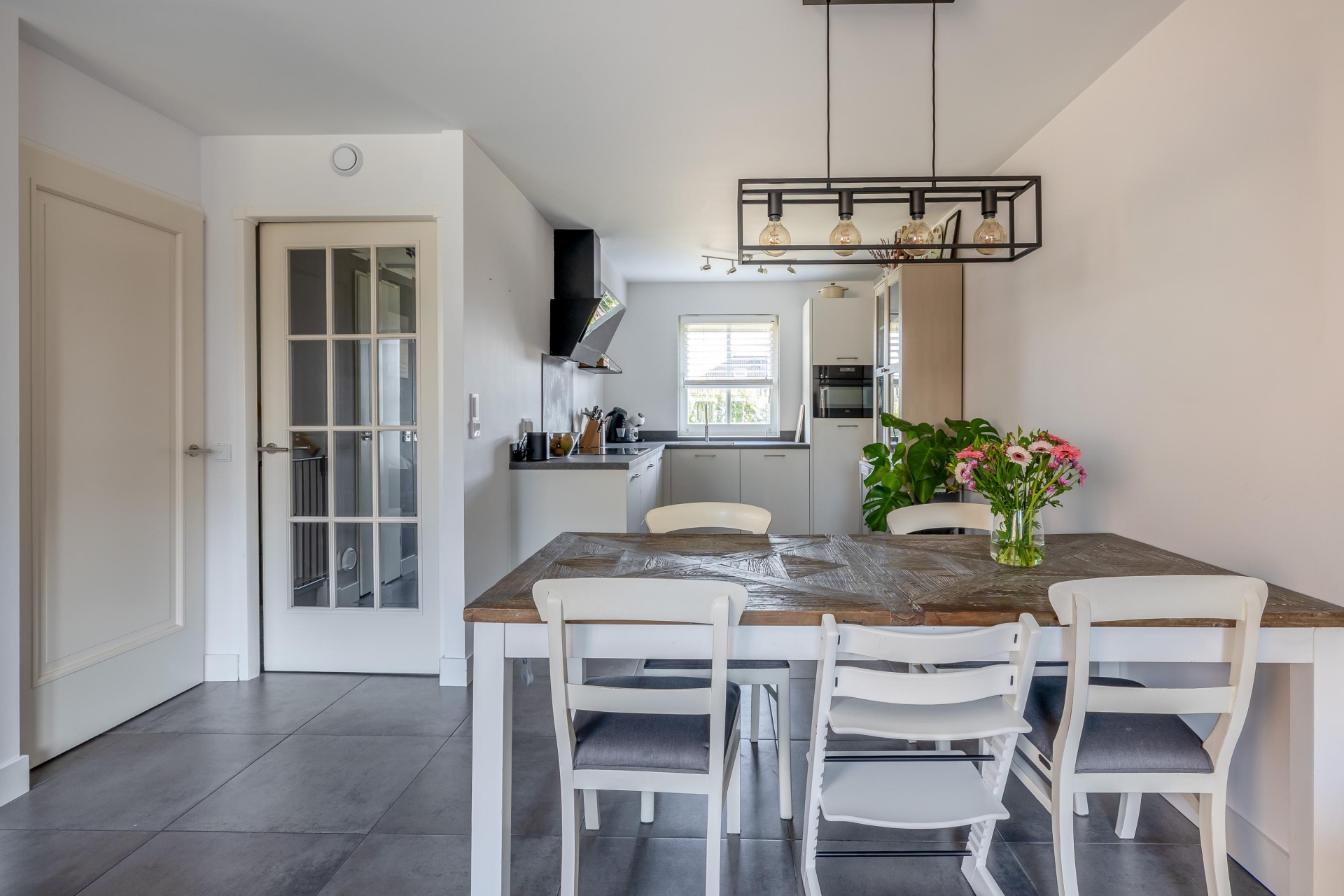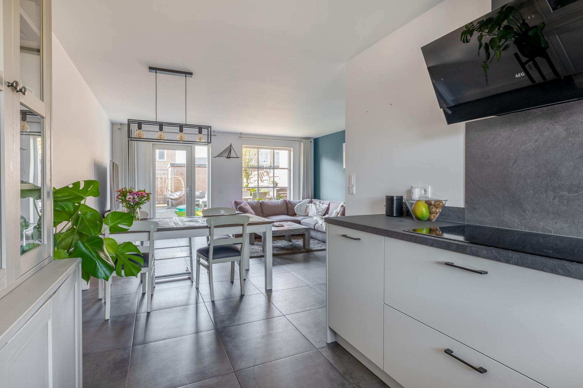Bij binnenkomst valt meteen op hoe licht de leefruimte is. De woonkamer is tuingericht en dankzij de grote raampartijen en openslaande deur naar de tuin komt het daglicht hier rijkelijk naar binnen. Er is volop ruimte voor een comfortabele zithoek en een gezellige eethoek. De afwerking is strak en neutraal, waardoor je hier eenvoudig je eigen sfeer aan kunt geven. Aan de voorzijde bevindt zich de keuken. Deze is praktisch ingericht met voldoende werk- en bergruimte en voorzien van diverse inbouwapparatuur. Vanuit het raam kijk je vrij de straat in, wat zorgt voor een prettige verbinding met buiten, en je eigen oprit.