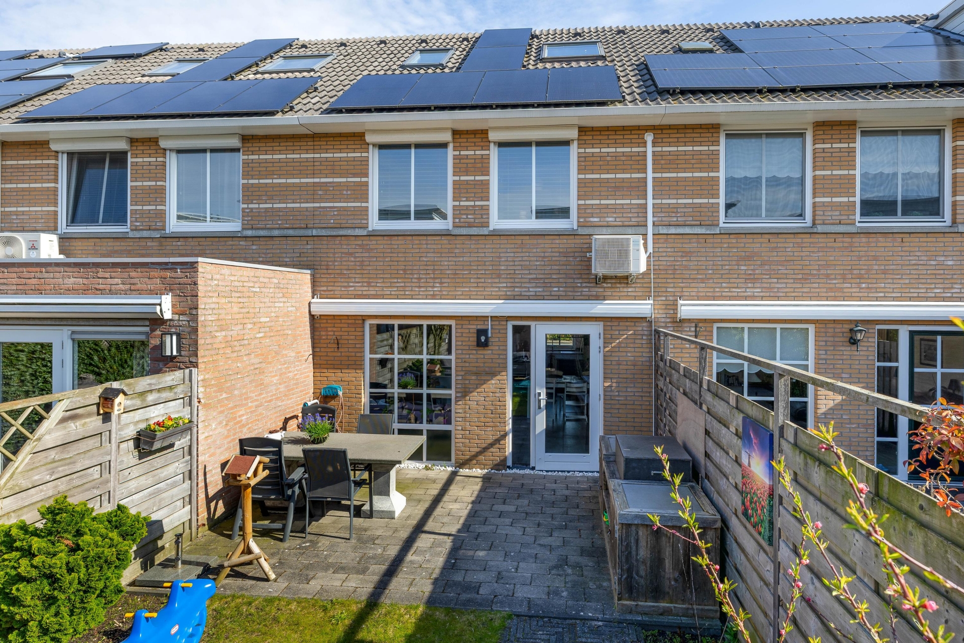 De achtertuin is gelegen op het zuiden, wat betekent dat je hier volop van de zon kunt genieten. De tuin is verzorgd aangelegd met een combinatie van groen en terras, waardoor je zowel een fijne loungeplek als ruimte voor spelende kinderen hebt. Achterin de tuin staat een stenen berging, ideaal voor fietsen en extra opslag. Via de achterom is de tuin goed bereikbaar. Wat dit huis extra aantrekkelijk maakt, zijn de duurzame voorzieningen. Met maar liefst 12 zonnepanelen profiteer je van lagere energielasten. Daarnaast is het huis goed geïsoleerd en voorzien van balansventilatie, wat bijdraagt aan een comfortabel binnenklimaat.