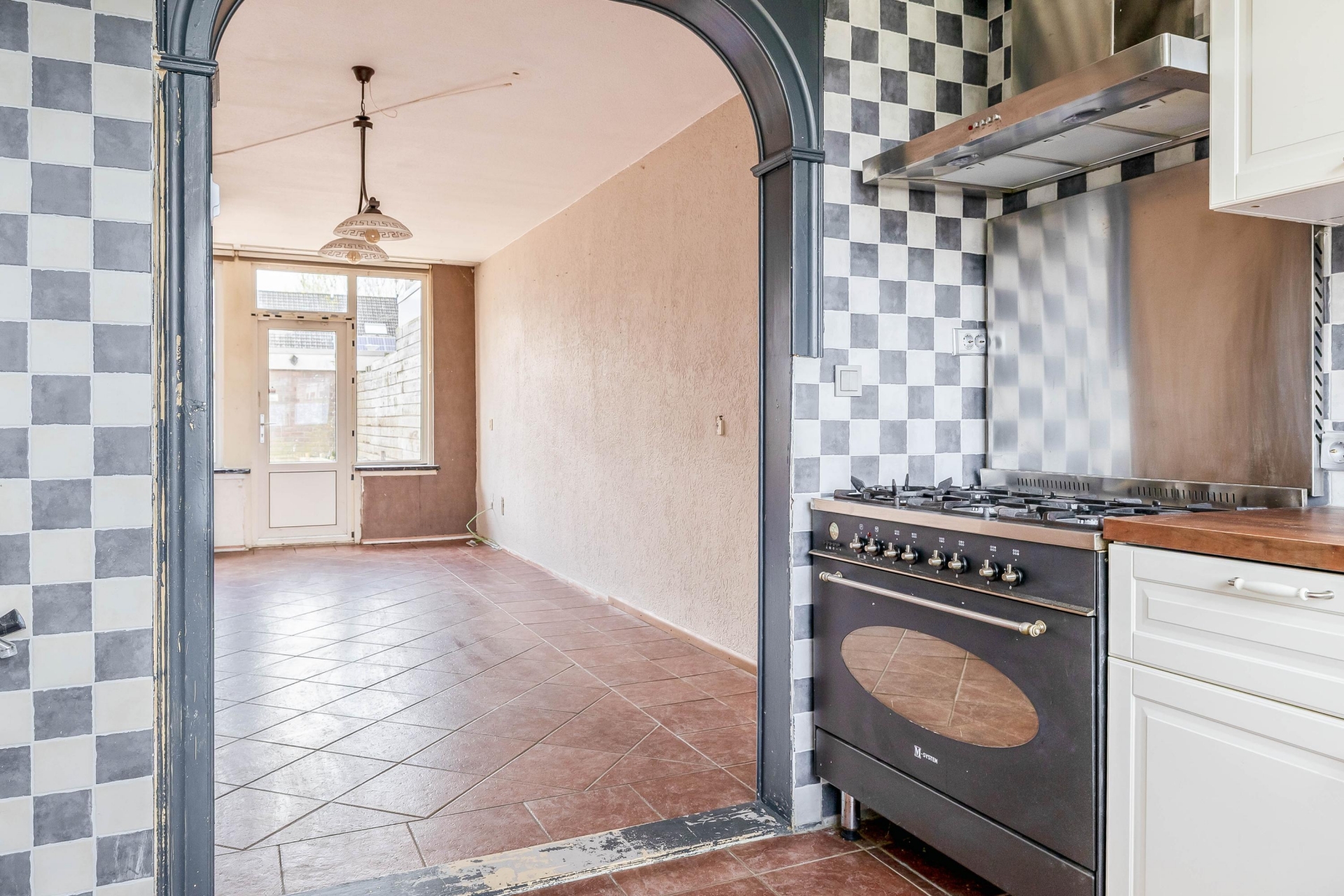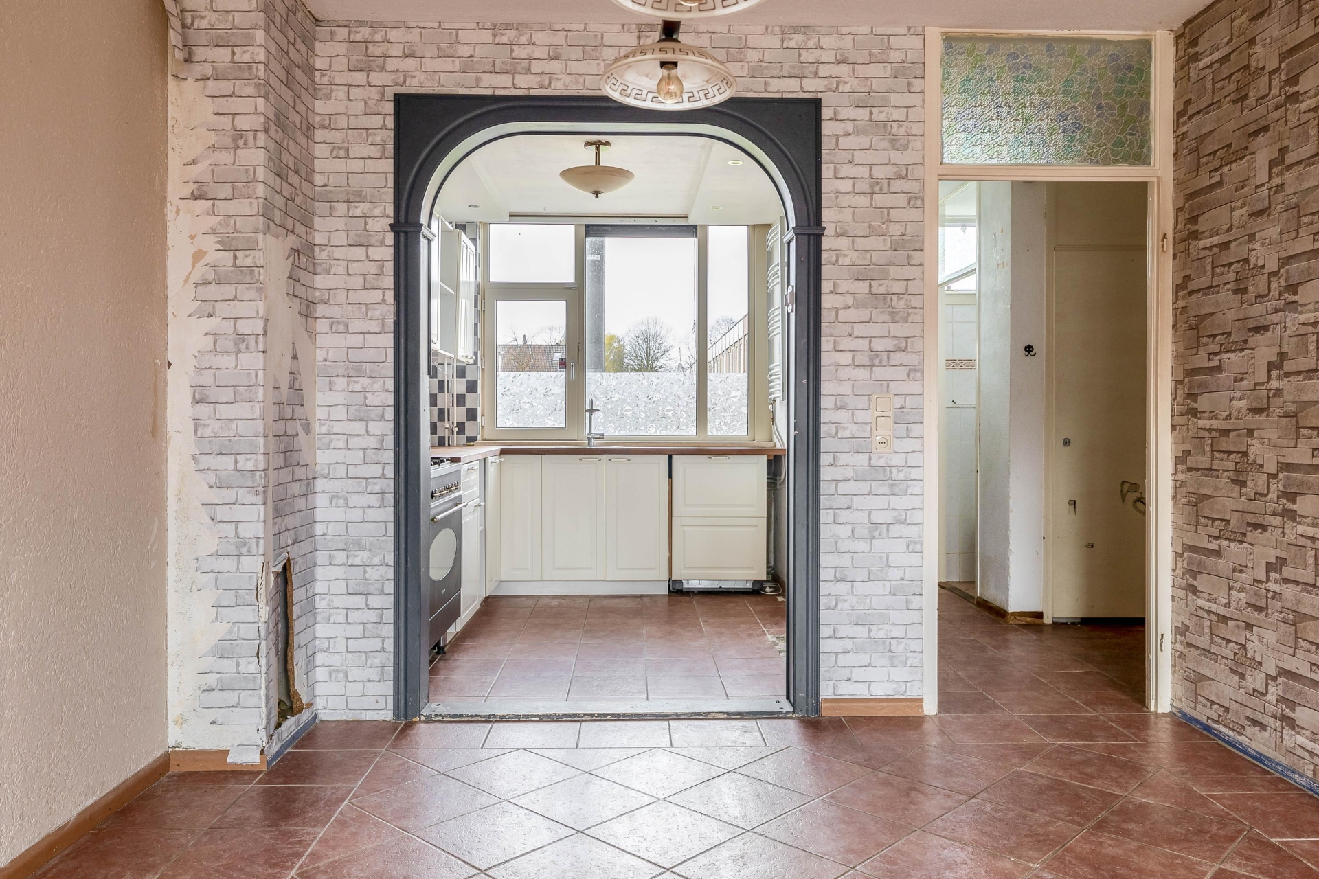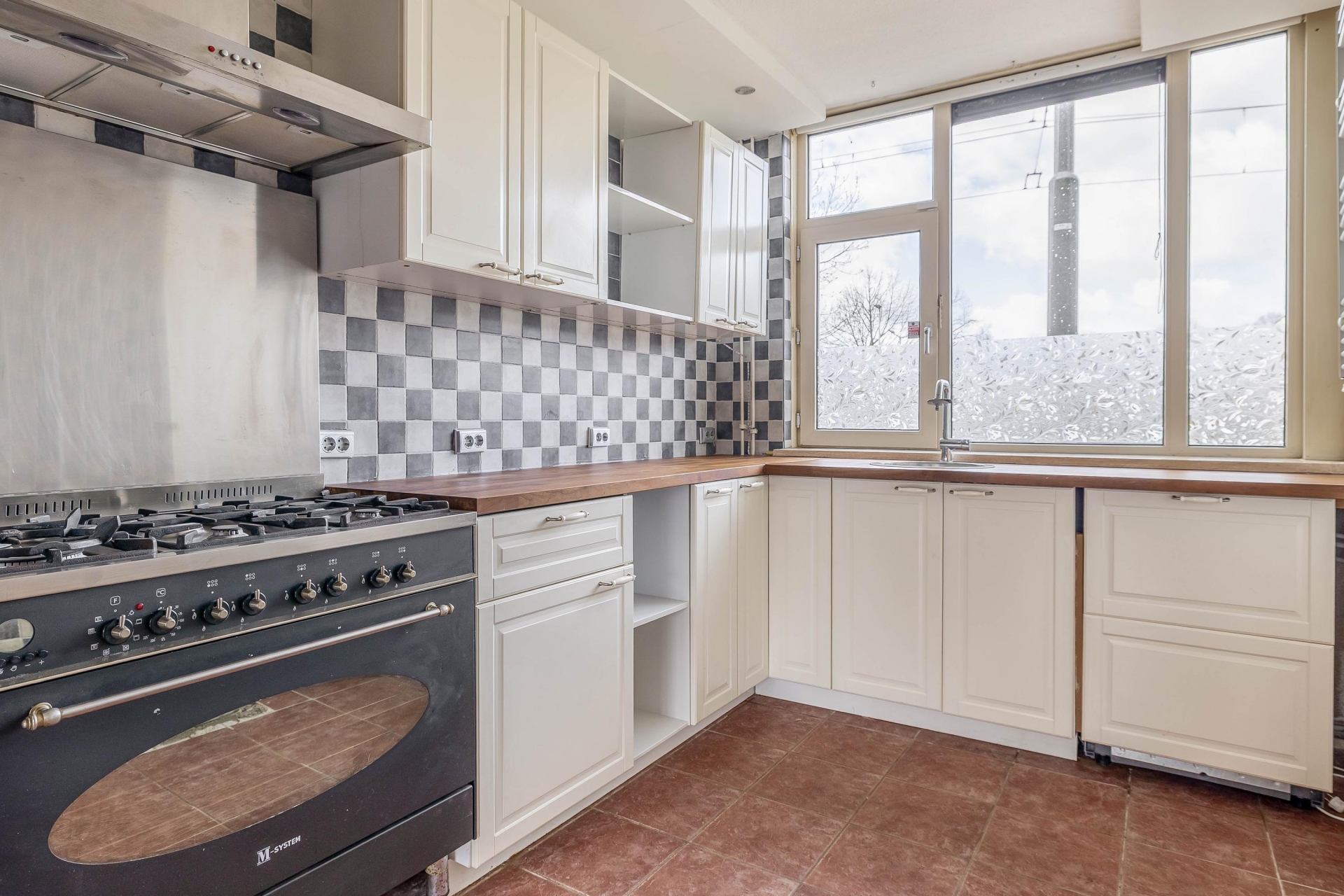 De keuken ligt aan de voorzijde en is via een open doorgang bereikbaar. Deze is netjes en functioneel ingericht, met voldoende werk- en kastruimte. Vanuit de keuken heb je leuk zicht over de straat en het groen.