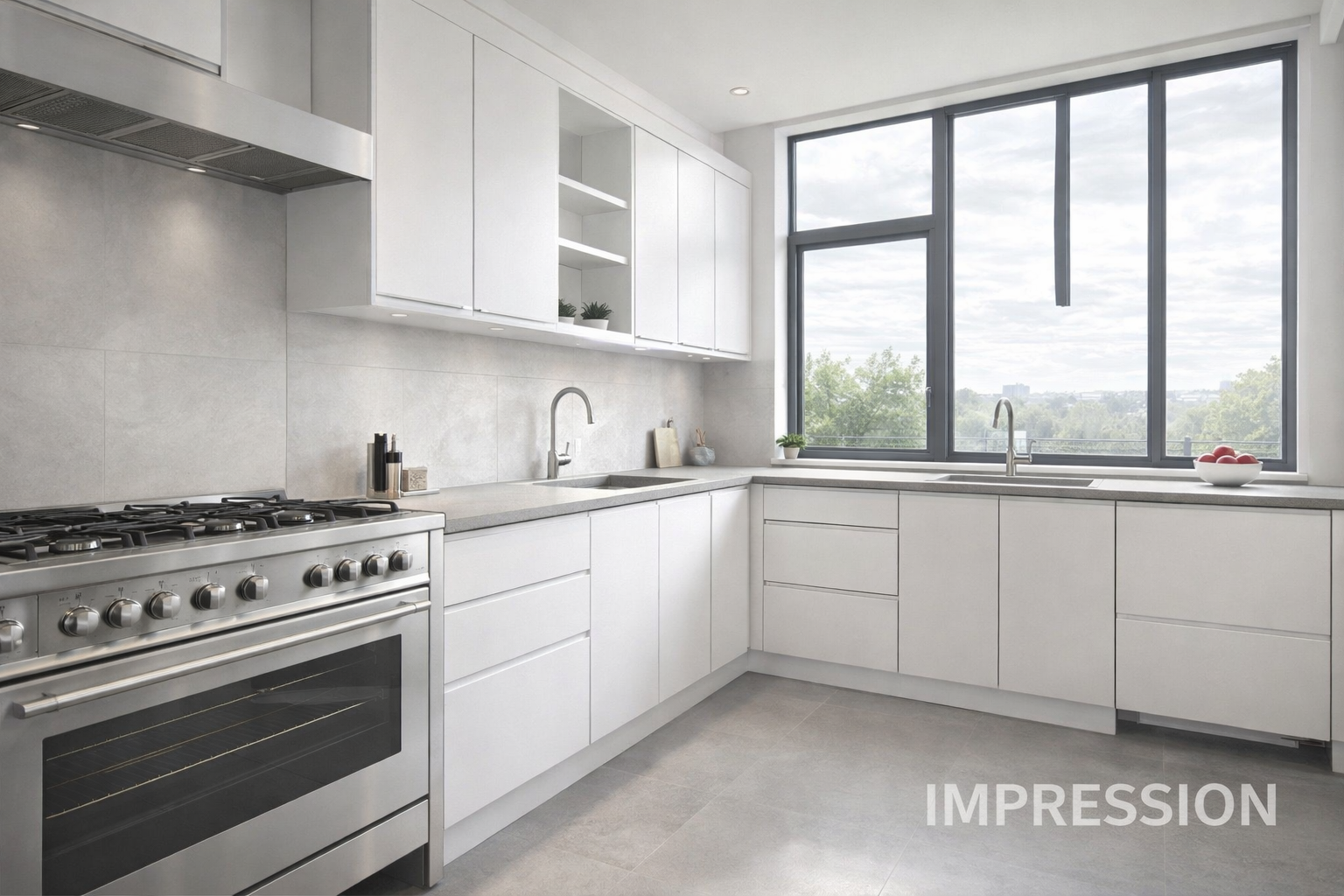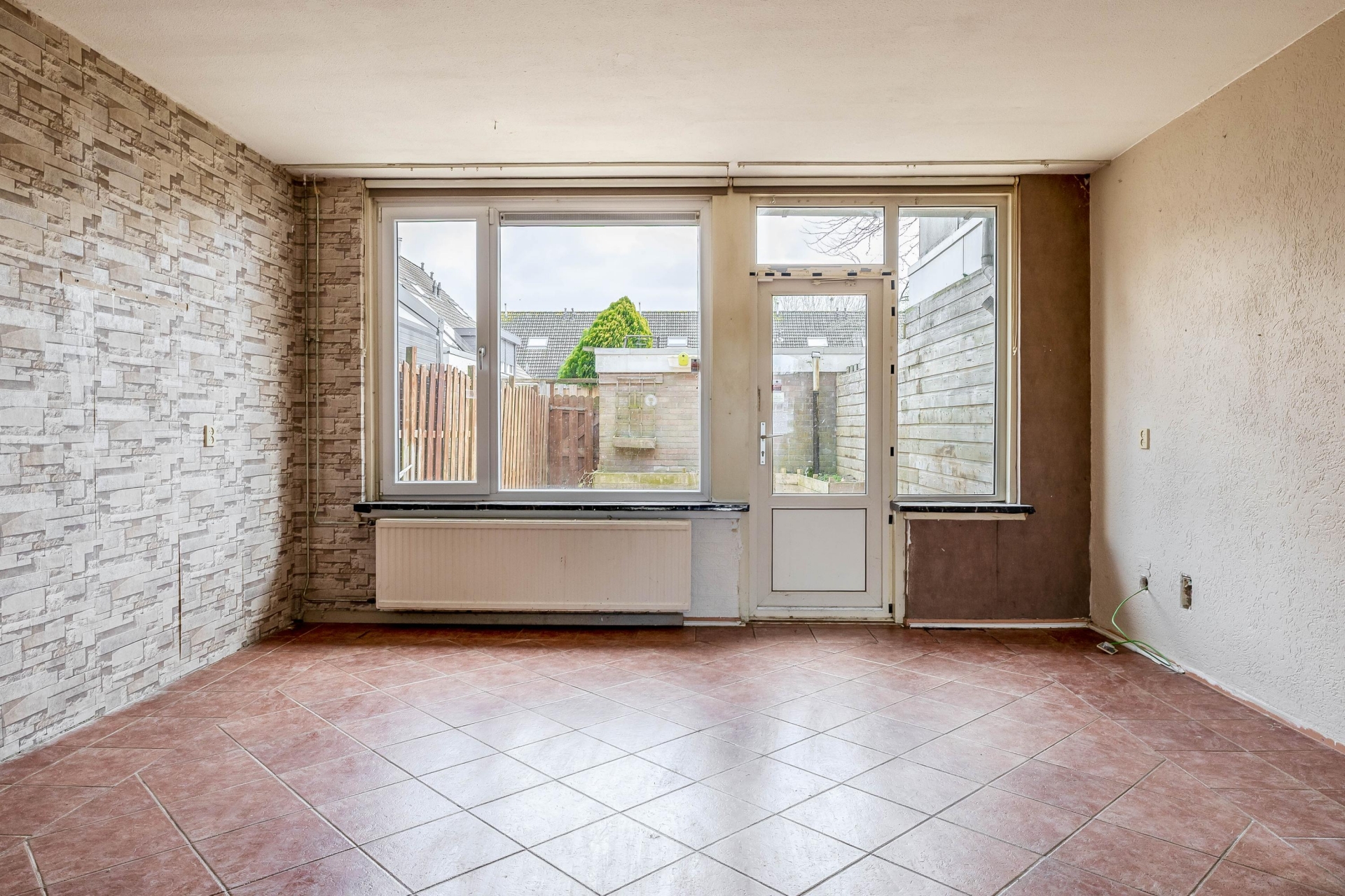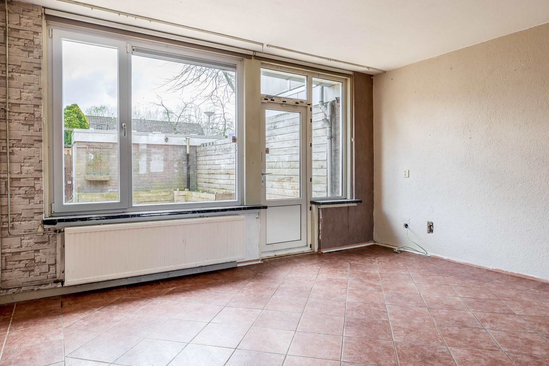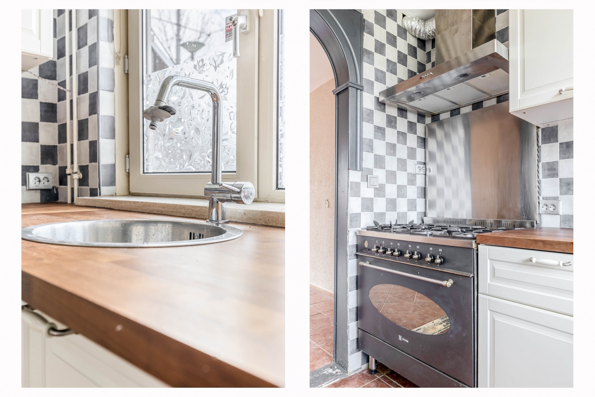 De keuken ligt aan de voorzijde en is via een open doorgang bereikbaar. Deze is netjes en functioneel ingericht, met voldoende werk- en kastruimte. Vanuit de keuken heb je leuk zicht over de straat en het groen.