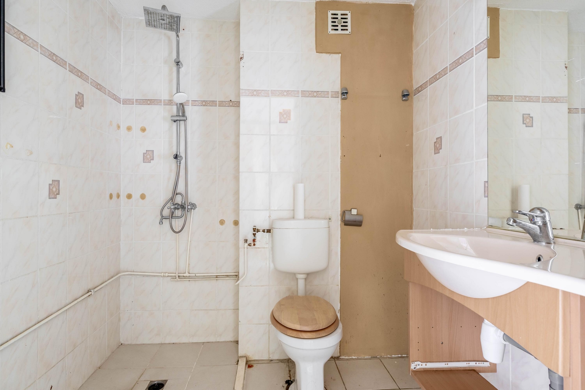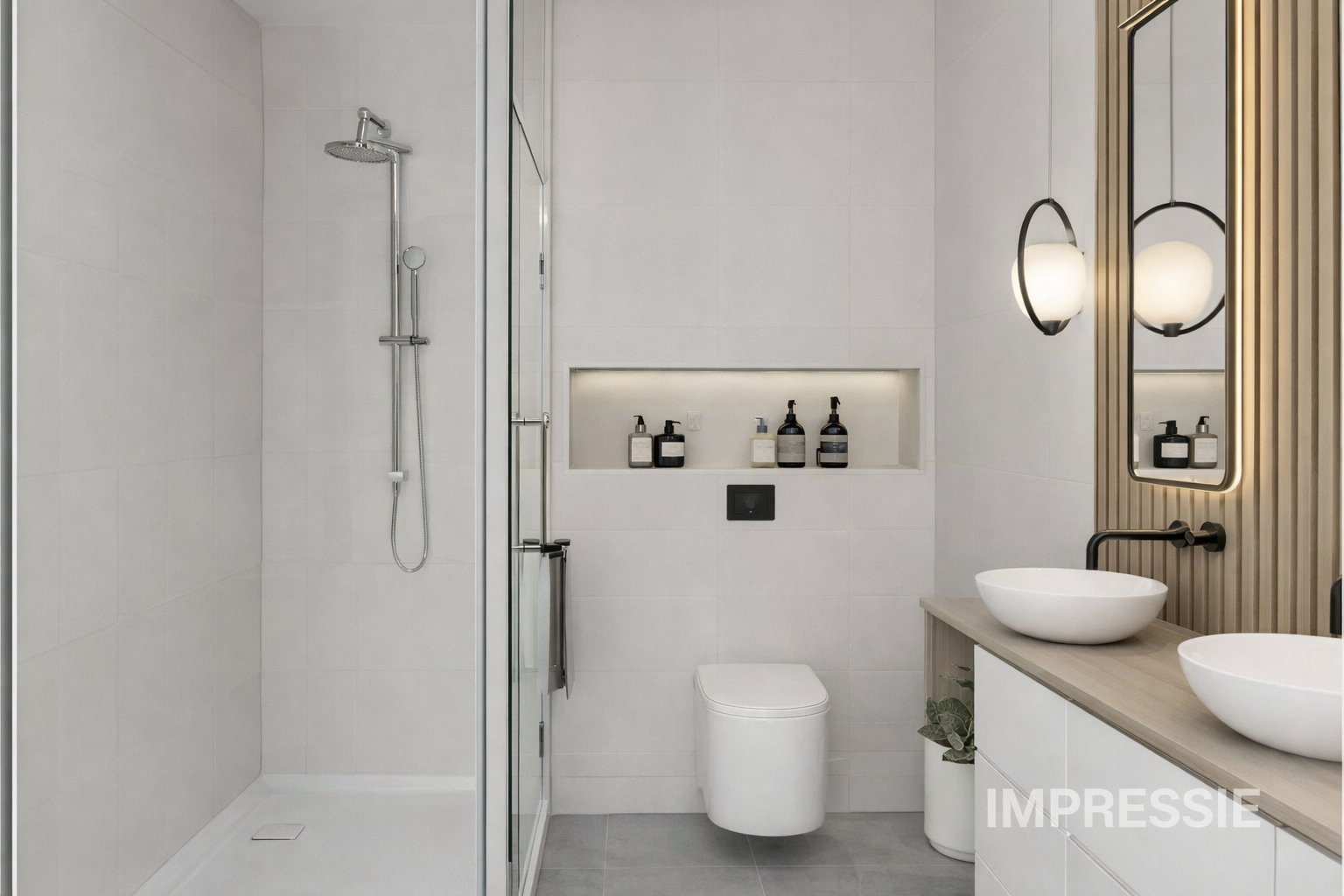 De badkamer is verzorgd en compleet ingericht met een douche, tweede toilet, wastafelmeubel en designradiator. Ook de wasmachine-aansluiting bevindt zich hier, praktisch weggewerkt.