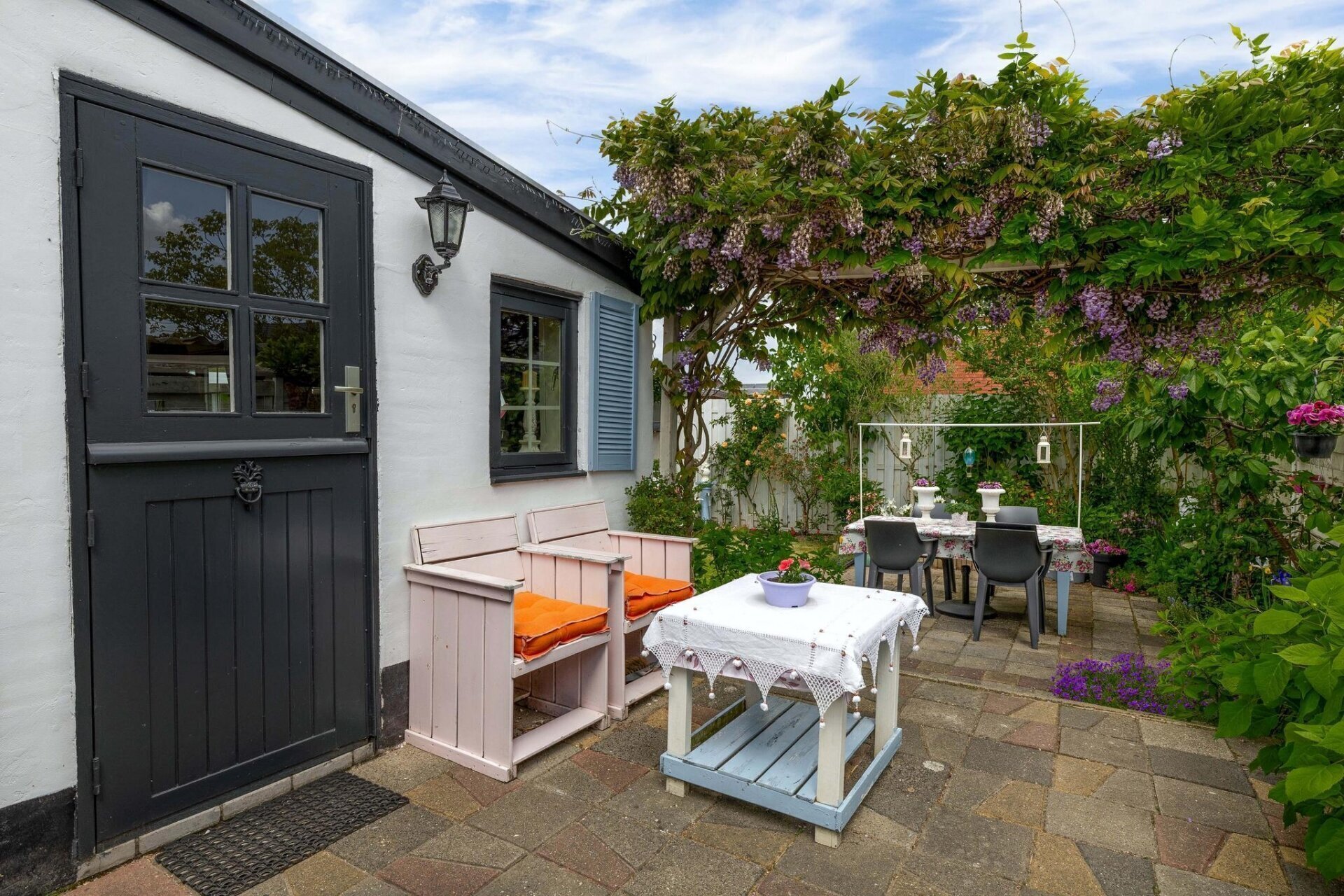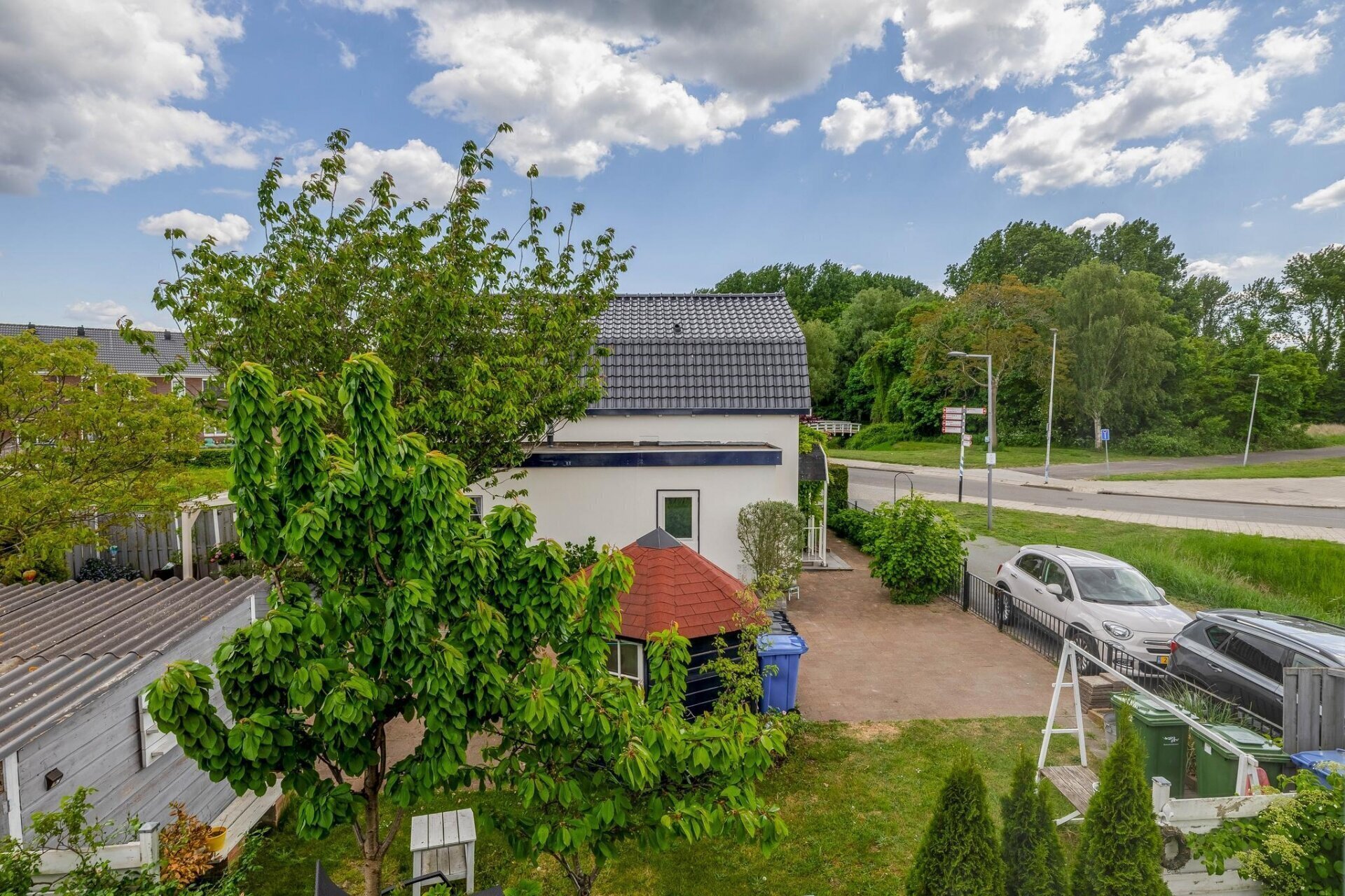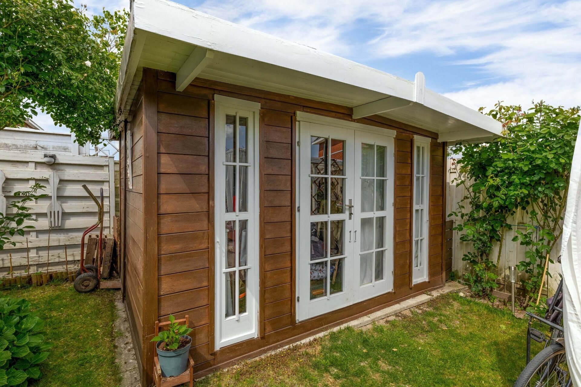 Buiten is minstens zo sfeervol als binnen. Rondom het huis ligt een verzorgde tuin met meerdere terrassen, waar je op elk moment van de dag een plekje in de zon of schaduw kunt kiezen. Dankzij de vrije ligging aan de rand van het dorp geniet je hier van rust, privacy en groen om je heen. Achterin de tuin staat een vrijstaande houten berging van ca. 10 m² – handig voor je fietsen, gereedschap of als werkruimte.