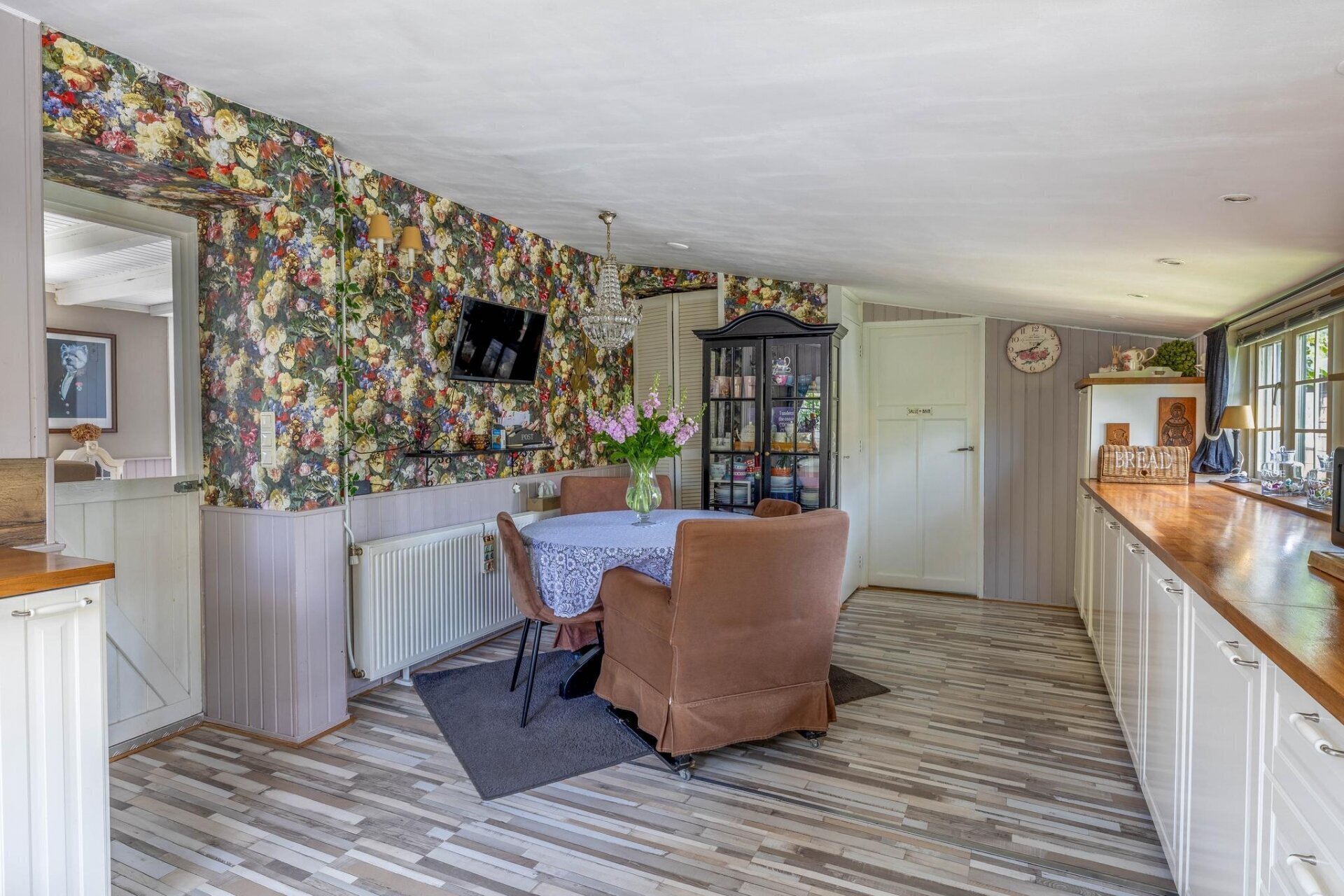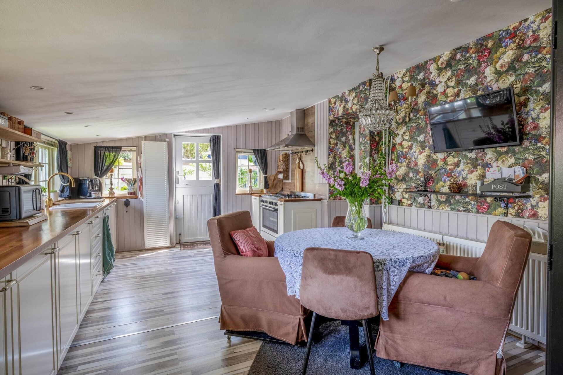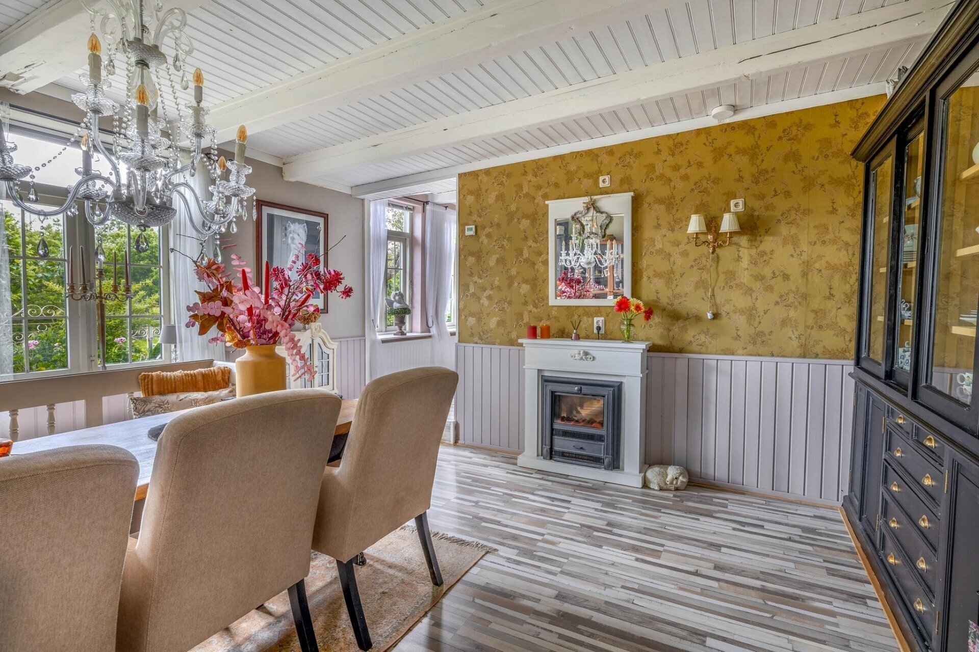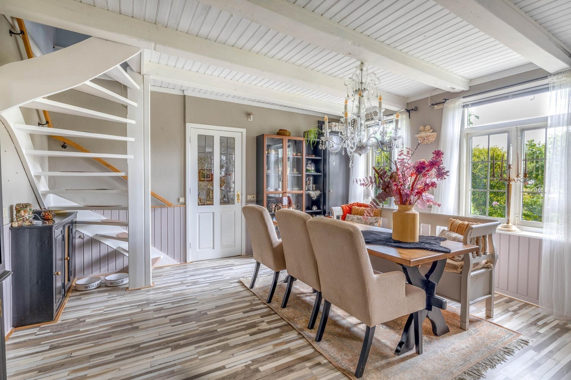 Zodra je de woonkamer binnenstapt, voel je direct de charme van dit huis. Authentieke elementen zoals het balkenplafond en de gezellige raampartijen geven de ruimte karakter, terwijl de lichte afwerking en het zicht op het groen zorgen voor rust. De eetkamer grenst aan de woonkamer en is perfect voor lange avonden tafelen met vrienden of familie. Alles is met elkaar verbonden, maar toch voelt elke ruimte op zichzelf fijn aan.